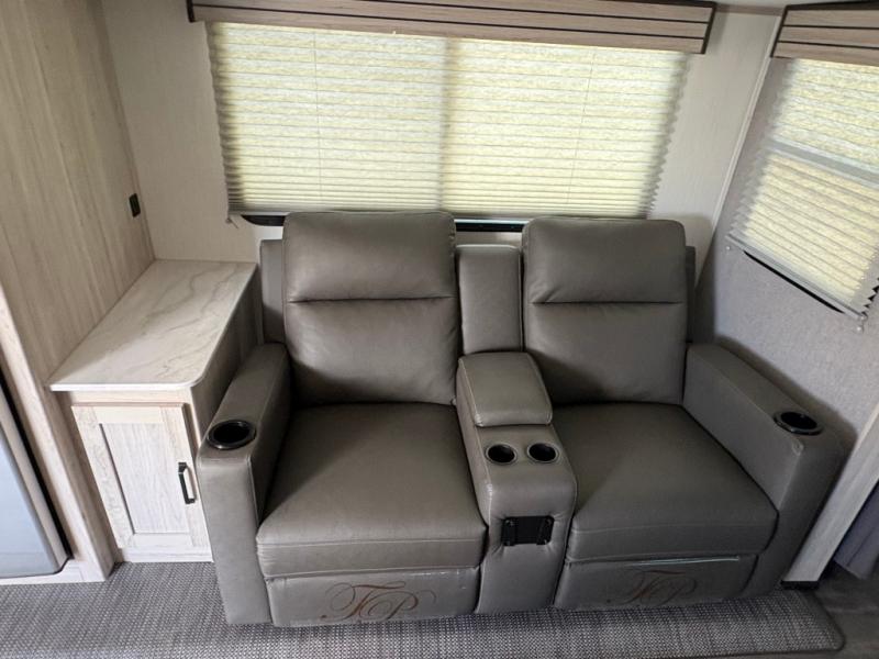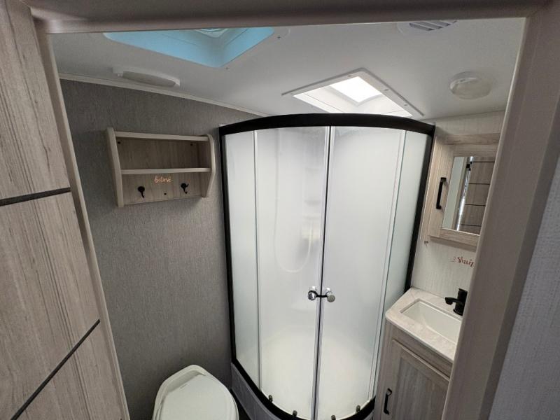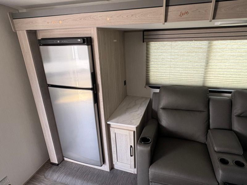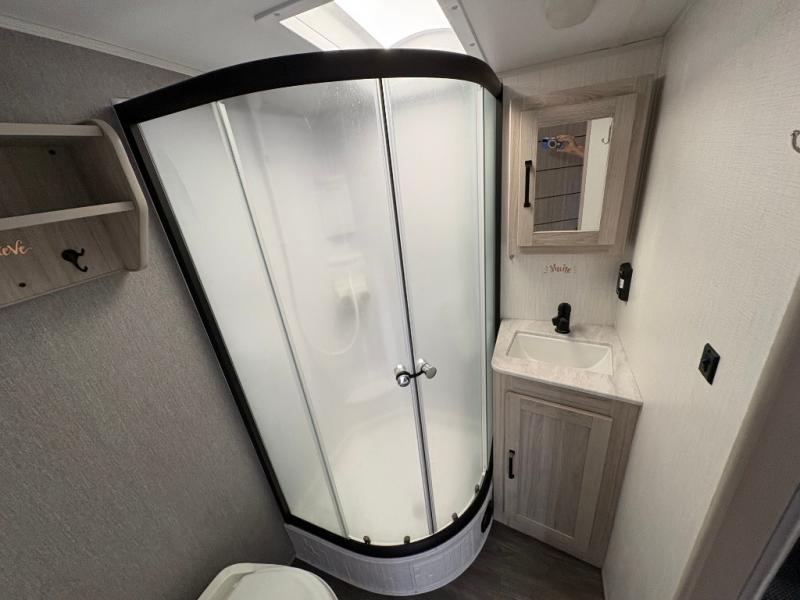 You won't want to camp any other way once you step inside this travel trailer! It features a queen bed with wardrobes on either side to store your clothes. When you aren't using the U-shaped dinette to enjoy a meal or play a card game, you can transform it into an extra sleeping space for a guest or two depending on their size. The seamless edge countertops have an enhanced durability and the 10.7 cu. ft. refrigerator will keep your perishables nice and fresh. Freshen up each morning with the radius shower in the rear corner bathroom!