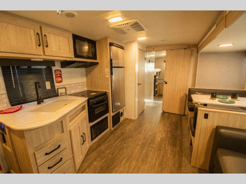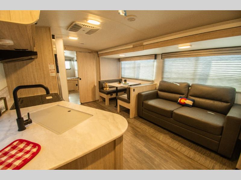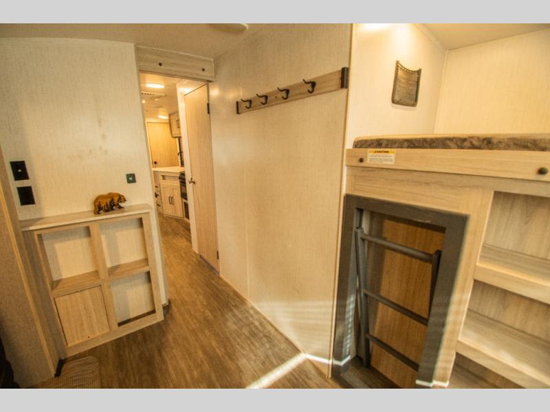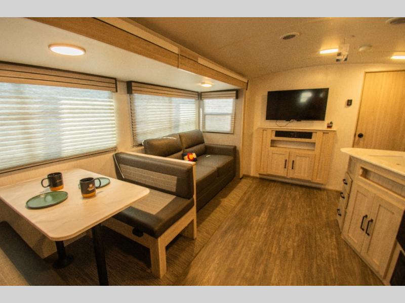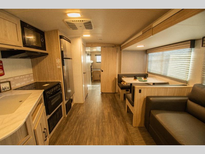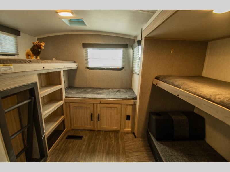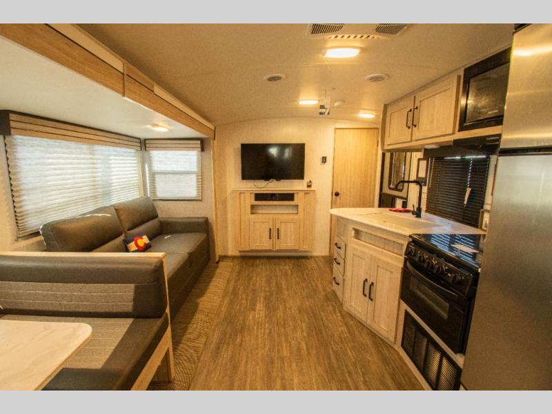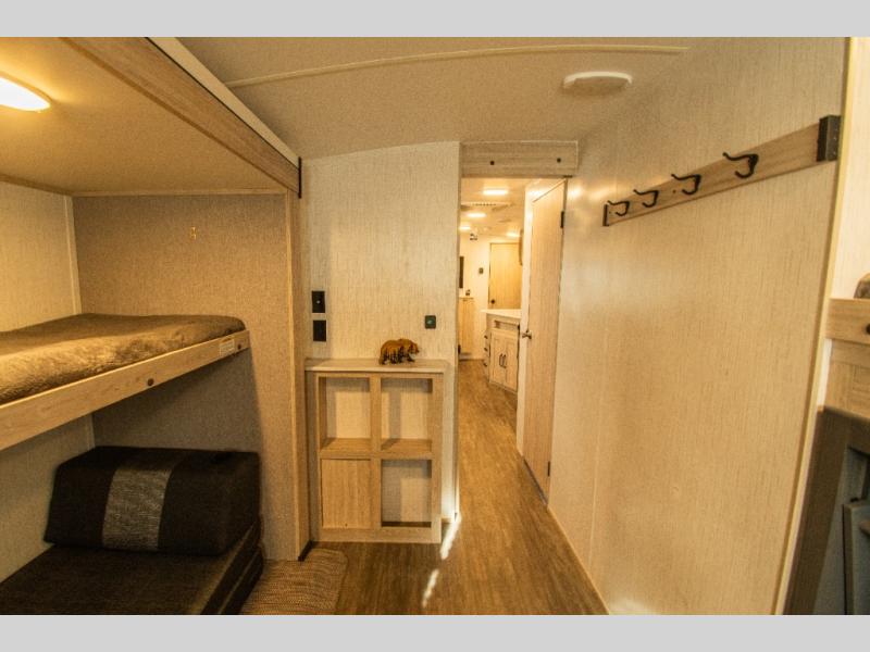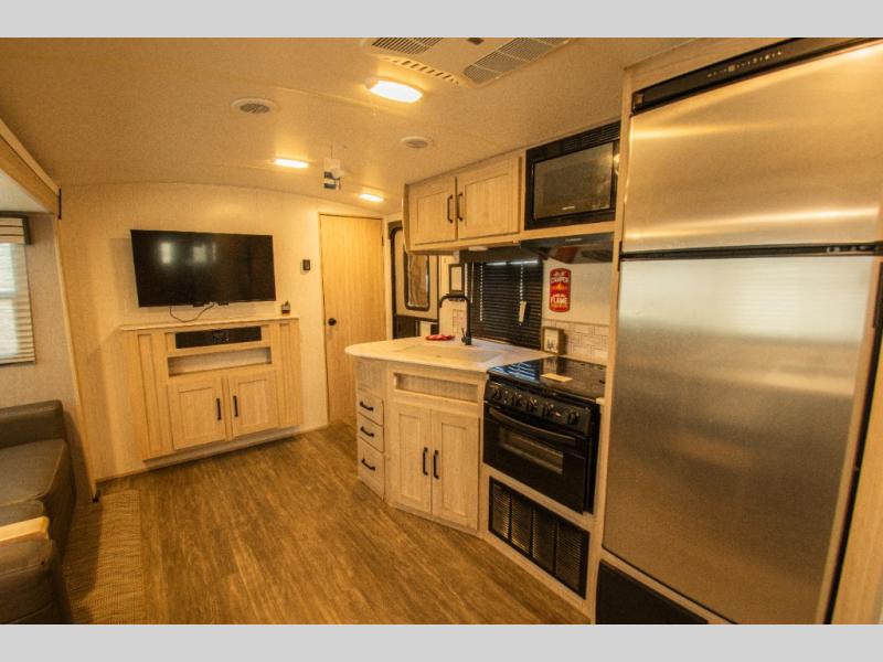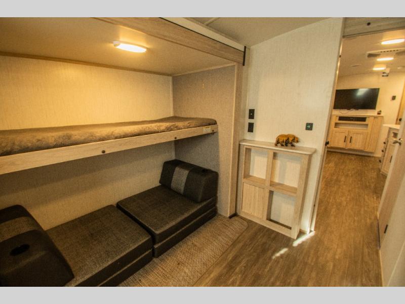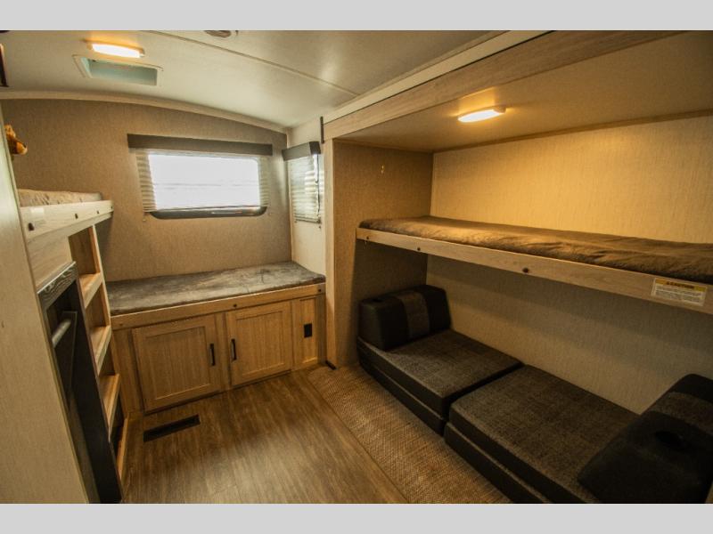 Dual entry doors are just one of the many conveniences you will love about this travel trailer! The rear private bunkhouse has a bunk above an entertainment center, another bunk bed, and a flip-up bunk above a folding futon. The front private bedroom offers a comfortable place for you to get a good night's rest on the queen bed. After a fun day at the beach, you can relax at the sofa and booth dinette slide while the chef prepares dinner with the three burner cooktop or everyone can head outdoors for the chef to cook at the outside kitchen. The full bathroom has a full shower to freshen up in and an entrance/exit door so you can get back to having fun fast!