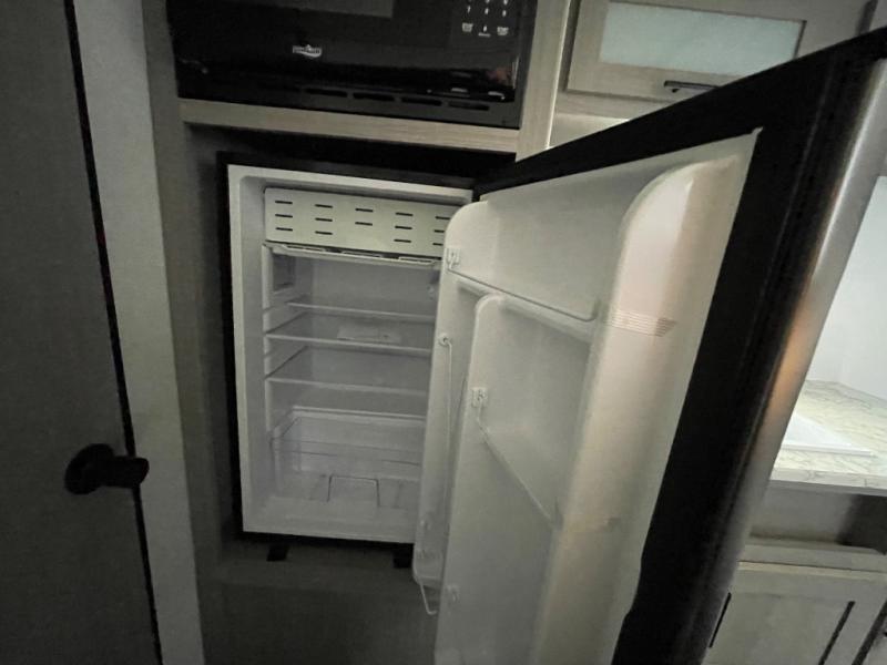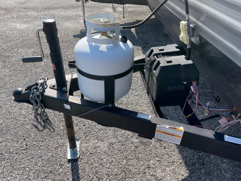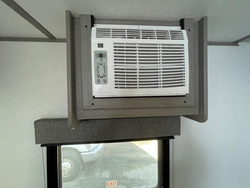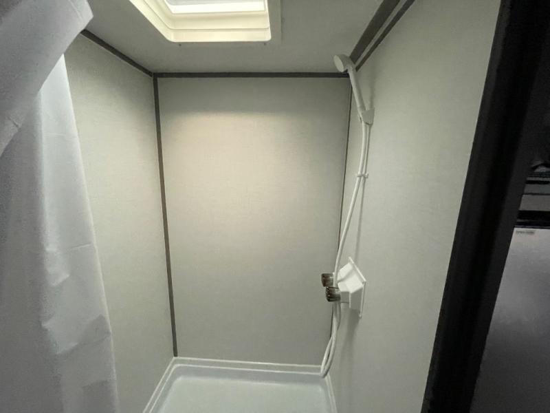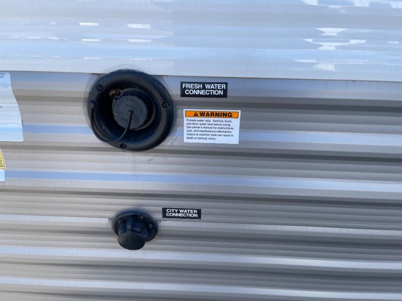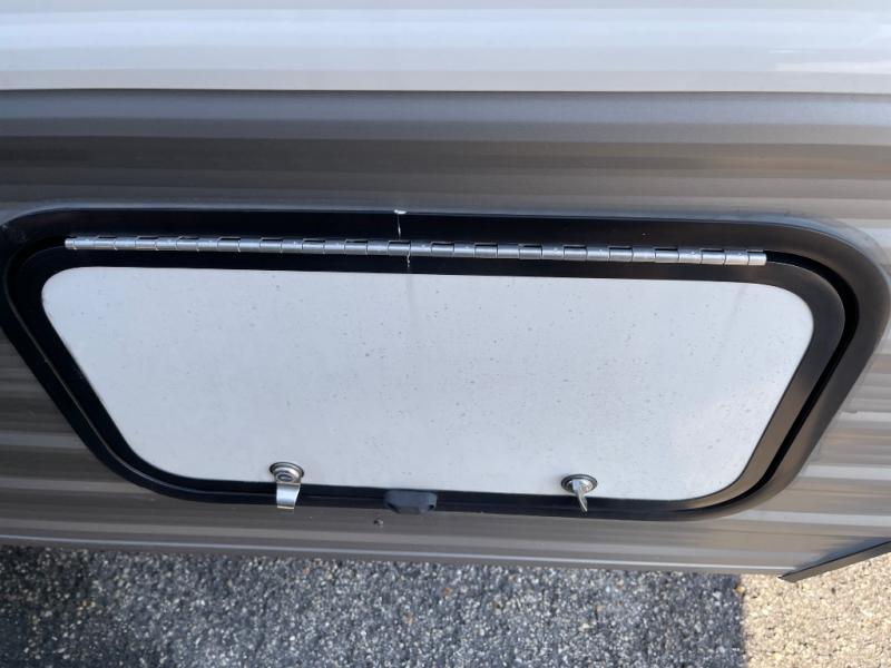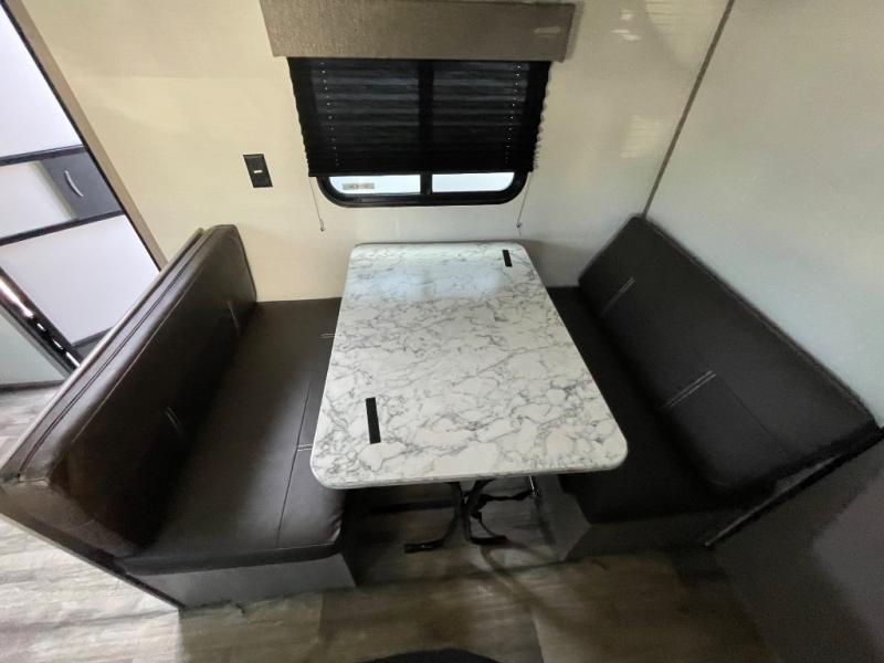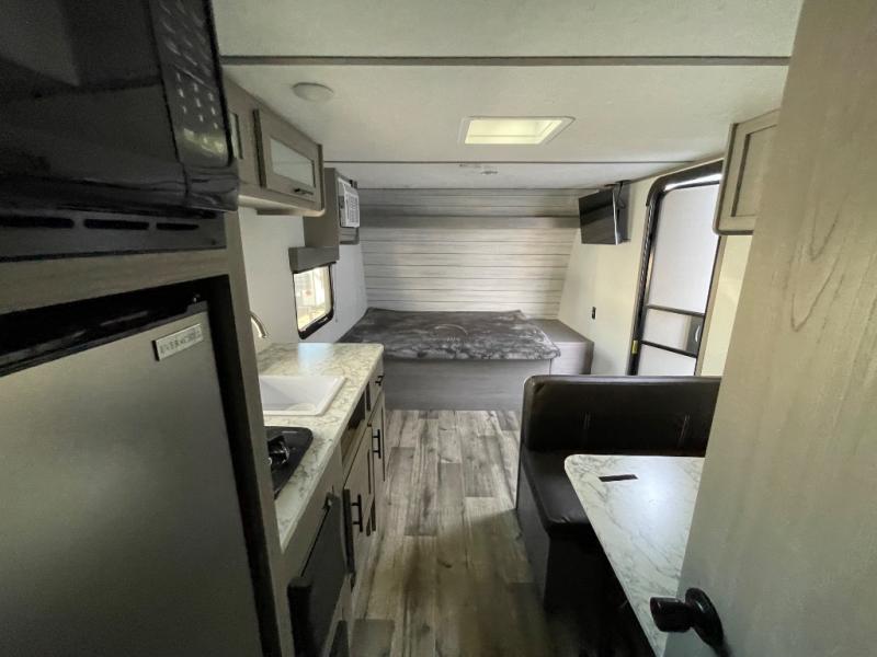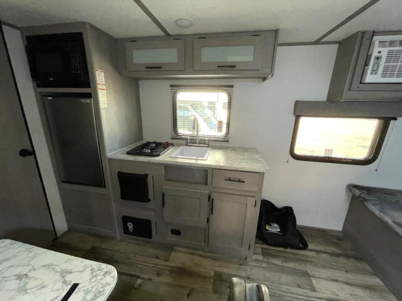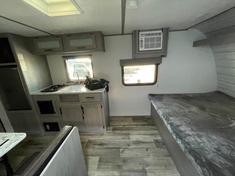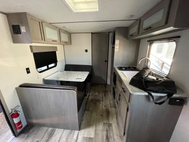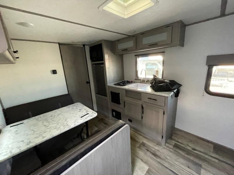A perfect couples coach that could sleep one or two more, depending on size, using the booth dinette which can be converted at night This unit is cozy and convenient providing you just what you need to enjoy a little adventure away from home. For meals, there is a two burner cooktop and sink, plus a 3.3 cu. ft. refrigerator for your perishables. Overhead cabinetry can be found along both sides for your dishes and things. You will all appreciate the convenience of having your own private shower and toilet so that you don't need to use the campground facilities at night. You will also enjoy spending time outside with an 8' awning to provide even more living space outdoors!