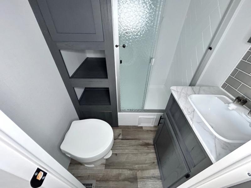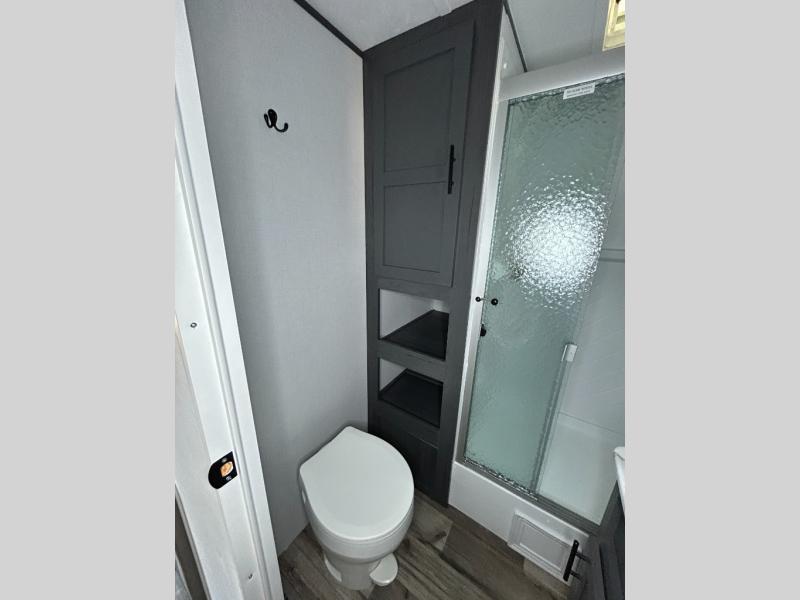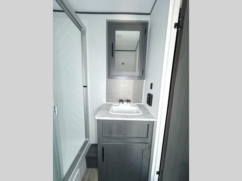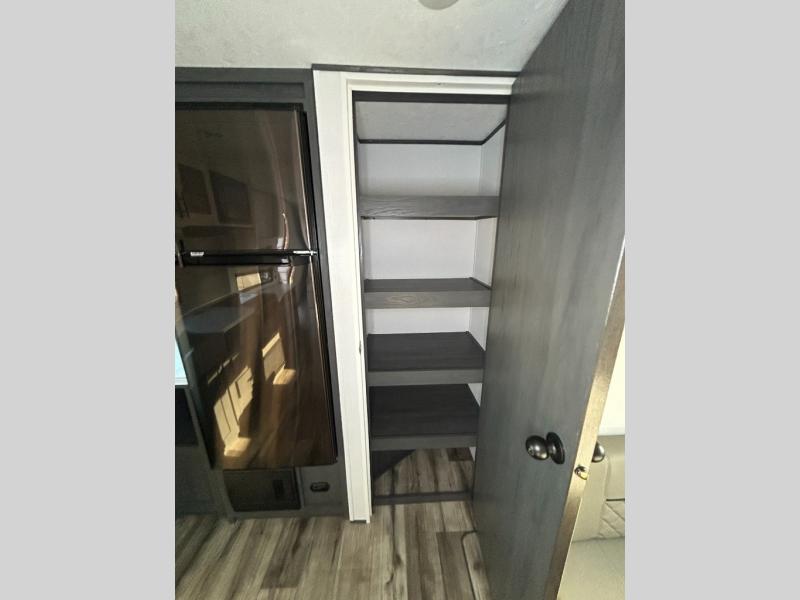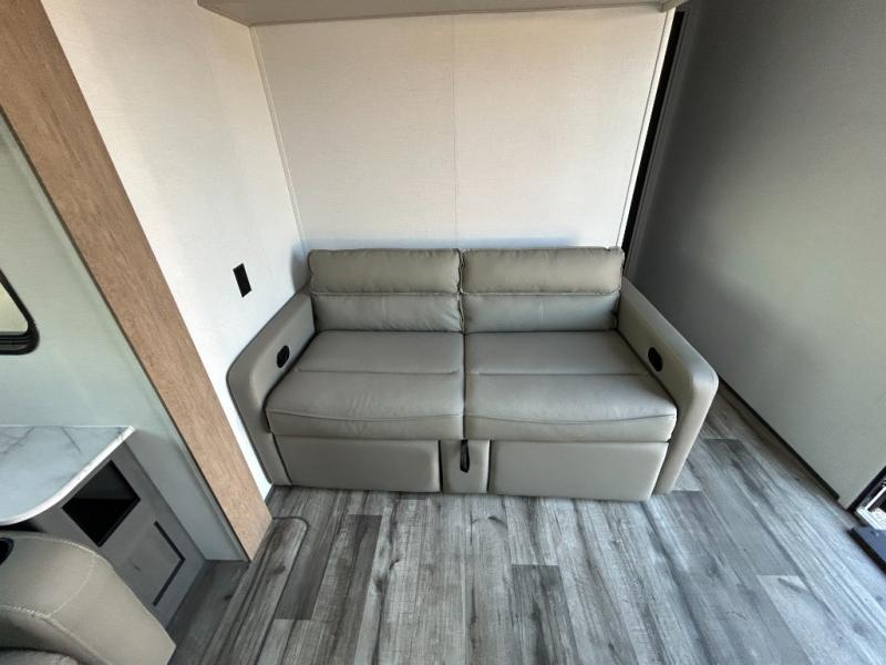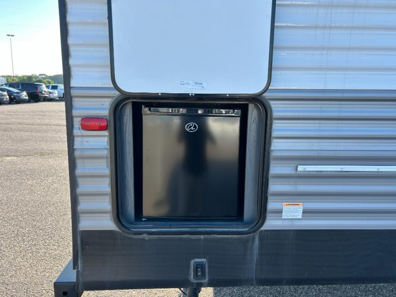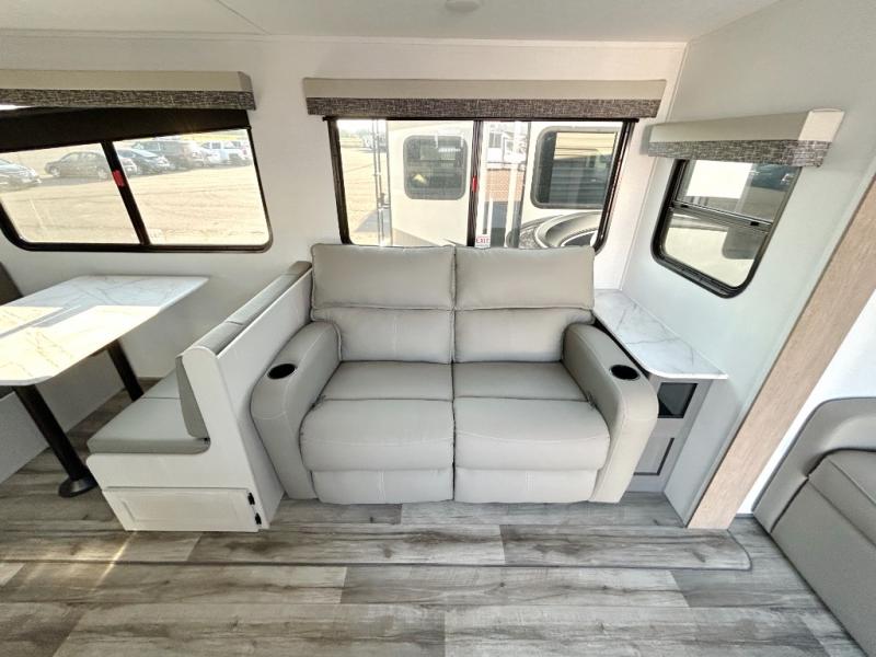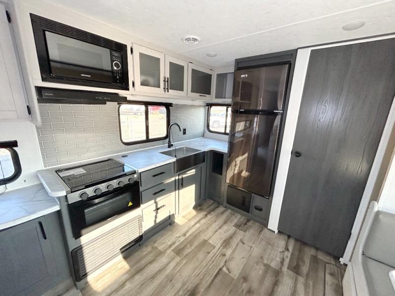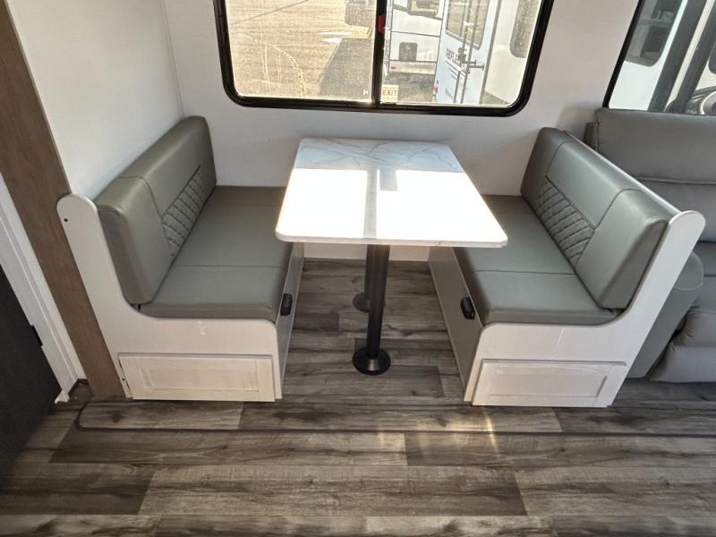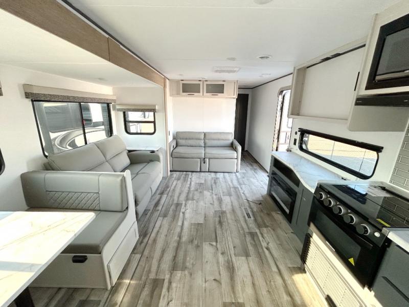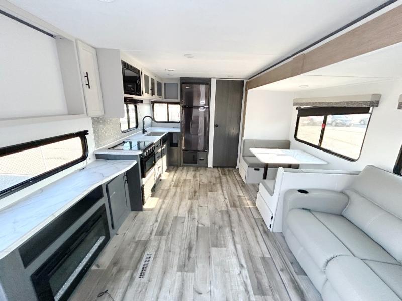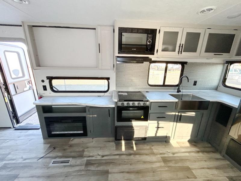 This spacious travel trailer is ready to head to the campground whenever you are! The chef will enjoy cooking in the rear kitchen with the three burner range with oven and glass cover, the stainless steel single bowl farm sink for easy clean up and the 10 cu. ft. 12V refrigerator if there happens to be any leftovers. You can enjoy your meals at the booth dinette then let your stomach settle while you relax on either the theater seating or the jackknife sofa with footrest by the entertainment center with a fireplace. The full bathroom has a shower with a skylight to freshen up in each morning and a linen closet to keep your towels close. Get a good night's rest each night on the residential queen bed slide in the front private bedroom and store all of your clothes neatly in the front large wardrobe and dresser!