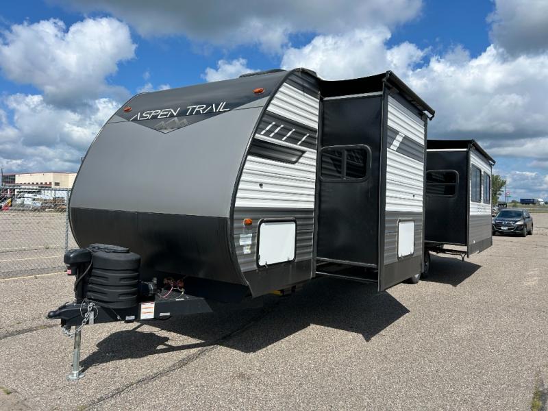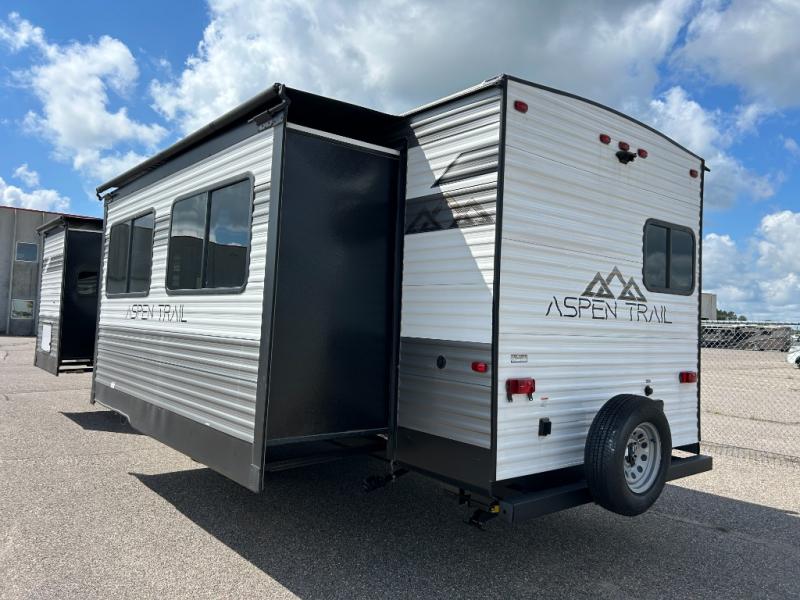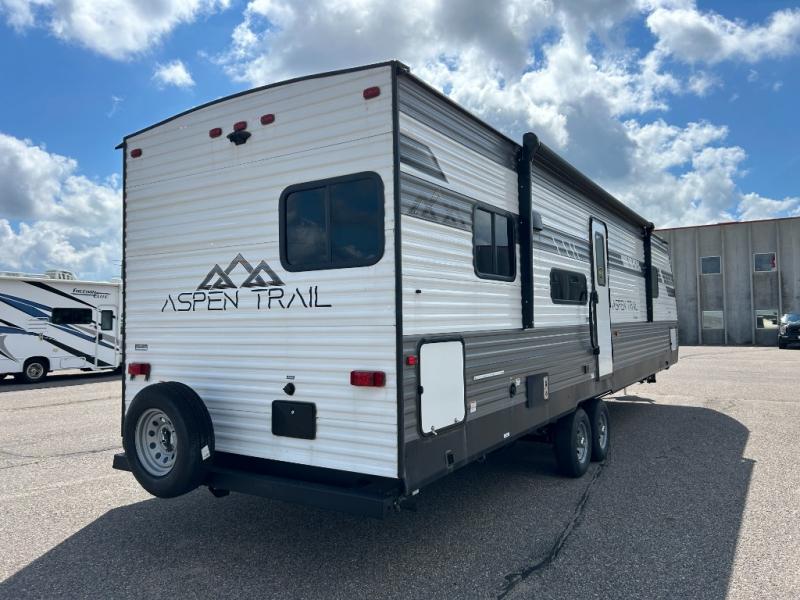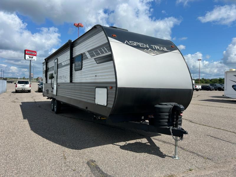 You will find more standard features and more value in each one of these Dutchmen RV Aspen Trail travel trailers! There is a smooth metal front end, diamond plate rock guard, backup camera prep, plus many more exterior features. Experience all of the power with power stabilizers, a power awning, and a power tongue jack for easy setting up and breaking down. The heated and enclosed underbelly provides an extra layer of protection for your unit's vitals so you can camp further into the year. With aluminum steps at the main entry, you will have a solid platform of stability as you enter and exit, plus they are easy to expand or store away. Inside, you'll love the look of the Home Series interior design collection and designer upholstered window valances, plus there is upgraded residential flooring that is easy to keep clean!