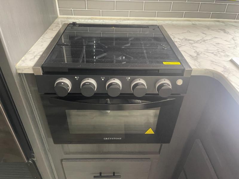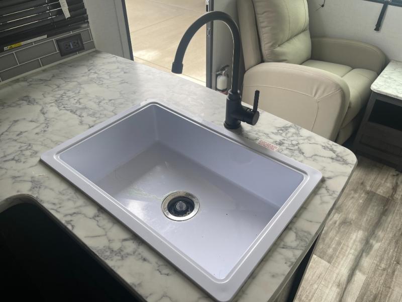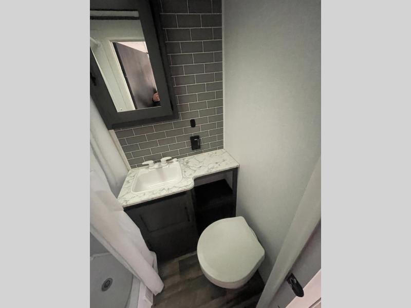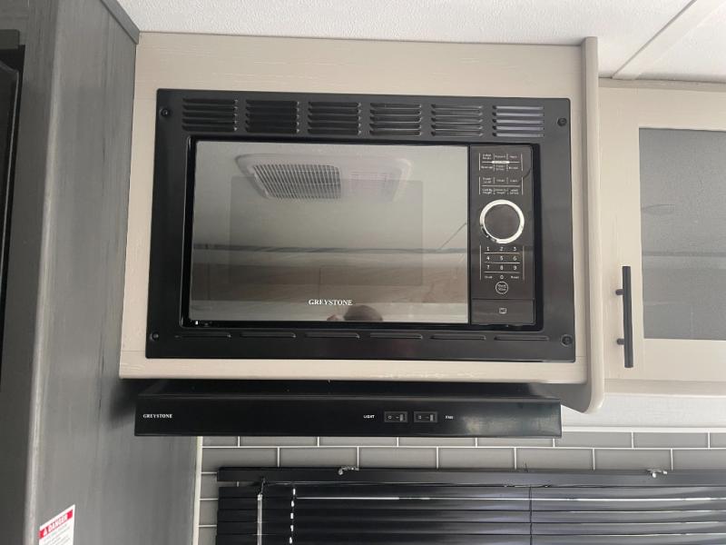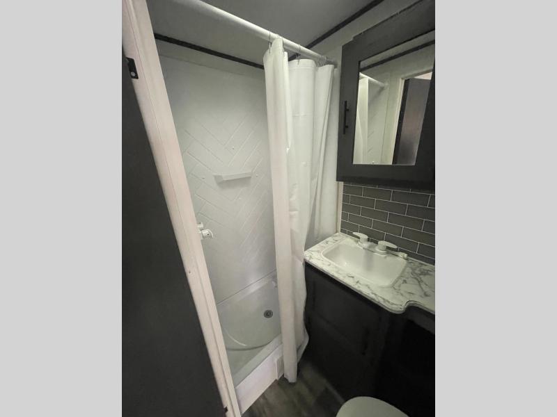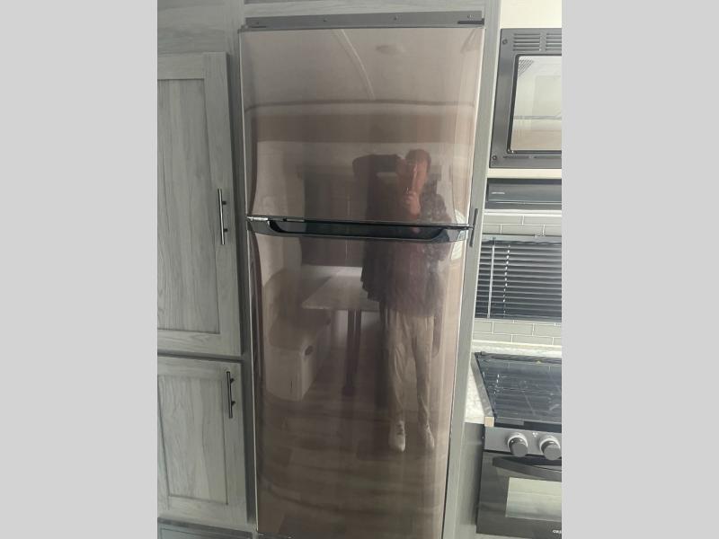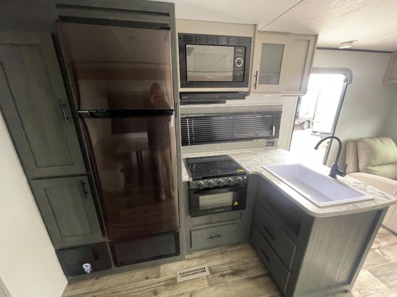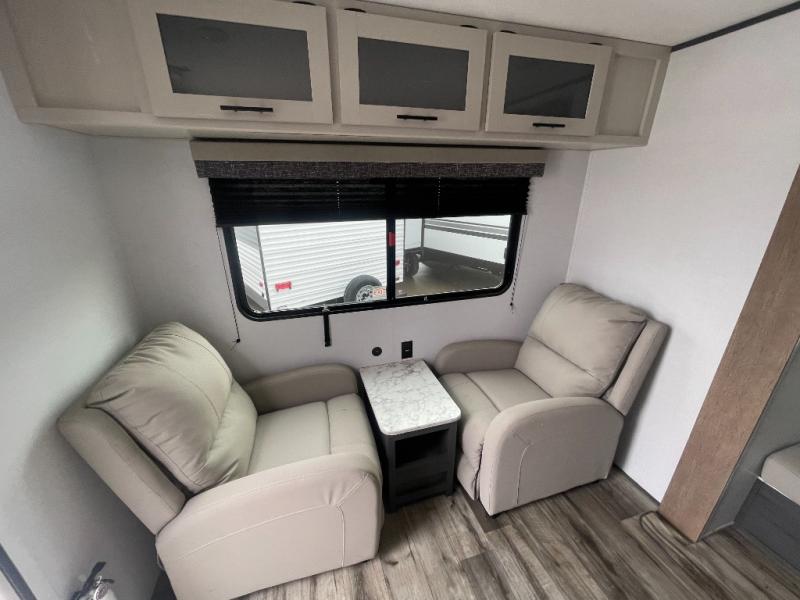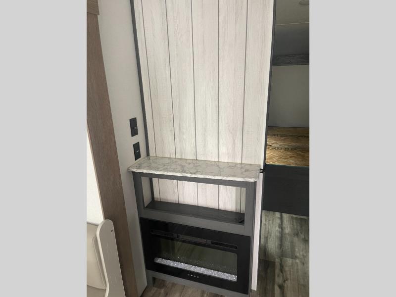 With dual entry doors, you can easily enter and exit this travel trailer! The jackknife sofa with footrest and booth dinette are next to each other near the fireplace, as well as two rear recliners allowing you to visit with other RVers or your family. The cook will have an oven and a microwave to make meals, and a 10 cu. ft. 12V refrigerator for cold items, plus a galley sink with high rise faucet to keep the dishes clean. Speaking of being clean, the full bathroom offers a shower with exhaust fan to eliminate unwanted steam as you clean yourself up after a fun day at the beach. The front private bedroom has a residential queen bed and one of the entrance/exit doors so you can slip out for an early morning fishing trip!