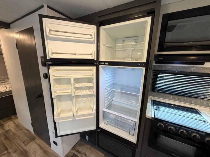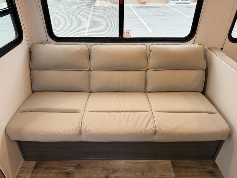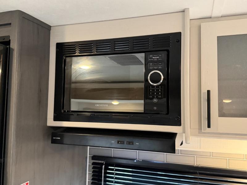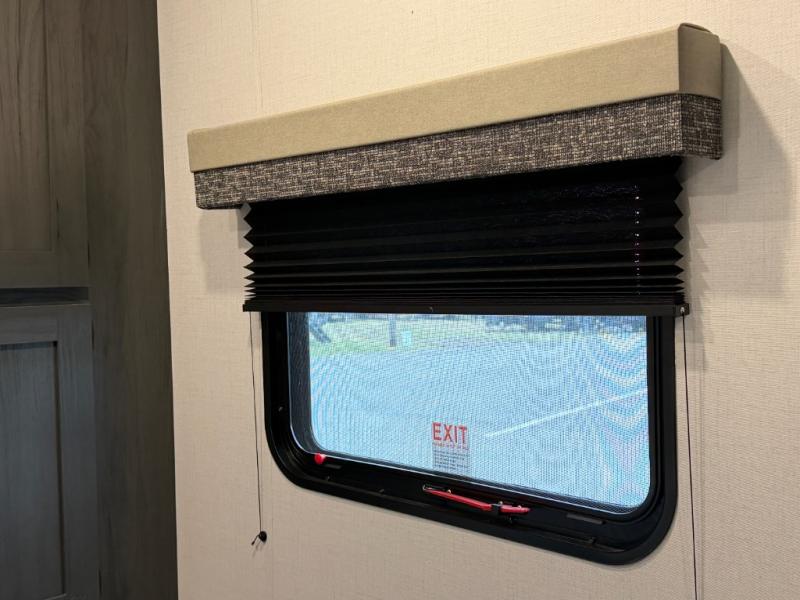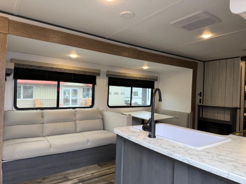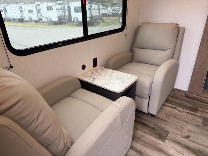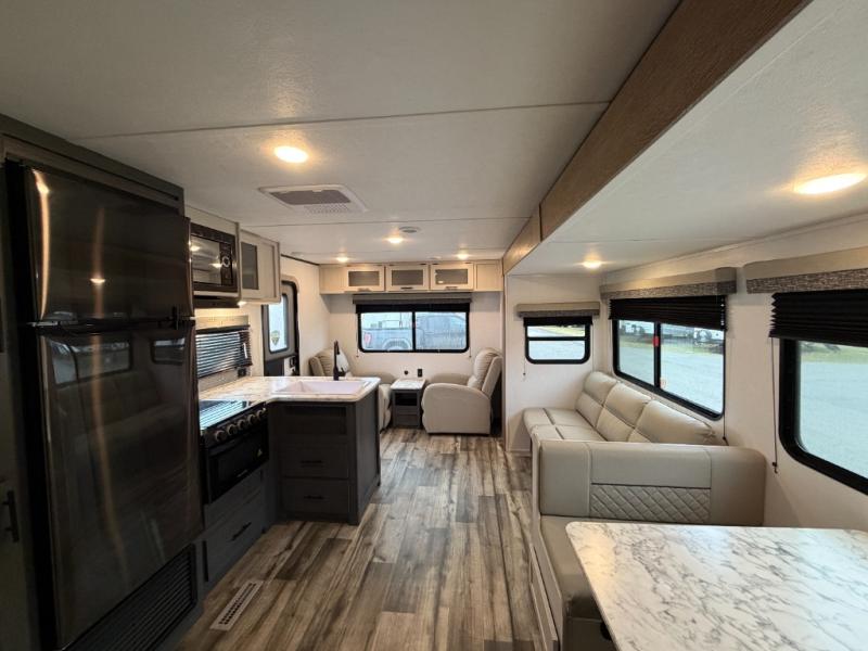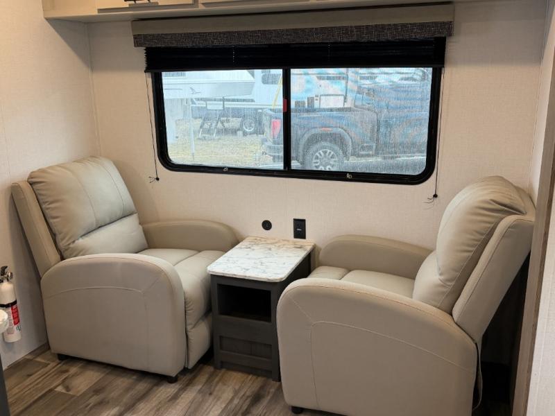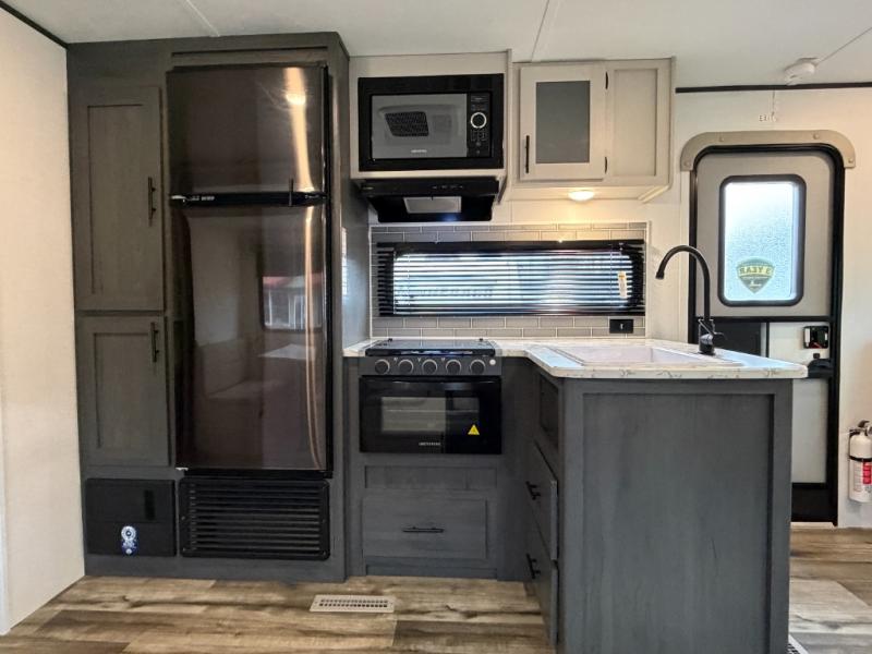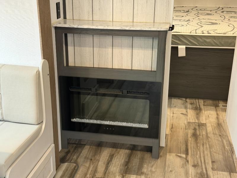 With dual entry doors, you can easily enter and exit this travel trailer! The jackknife sofa with footrest and booth dinette are next to each other near the fireplace, as well as two rear recliners allowing you to visit with other RVers or your family. The cook will have an oven and a microwave to make meals, and a 12V refrigerator for cold items, plus a galley sink to keep the dishes clean. Speaking of being clean, the full bathroom offers a shower with exhaust fan to eliminate unwanted steam as you clean yourself up after a fun day at the beach. The front private bedroom has a residential queen bed and one of the entrance/exit doors so you can slip out for an early morning fishing trip!