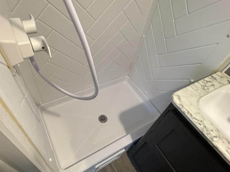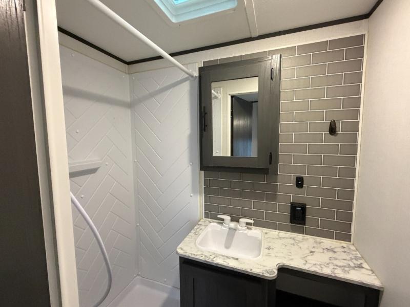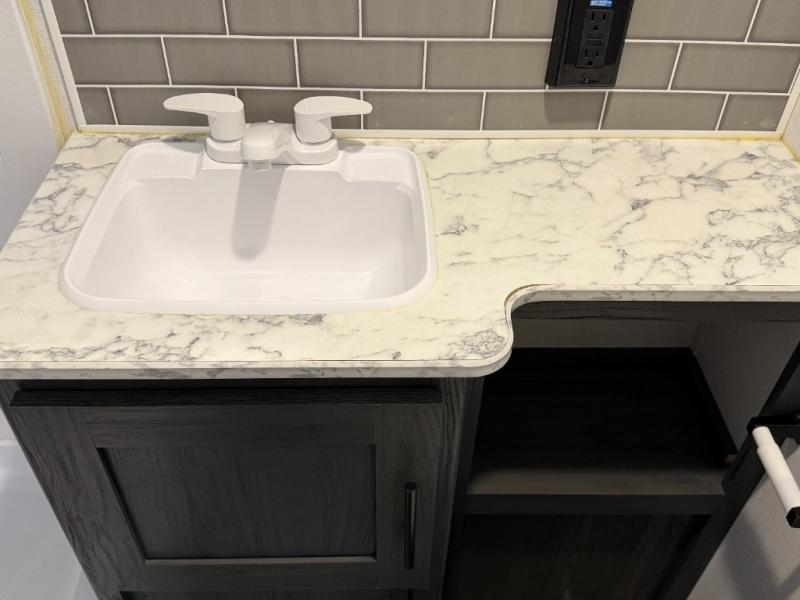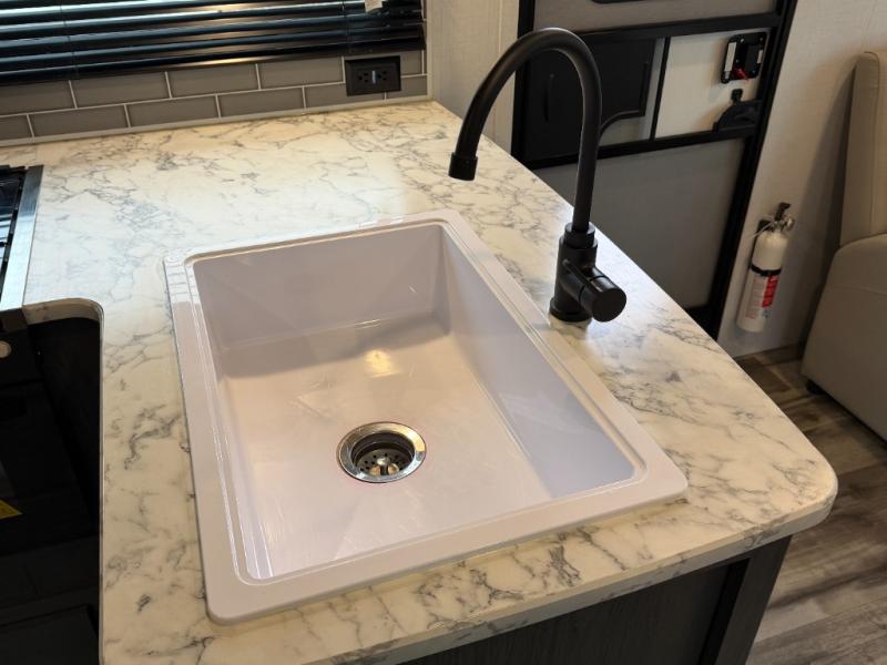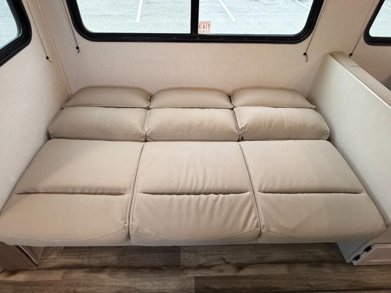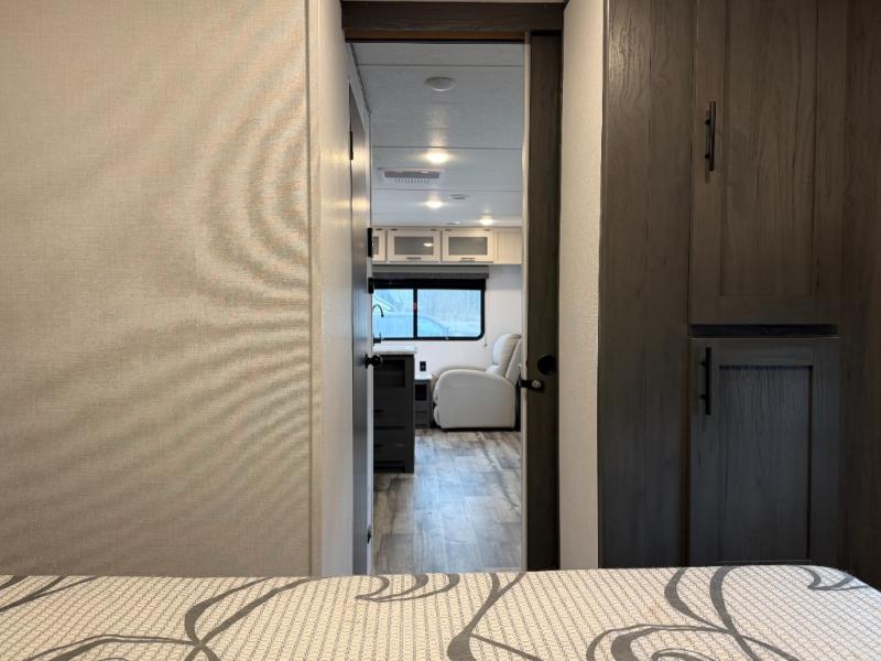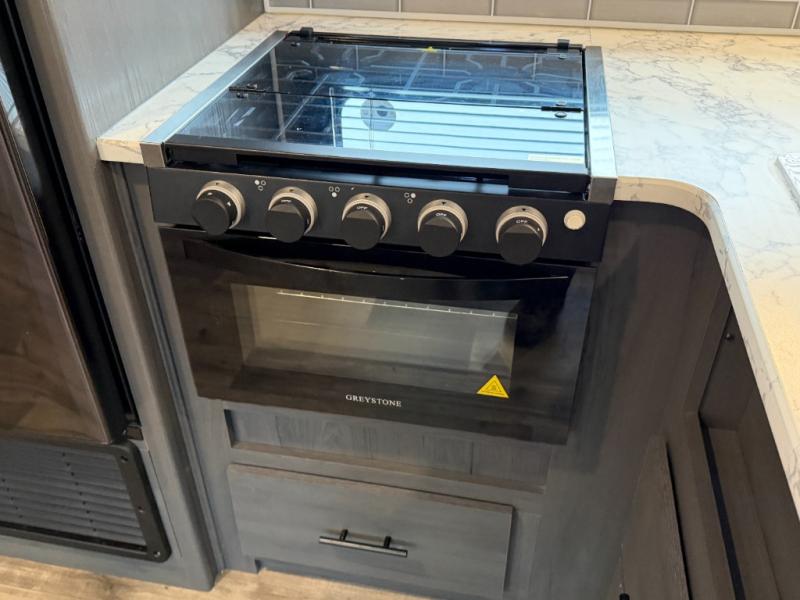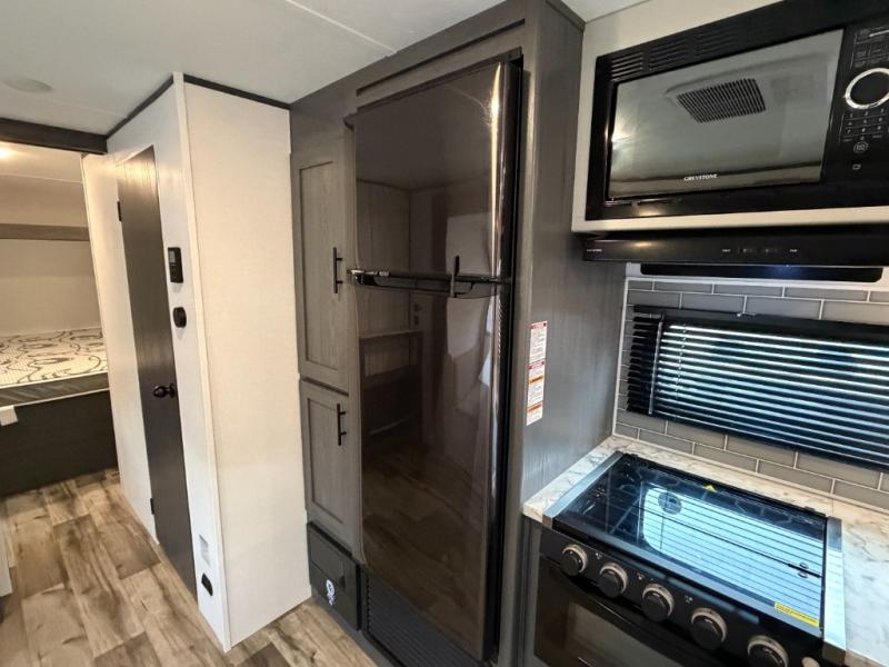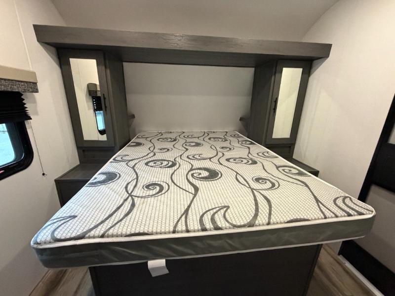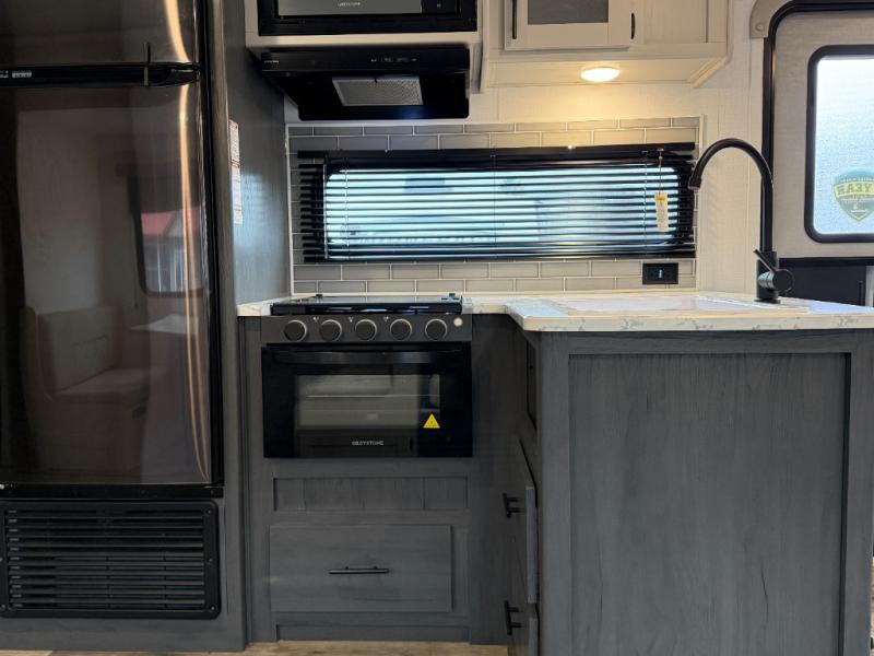 With dual entry doors, you can easily enter and exit this travel trailer! The jackknife sofa with footrest and booth dinette are next to each other near the fireplace, as well as two rear recliners allowing you to visit with other RVers or your family. The cook will have an oven and a microwave to make meals, and a 12V refrigerator for cold items, plus a galley sink to keep the dishes clean. Speaking of being clean, the full bathroom offers a shower with exhaust fan to eliminate unwanted steam as you clean yourself up after a fun day at the beach. The front private bedroom has a residential queen bed and one of the entrance/exit doors so you can slip out for an early morning fishing trip!
