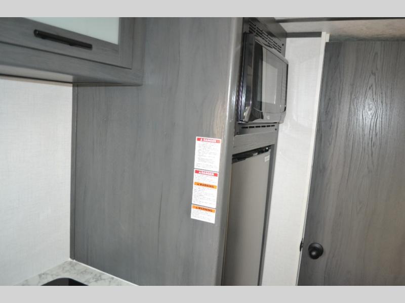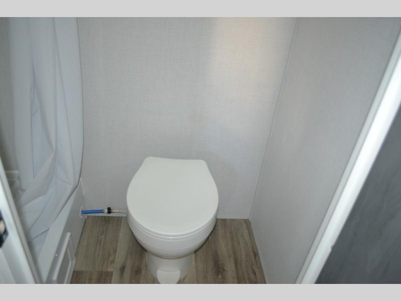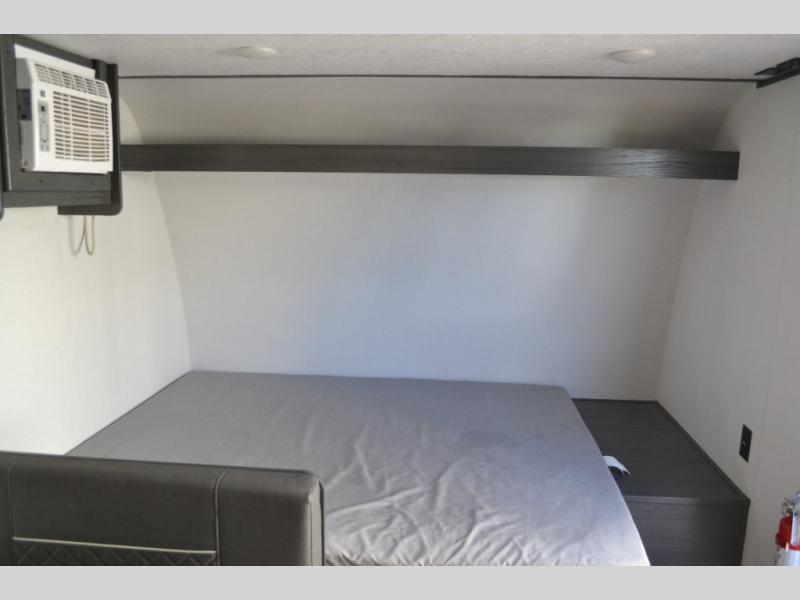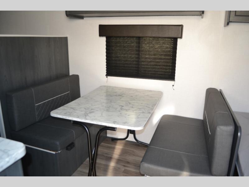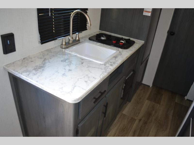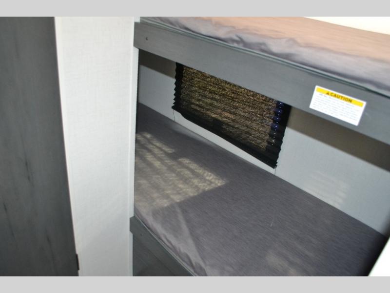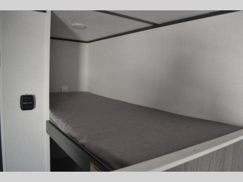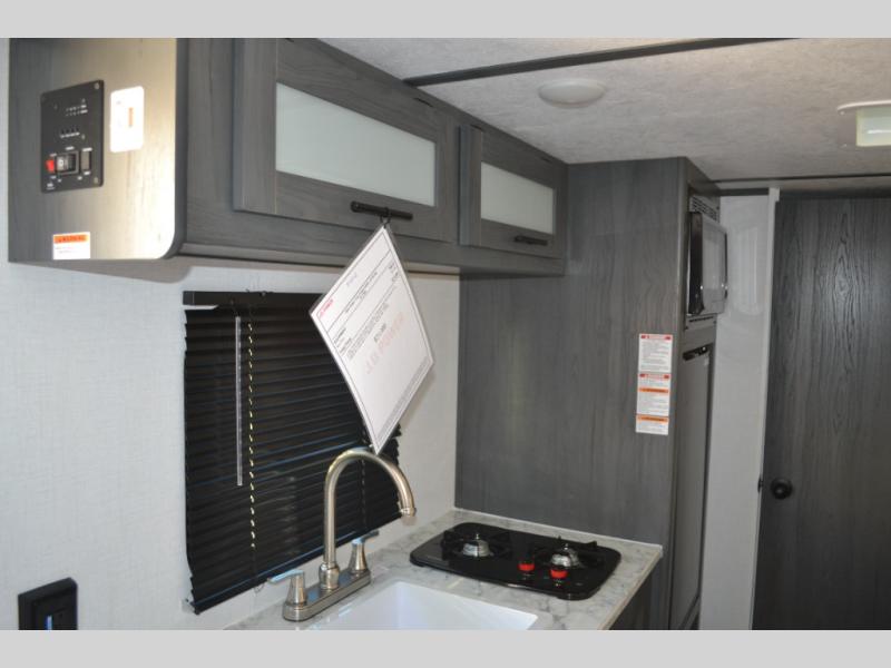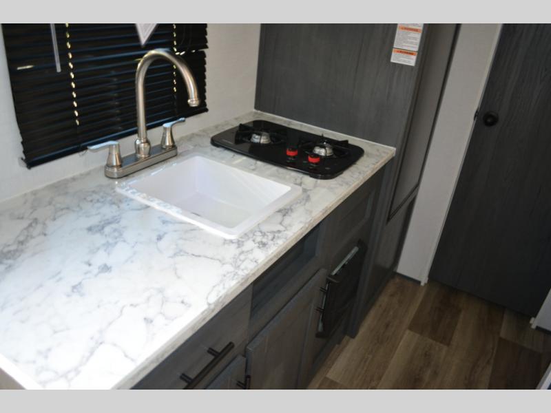 A perfect trailer for your family of three to five featuring a set of bunk beds for the kids, a queen bed up front for you, and the booth dinette that can be converted to sleep one or two more depending on size. For meals, there is a two burner cooktop and sink, plus a 3.3 cu. ft. refrigerator for your perishables. Overhead cabinetry can be found along both sides for your dishes and things. You will all appreciate the convenience of having your own private shower and toilet so that you don't need to use the campground facilities at night. If you enjoy spending time outside, an awning is available to provide even more living space outdoors!