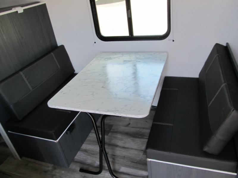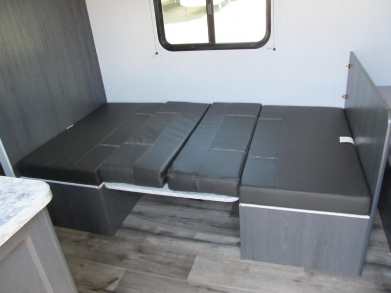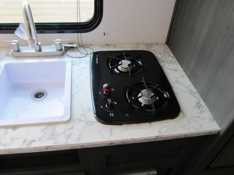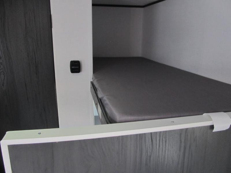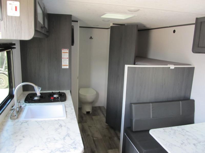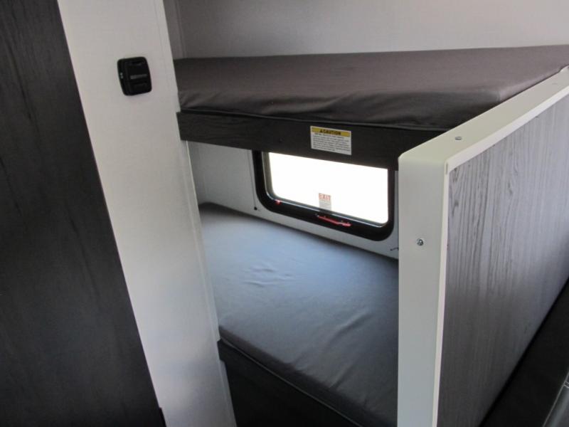 A perfect trailer for your family of three to five featuring a set of bunk beds for the kids, a queen bed up front for you, and the booth dinette that can be converted to sleep one or two more depending on size. For meals, there is a two burner cooktop and sink, plus a 3.3 cu. ft. refrigerator for your perishables. Overhead cabinetry can be found along both sides for your dishes and things. You will all appreciate the convenience of having your own private shower and toilet so that you don't need to use the campground facilities at night. If you enjoy spending time outside, an awning is available to provide even more living space outdoors!