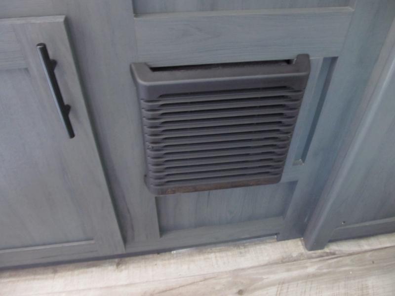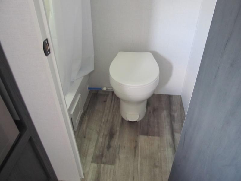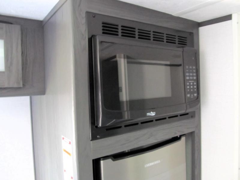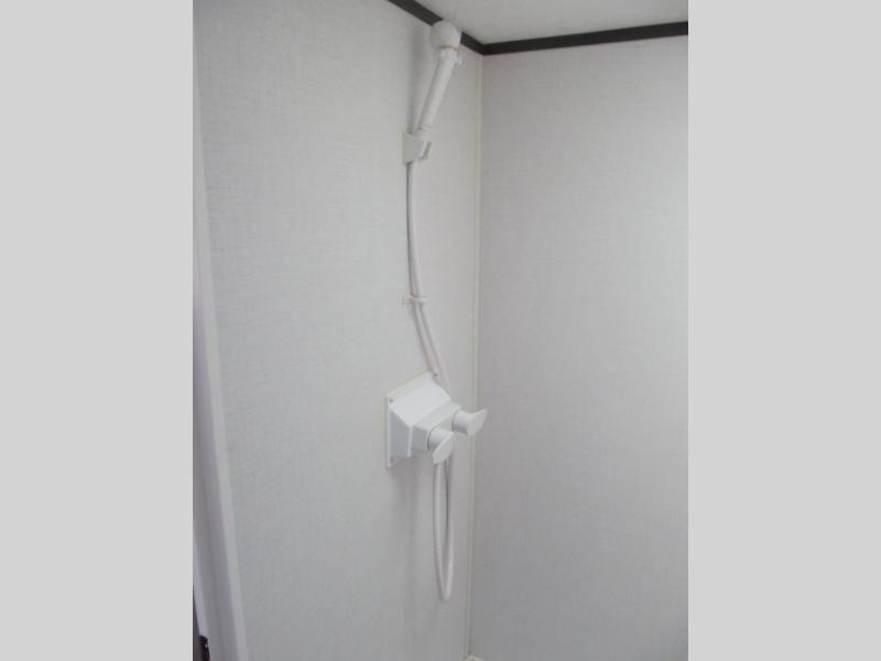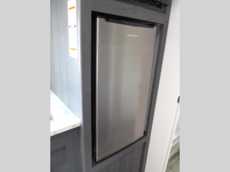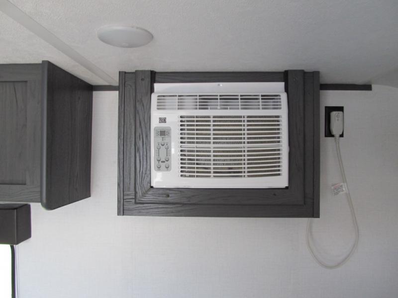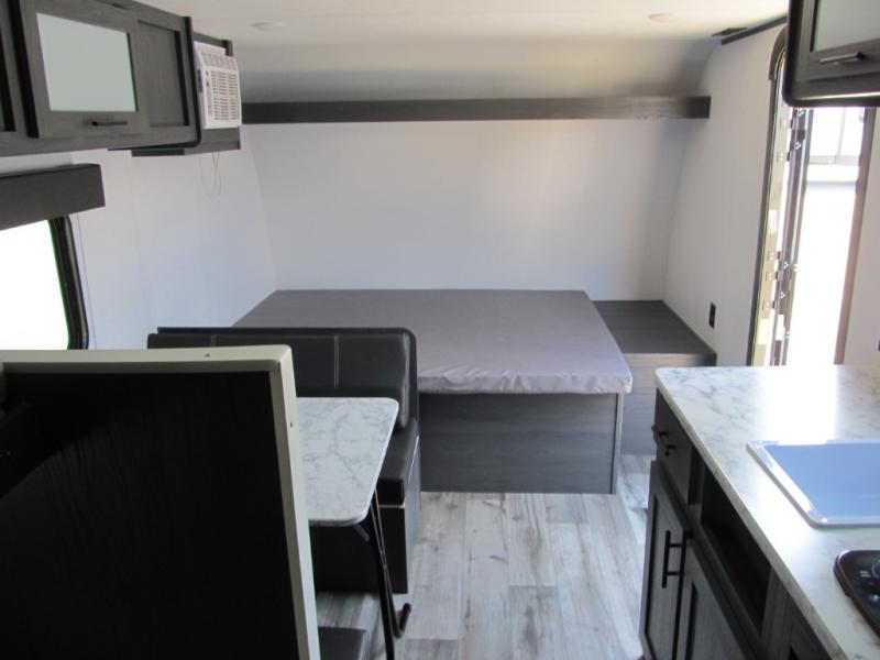 A perfect trailer for your family of three to five featuring a set of bunk beds for the kids, a queen bed up front for you, and the booth dinette that can be converted to sleep one or two more depending on size. For meals, there is a two burner cooktop and sink, plus a 3.3 cu. ft. refrigerator for your perishables. Overhead cabinetry can be found along both sides for your dishes and things. You will all appreciate the convenience of having your own private shower and toilet so that you don't need to use the campground facilities at night. If you enjoy spending time outside, an awning is available to provide even more living space outdoors!