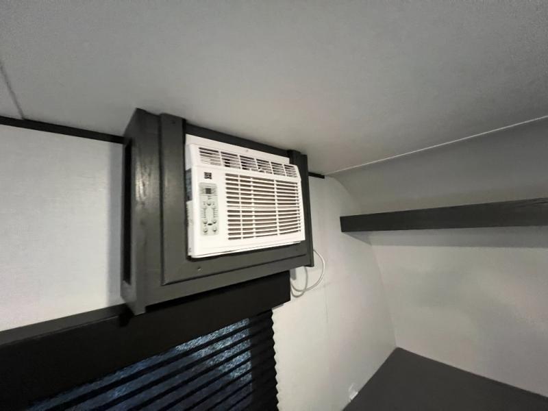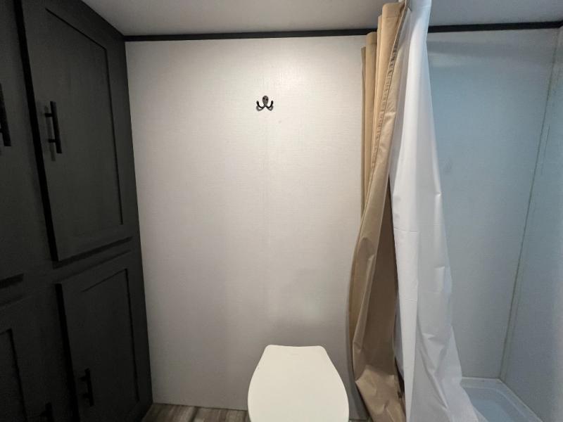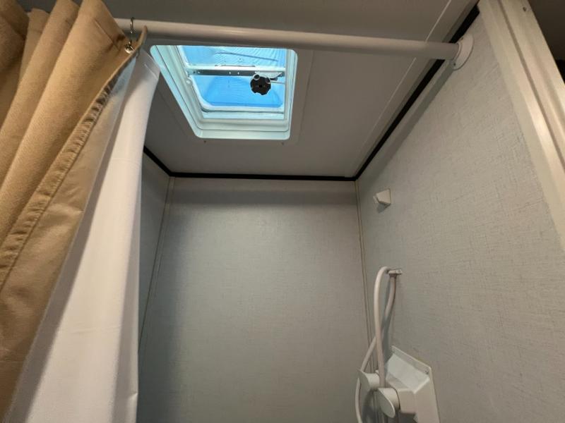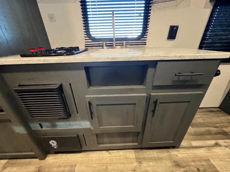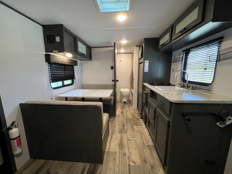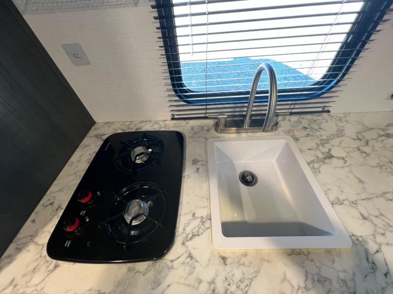 A perfect couples coach that could sleep one or two more, depending on size, using the booth dinette which can be converted at night This unit is cozy and convenient providing you just what you need to enjoy a little adventure away from home. For meals, there is a two burner cooktop and sink, plus a 3.3 cu. ft. refrigerator for your perishables. Overhead cabinetry can be found along both sides for your dishes and things. You will all appreciate the convenience of having your own private shower and toilet so that you don't need to use the campground facilities at night. You will also enjoy spending time outside with an 8' awning to provide even more living space outdoors!