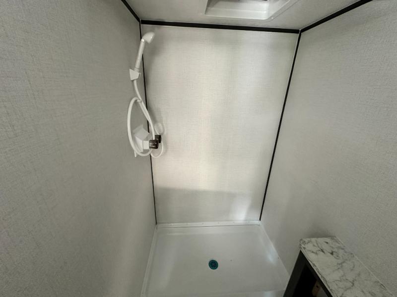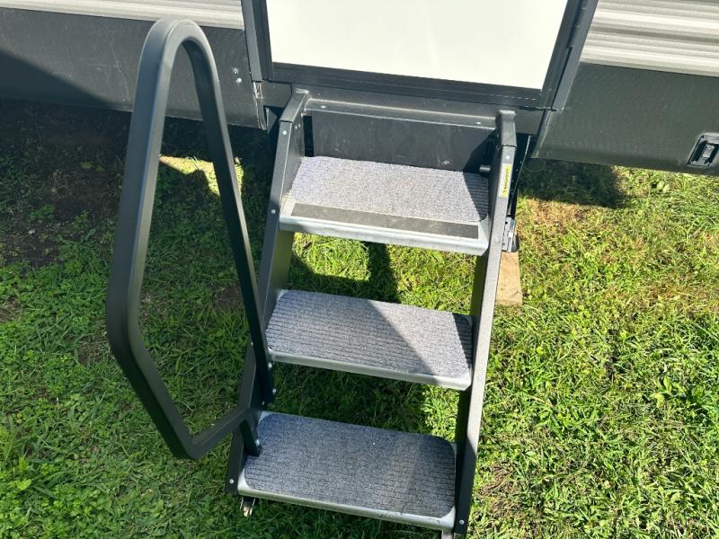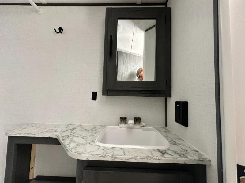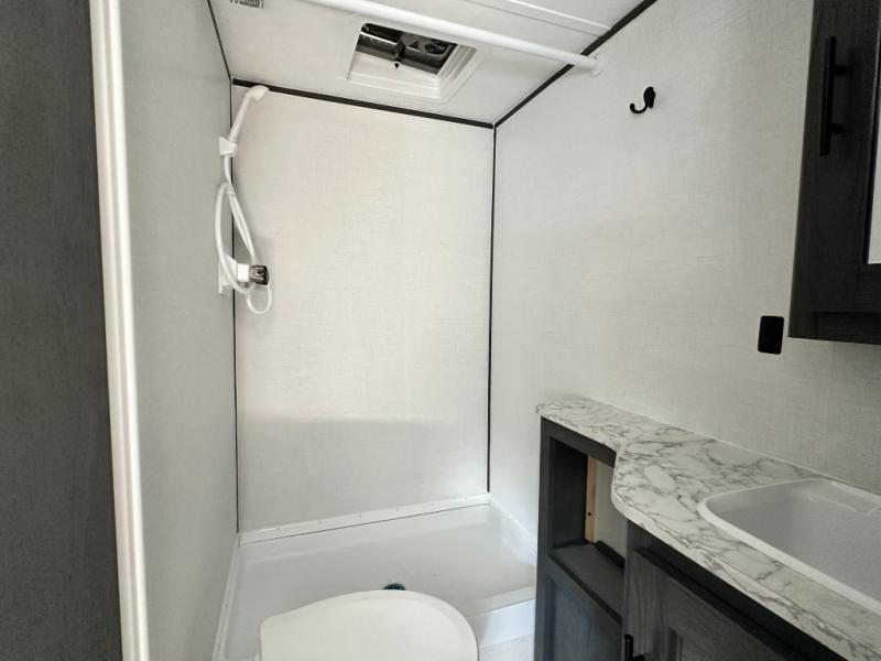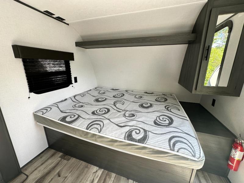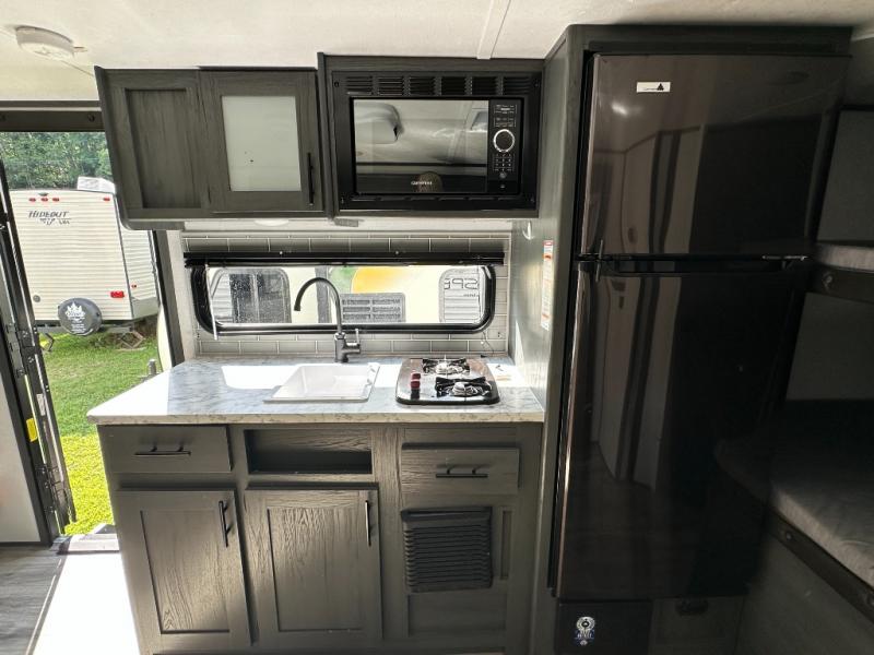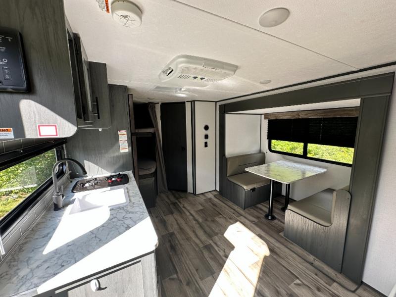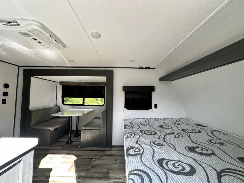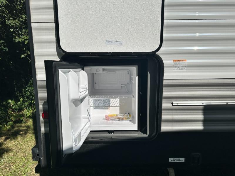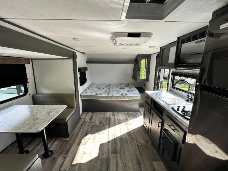 If you need space for seven or eight travelers, this Aspen Trail Mini might be it for you! There is a set of bunks in the rear curbside corner. Beneath this on the outside you will find an outdoor refrigerator that is perfect for drinks and snacks. A single slide features a booth dinette for all to enjoy meals and games at, and you will appreciate the added interior space inside as well. Up front, a queen bed with side closet at the foot of the bed, plus an overhead shelf across the front of the unit for your things. Along the curbside, your inside kitchen featuring a 10 cu. ft. 12V refrigerator, microwave oven, two-burner cooktop, and sink, plus overhead storage for your dishes and things. An outside 10' awning offers protection from the elements and also creates another outdoor living space for you to place camp chairs and a table, plus more.