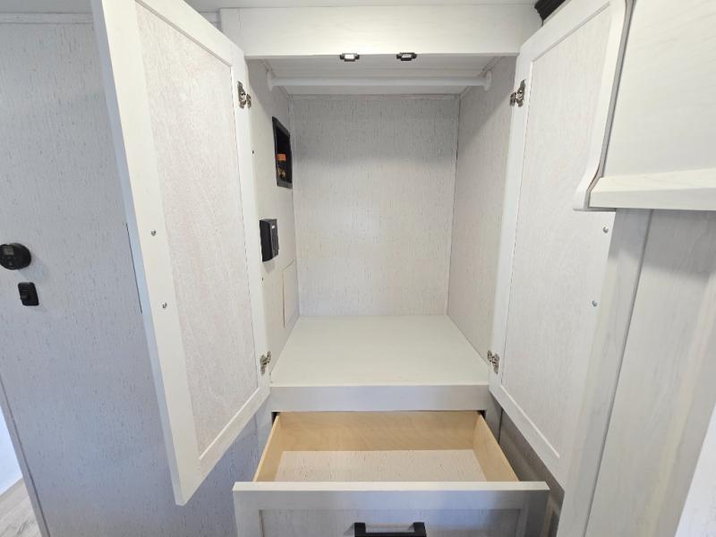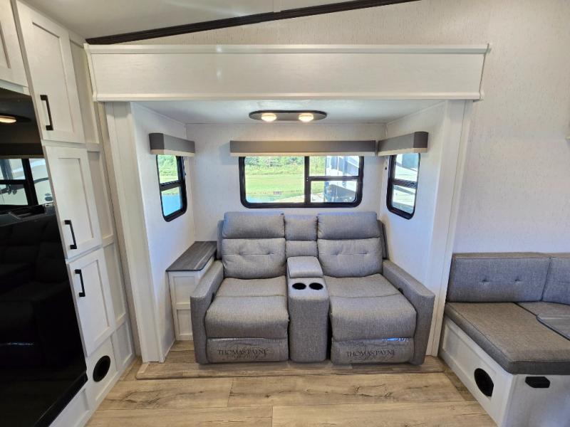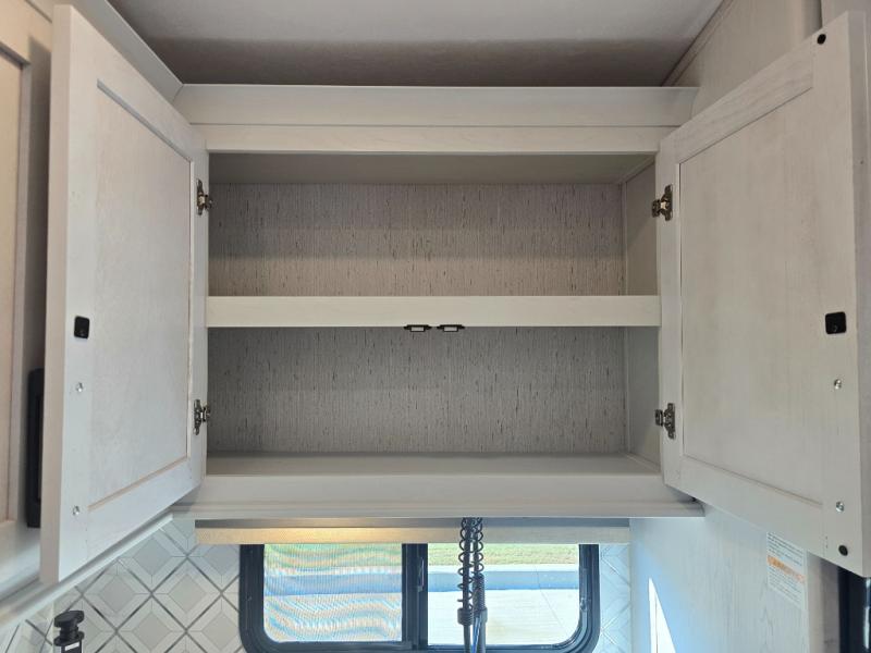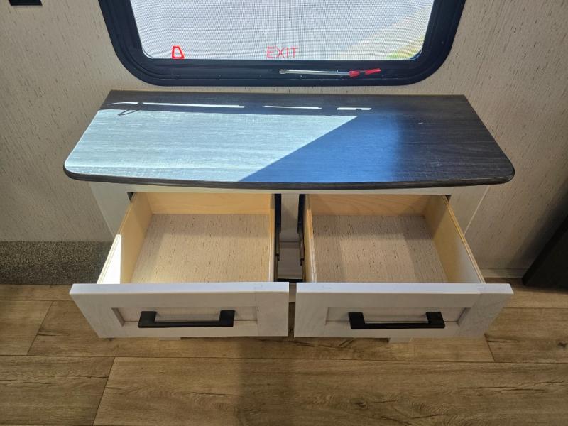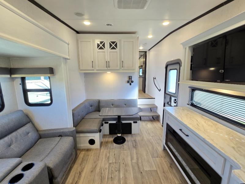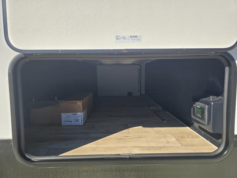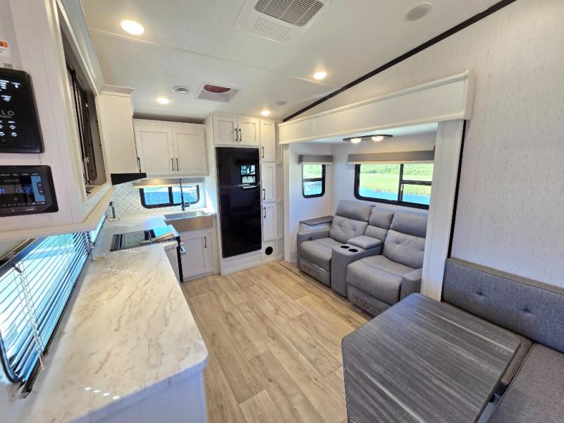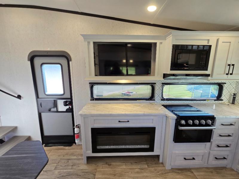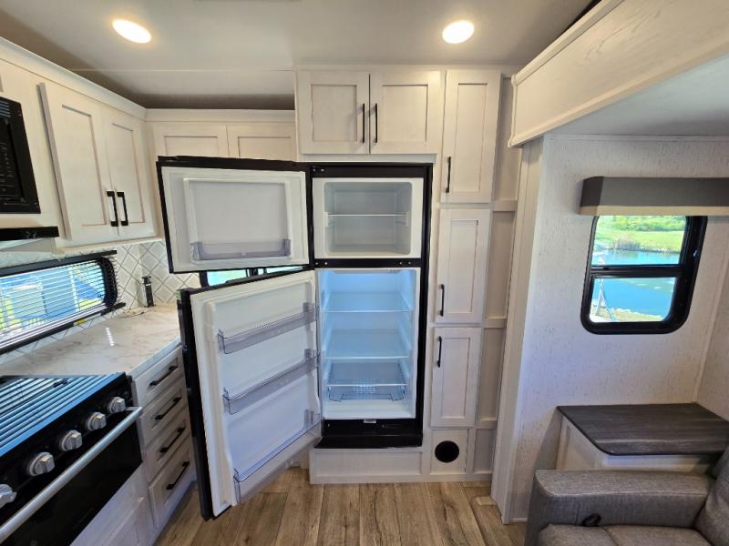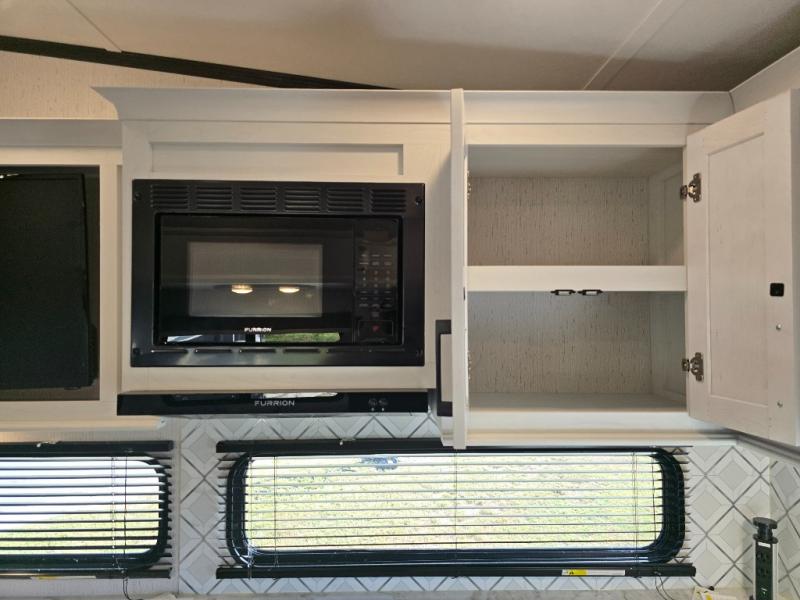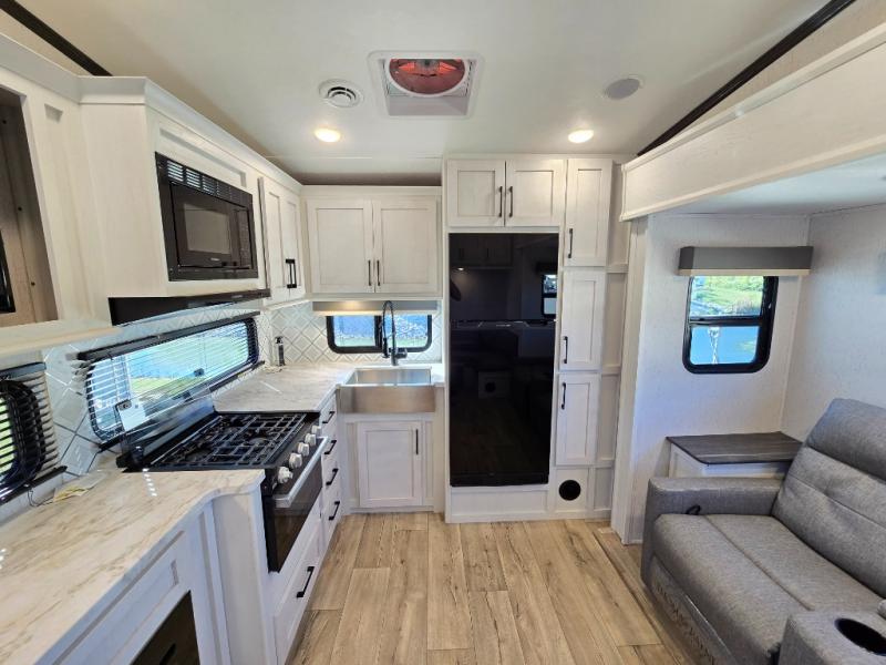 Plan to say awhile in this rear kitchen fifth wheel! You will fall in love with the front bedroom with a king bed slide out, large front closet, a dresser, plus a mounted TV for movies in bed. The rear kitchen includes plenty of space to prep meals, a farm style sink, plus a 10 cu. ft. 12V refrigerator and a pantry for food storage! You can get cozy on the theater seating slide out or at the cafe dinette, and the LED TV will ensure you'll never go bored on rainy days!