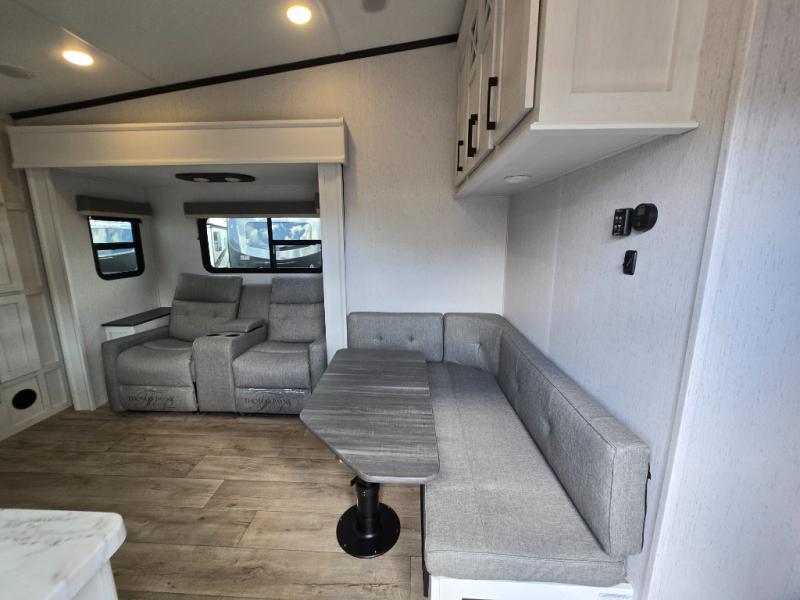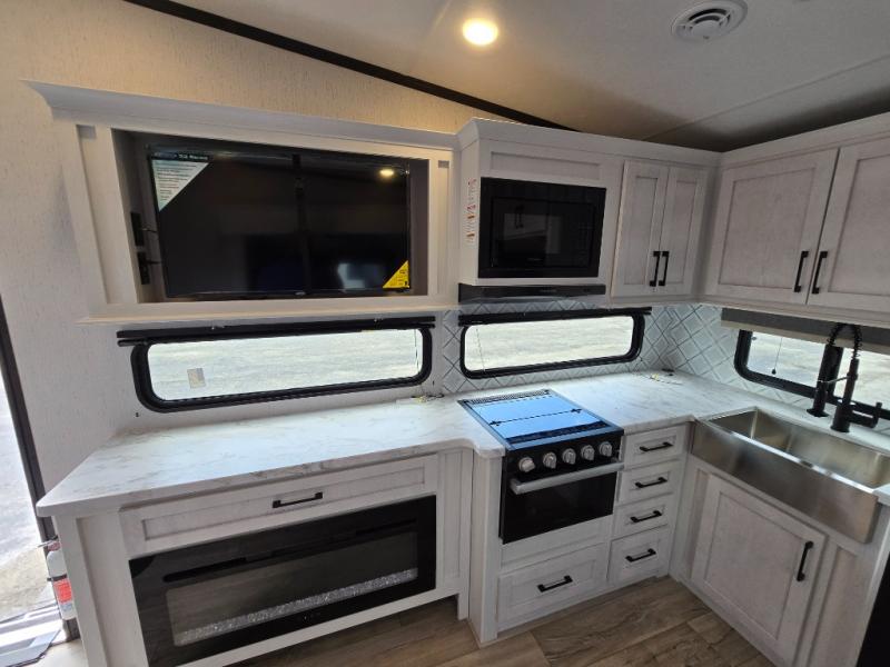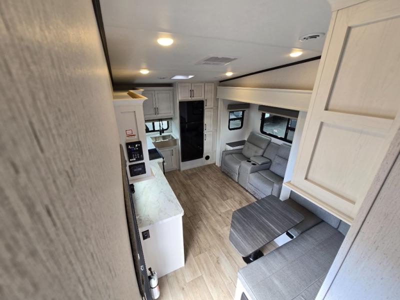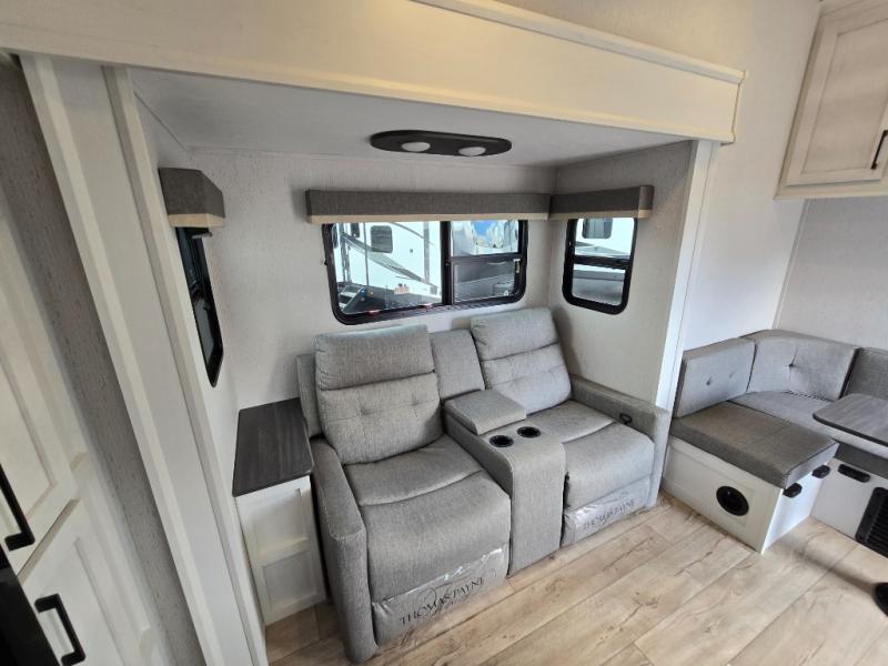 Plan to say awhile in this rear kitchen fifth wheel! You will fall in love with the front bedroom with a king bed slide out, large front closet, a dresser, plus a mounted TV for movies in bed. The rear kitchen includes plenty of space to prep meals, a farm style sink, plus a 10 cu. ft. 12V refrigerator and a pantry for food storage! You can get cozy on the theater seating slide out or at the cafe dinette, and the LED TV will ensure you'll never go bored on rainy days!