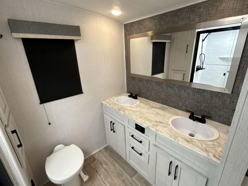 Enjoy relaxing weekends at the campground in this cozy travel trailer for five to six. The large slide will provide a spacious living area, and there is a U-shaped dinette and tri-fold sofa within the slide for seating and sleeping space. The hinged entertainment center hides the pantry, and the fireplace will make it feel more like home. Prepare home cooked meals on the three burner range, or use the microwave oven. You'll find the countertop extension will provide more space to prep meals, and the 10 cu. ft. double door refrigerator can store your perishables for the whole weekend. This model also includes a spacious full rear bath with dual bath sinks so two can get ready at the same time, and you'll love the front private bedroom with a king bed for all-around comfort!