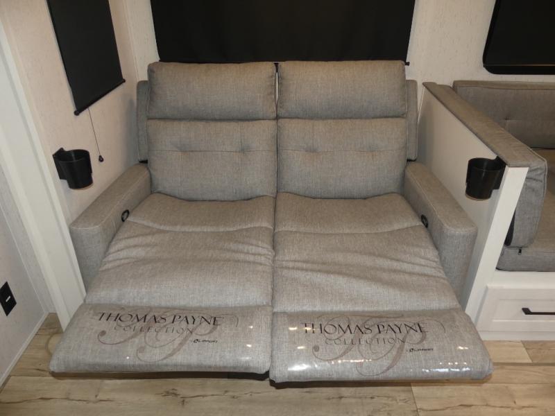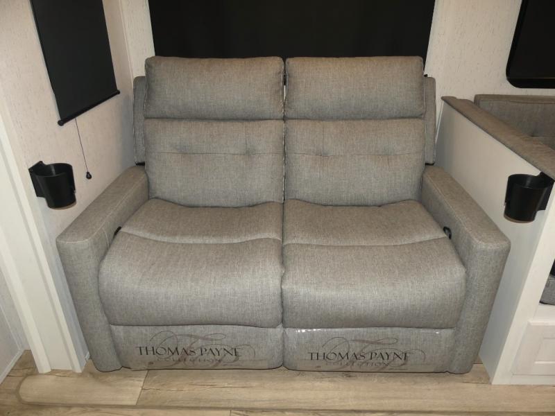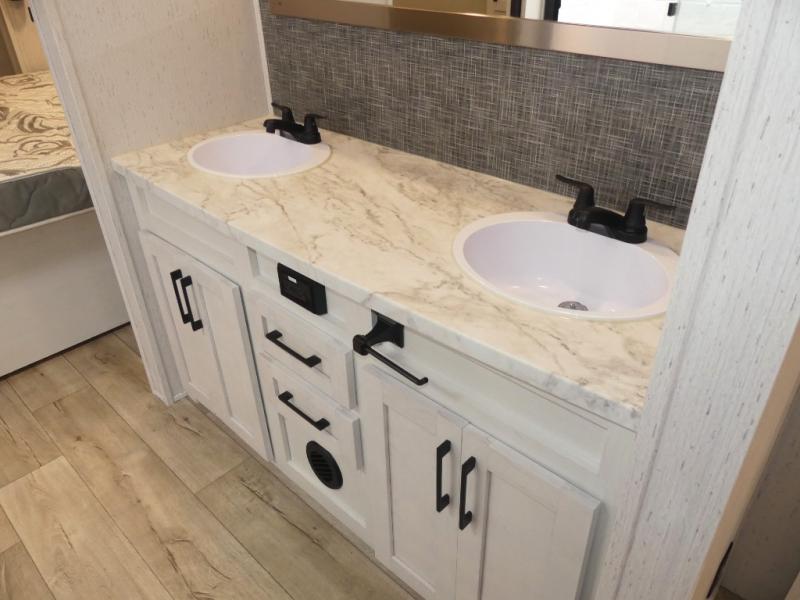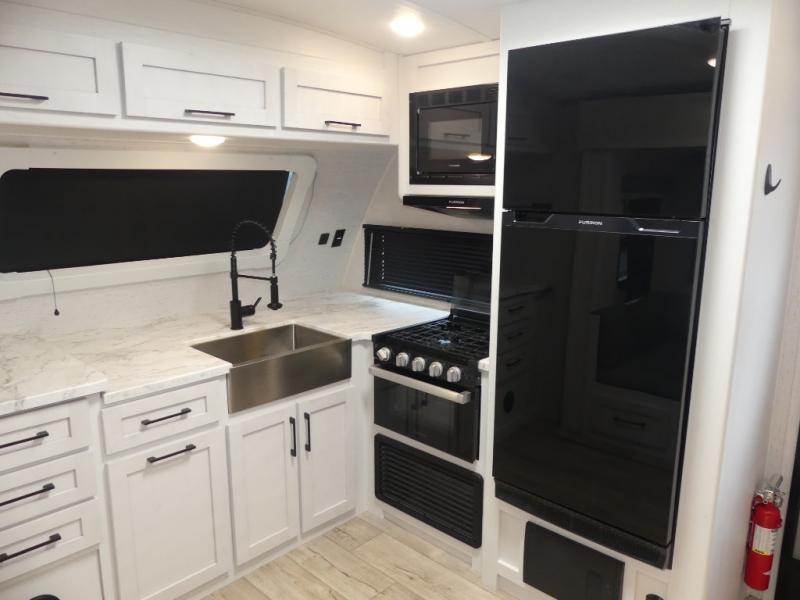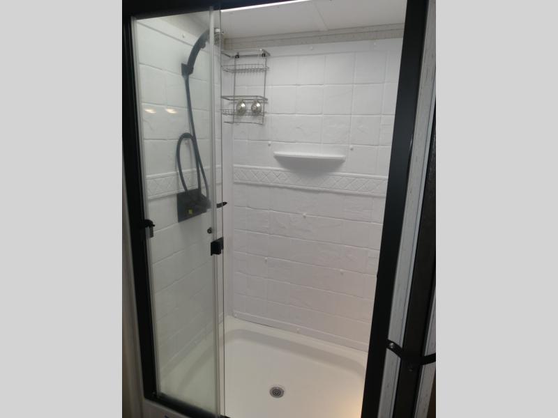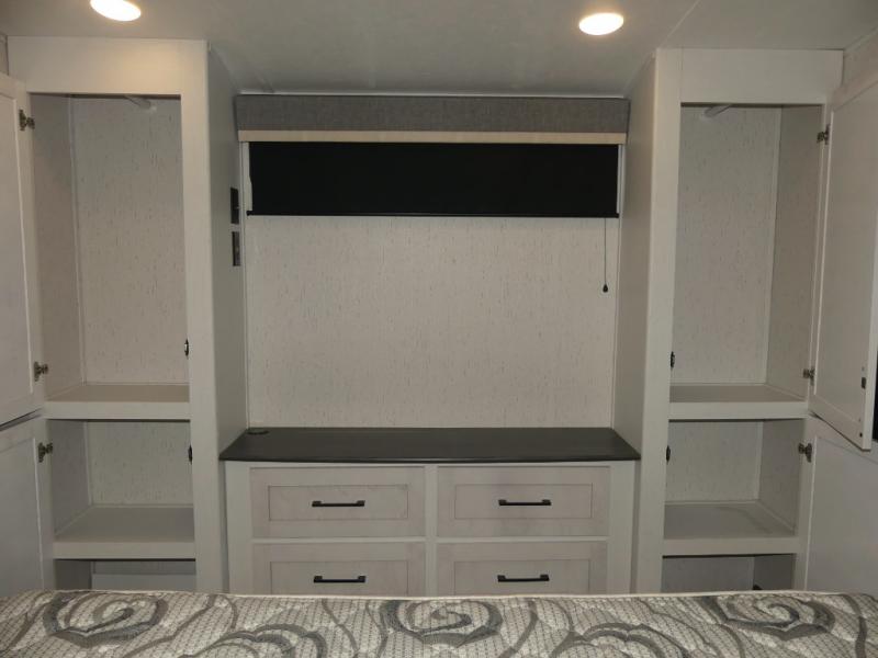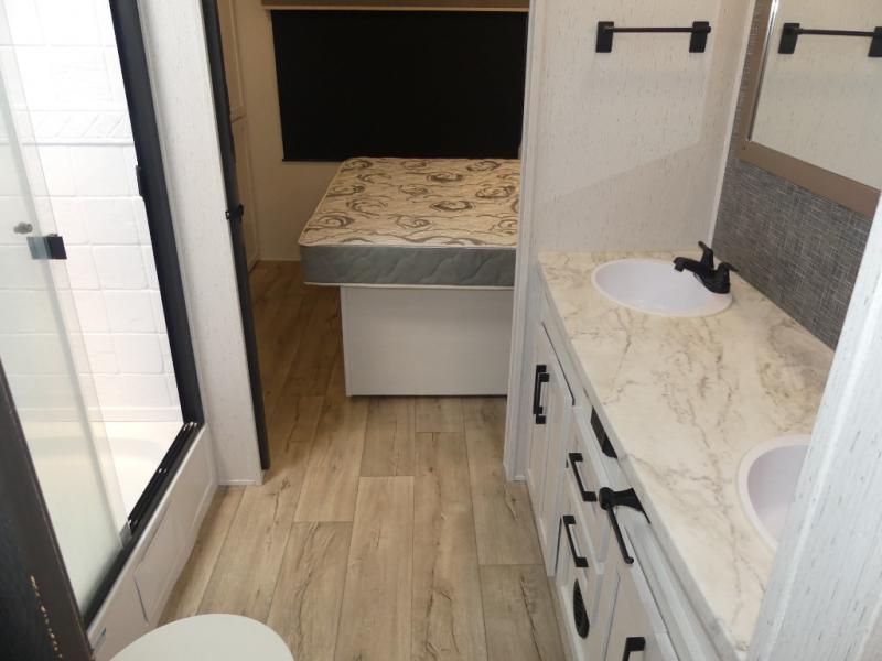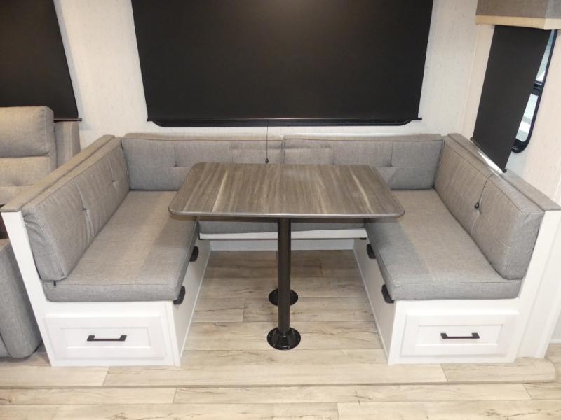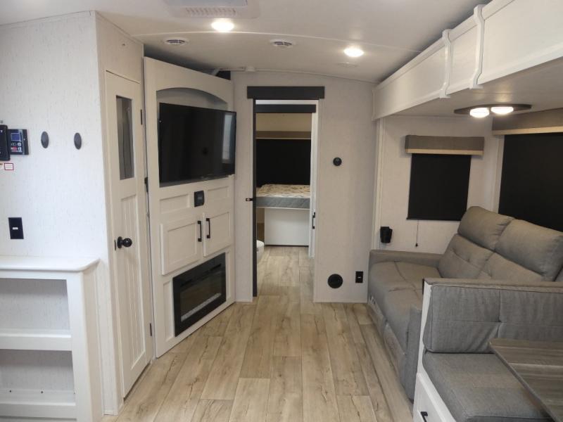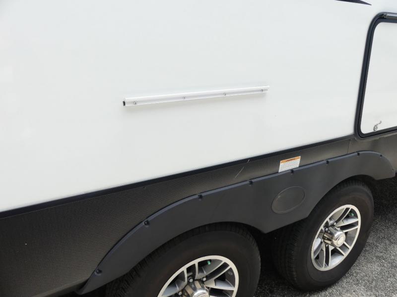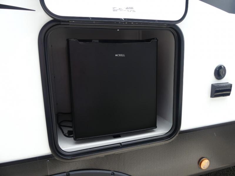 You will have everything you need for a comfortable camping trip with this travel trailer! It features a rear private bedroom with a king bed slide for more interior space and an entrance into the walk-through bathroom which will come in handy at night. The bathroom also has a dual sink vanity for two to get ready at once in the mornings. The front kitchen has plenty of countertop space to prepare your best meals and even a pull out trash can, and you can comfortably enjoy them at the U-shaped dinette, plus it can transform into an extra sleeping space for a guest or two to tag along. What better way to relax at night than on the tri-fold sofa across from the hinged entertainment center!