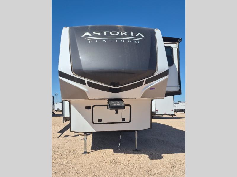 Each one of these Dutchmen RV Astoria Platinum Series fifth wheels feature a fiberglass exterior for added durability and an All Weather Thermal Package so you can camp all year long! There are also Secure Stance entry steps, slam latch baggage doors, an outside shower port, and many more exterior conveniences. You'll enjoy an automatic leveling system for easy set up and a power awning with LED lights for an inviting outdoor space. The interior is designed with high-gloss acrylic backsplash, night shades throughout the living area, and stainless steel appliances. The on-demand tankless water heater will provide endless hot showers, and the HyperDeck flooring will be easy to keep clean.