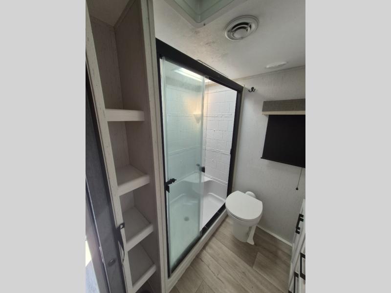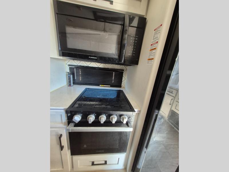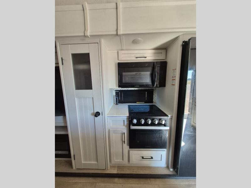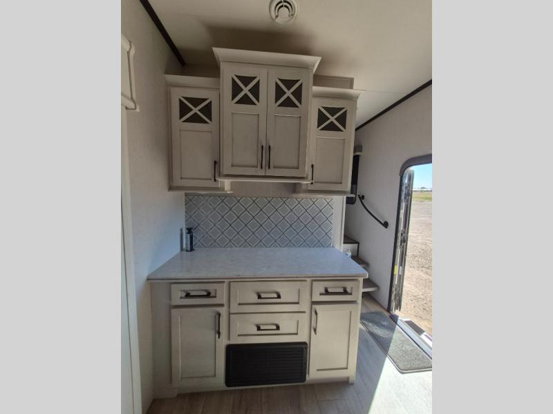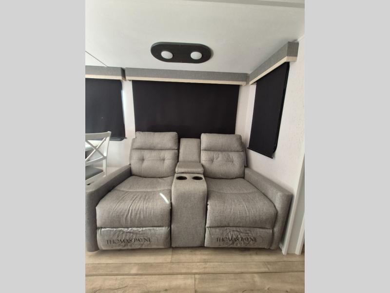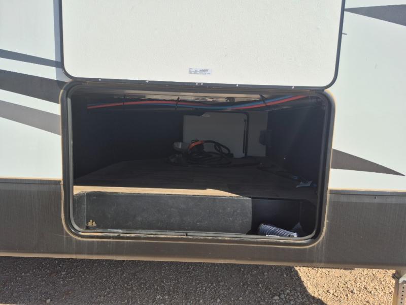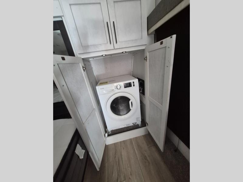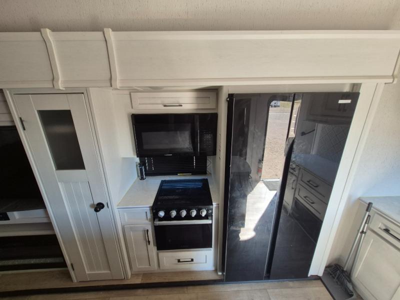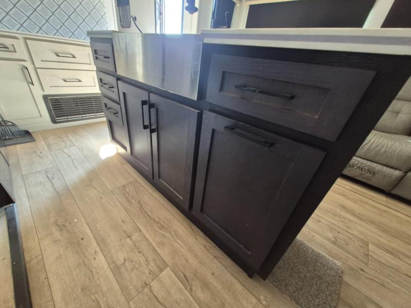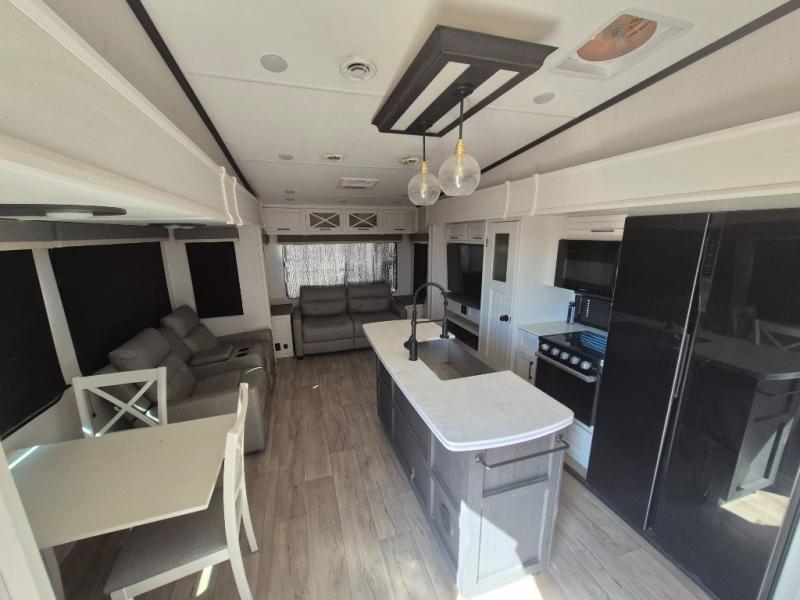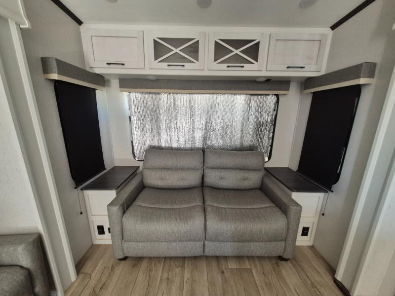 Two can get ready at once with a dual sink vanity in the full bathroom of this fifth wheel! Enjoy a good night's rest and interior space with the king bed slide in the front private bedroom which also has a front wardrobe to keep your clothes looking their best, and a closet with washer/dryer prep. The chef will have an easy time preparing meals in the kitchen with the island, the extra countertop space below the hutch, and the glass top three burner cooktop with 21" oven. The rear living area has a tri-fold sofa and theater seating across from an entertainment center with a fireplace and an HD LED TV!