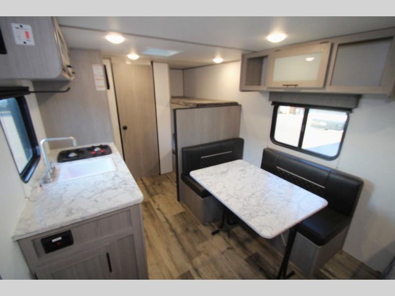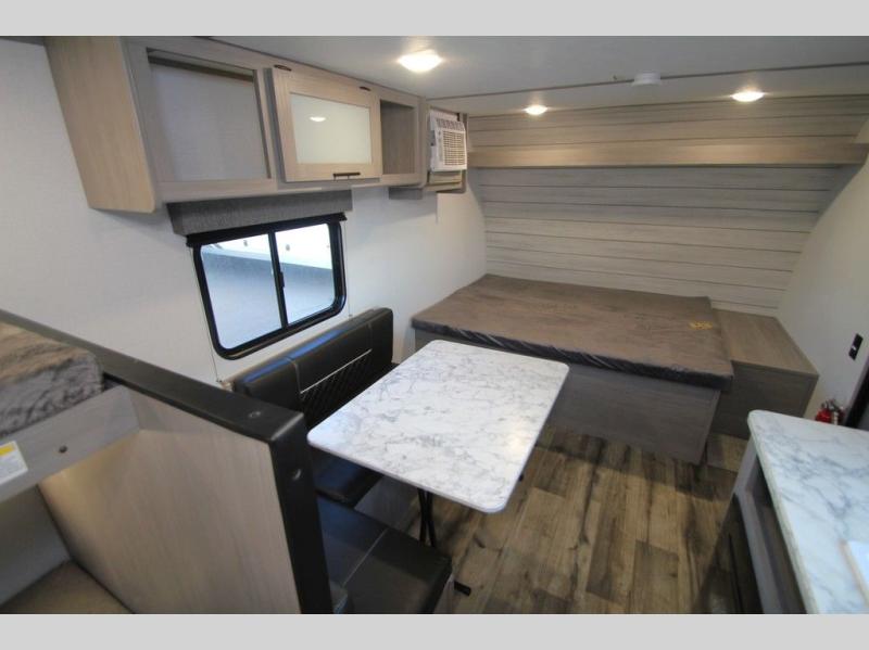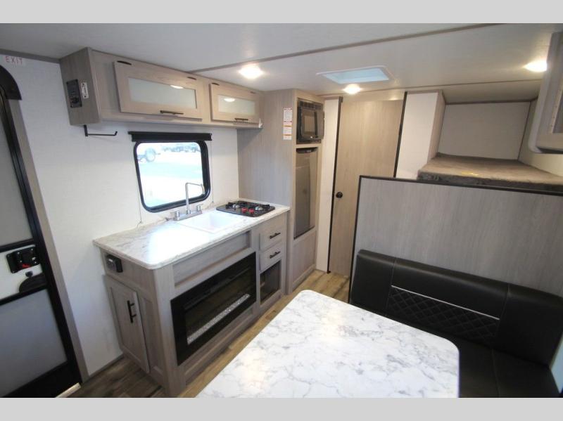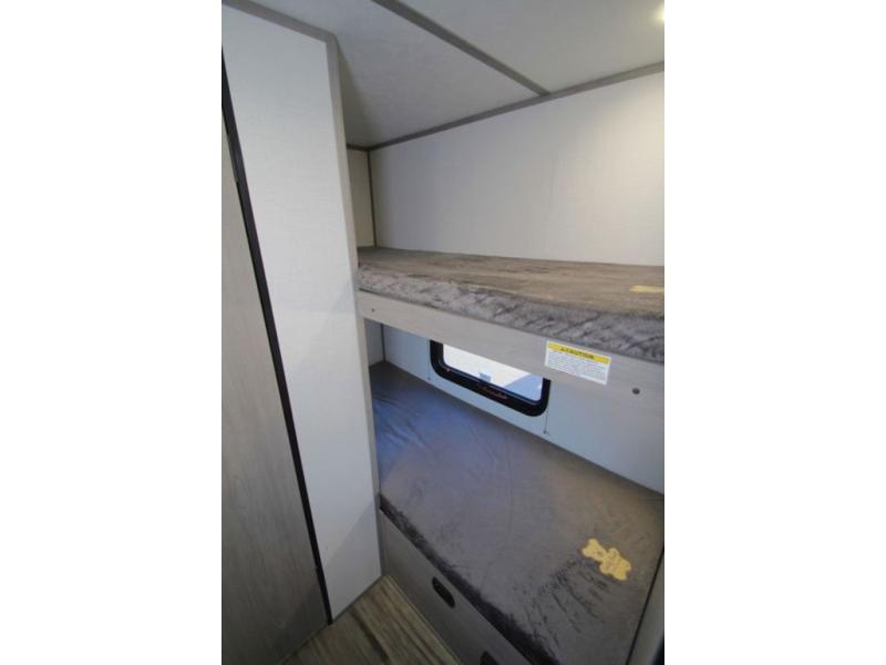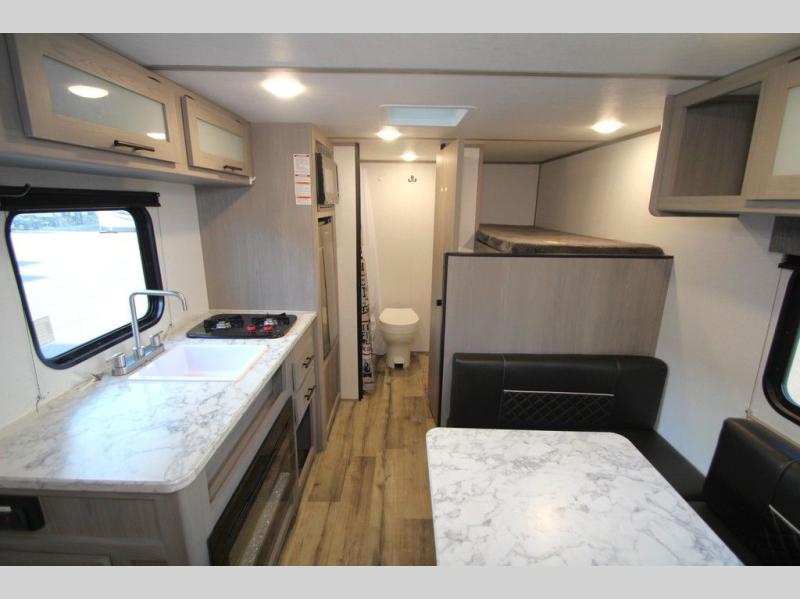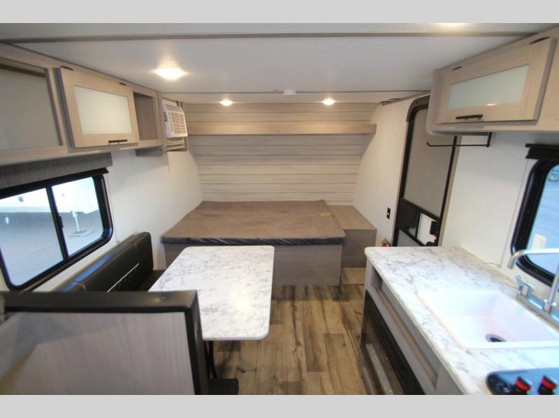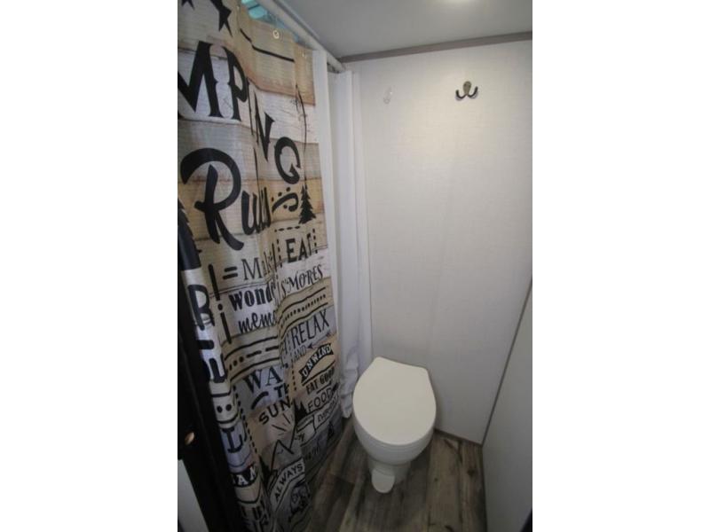 After making dinner on the two burner cooktop or inside the microwave, you can dine at the booth dinette or outside under the 8' power awning if you brought along your camping chairs. Either way you will be comfortable and the dinette may even sleep one person if needed. After playing outdoors all day, everyone can return to get cleaned up in the private bath with a shower and toilet, then fall asleep on the queen bed up front or the bunk beds in the rear corner.