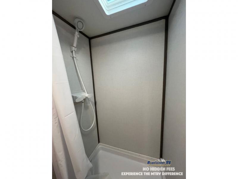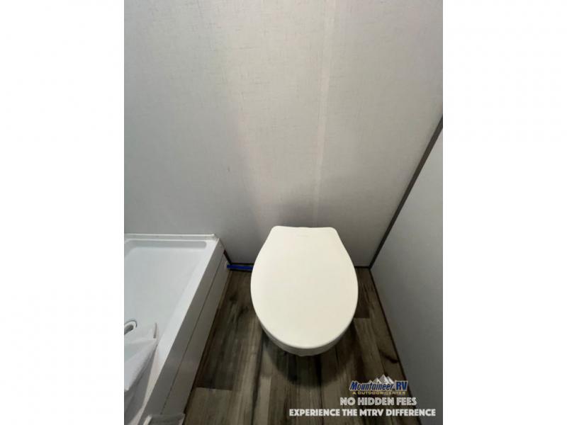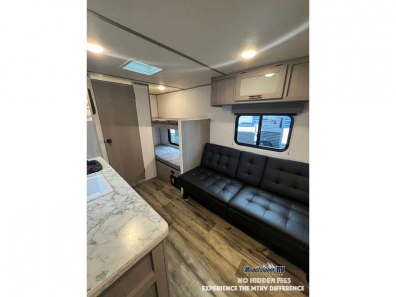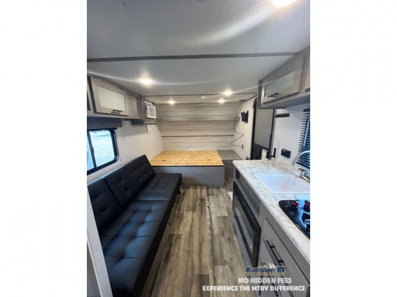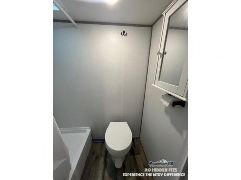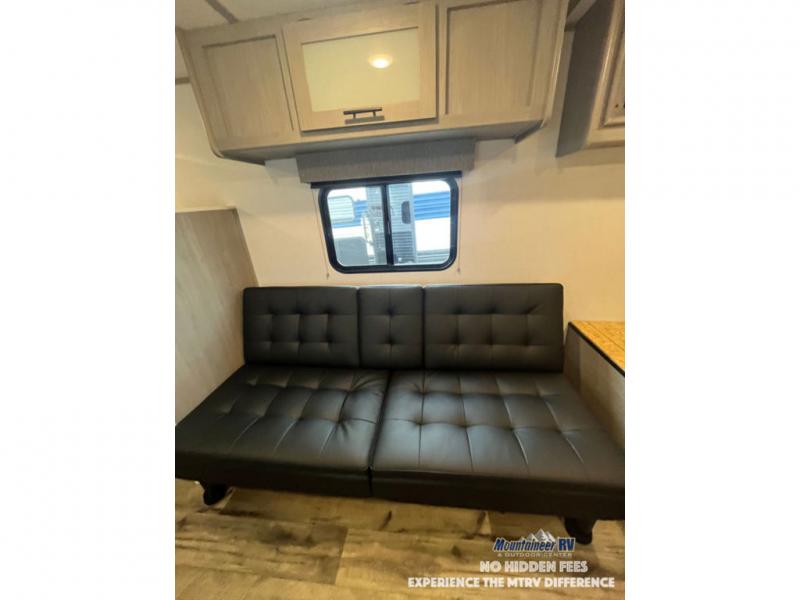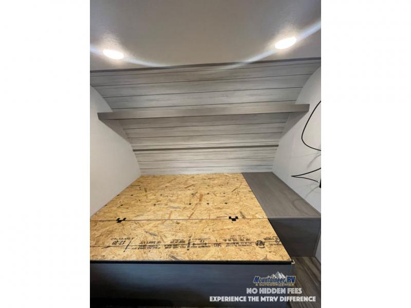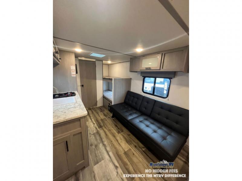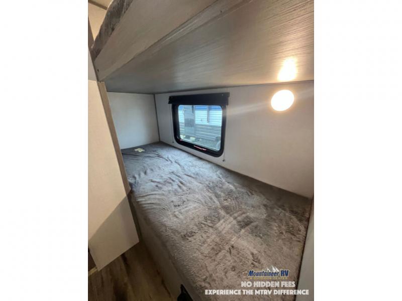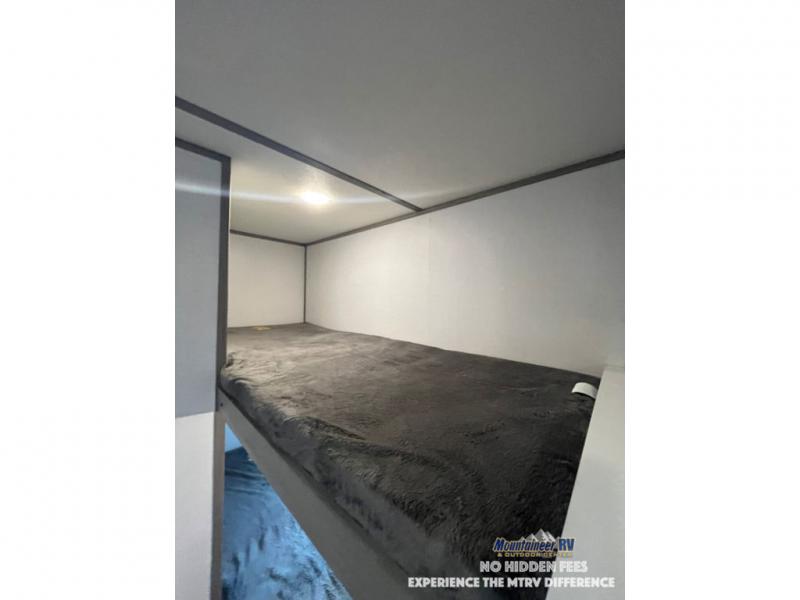 After making dinner on the two burner cooktop or inside the microwave, you can dine at the booth dinette or outside under the 8' power awning if you brought along your camping chairs. Either way you will be comfortable and the dinette may even sleep one person if needed. After playing outdoors all day, everyone can return to get cleaned up in the private bath with a shower and toilet, then fall asleep on the queen bed up front or the bunk beds in the rear corner.