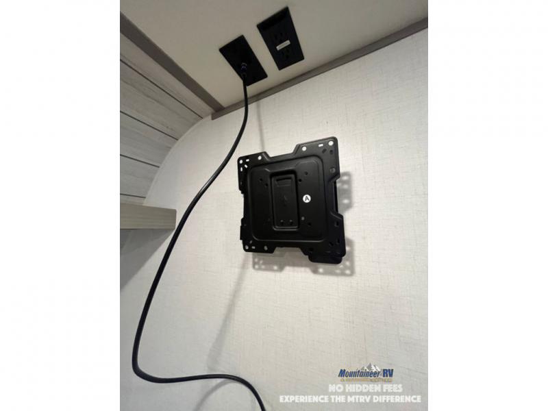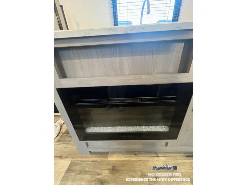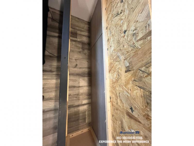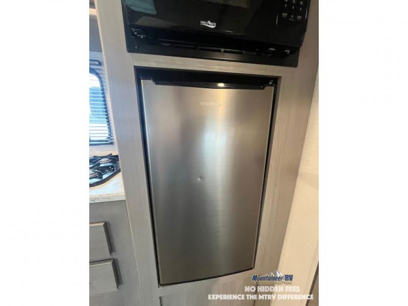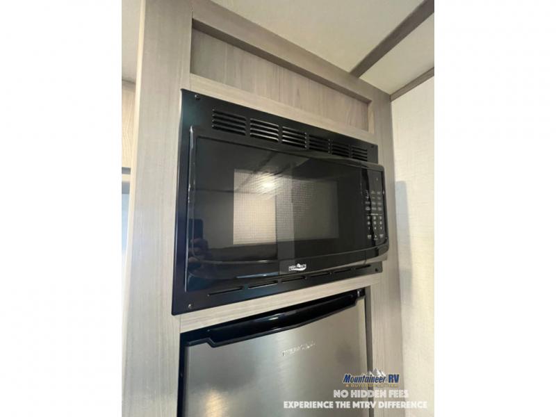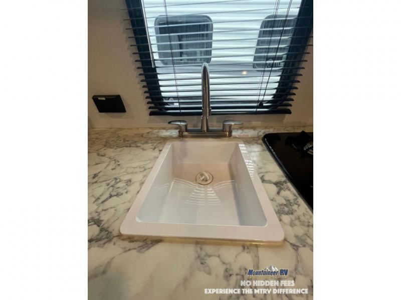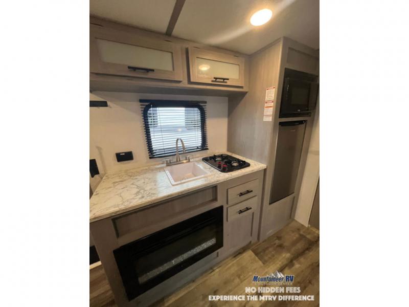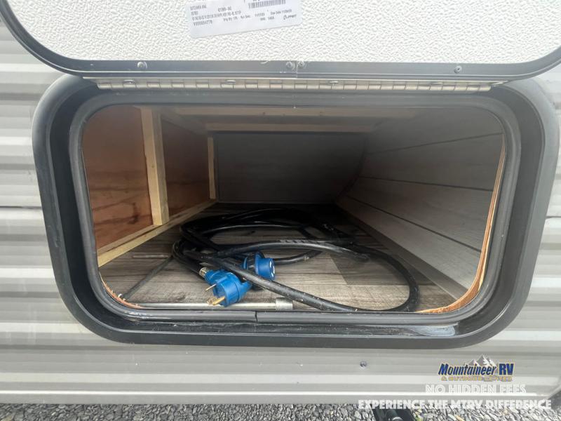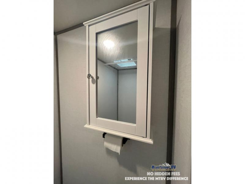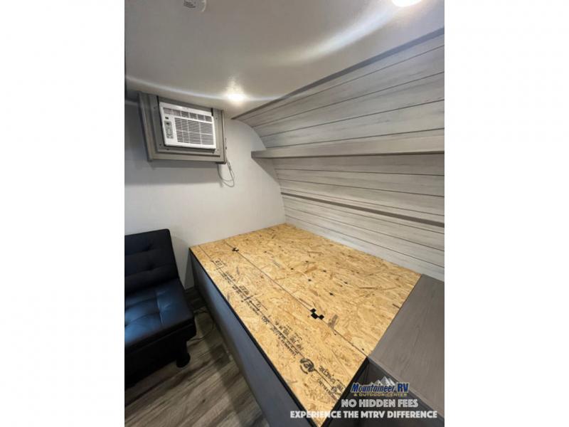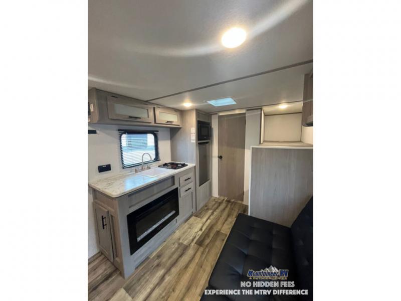 After making dinner on the two burner cooktop or inside the microwave, you can dine at the booth dinette or outside under the 8' power awning if you brought along your camping chairs. Either way you will be comfortable and the dinette may even sleep one person if needed. After playing outdoors all day, everyone can return to get cleaned up in the private bath with a shower and toilet, then fall asleep on the queen bed up front or the bunk beds in the rear corner.