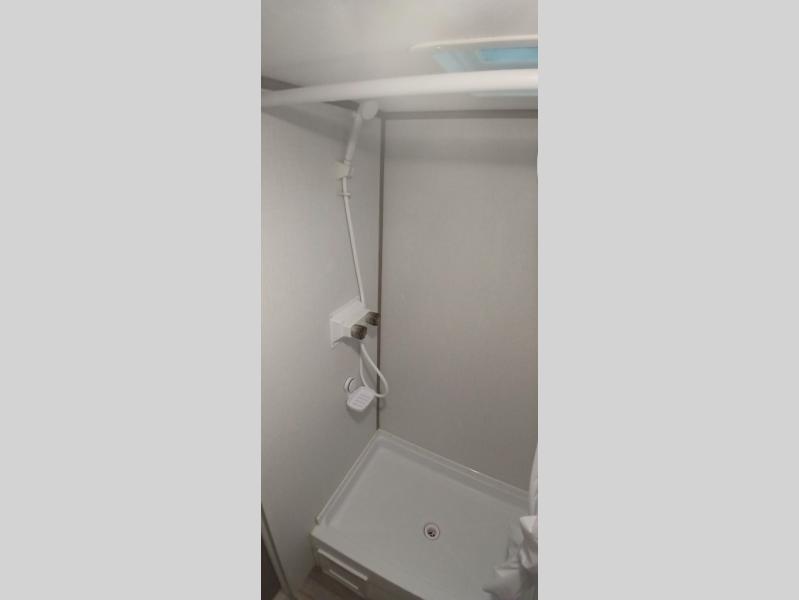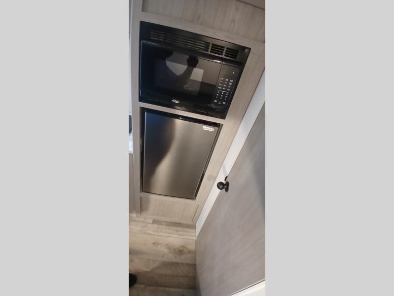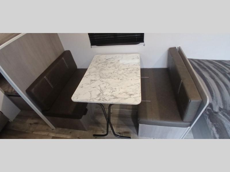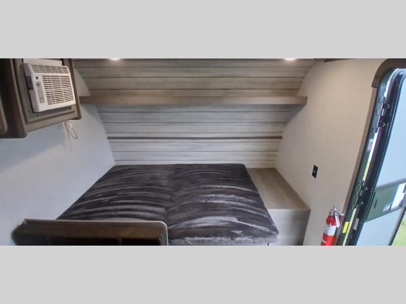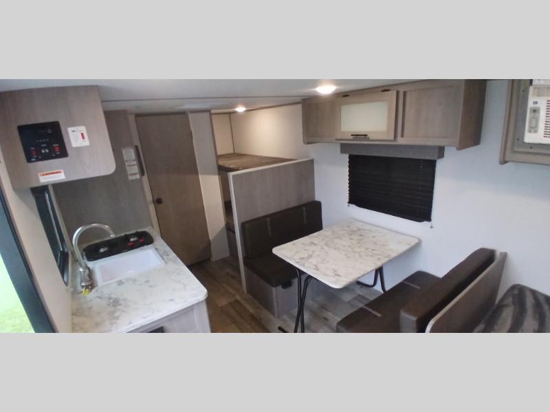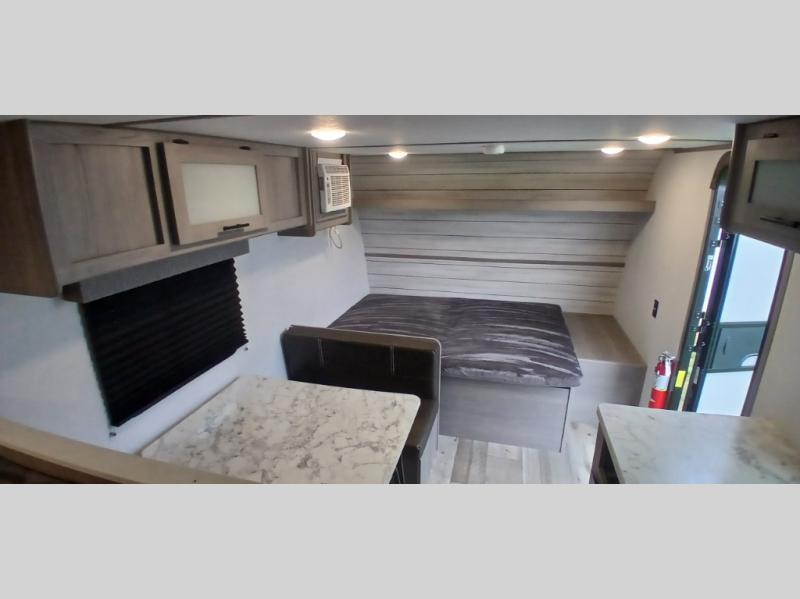 After making dinner on the two burner cooktop or inside the microwave, you can dine at the booth dinette or outside under the 8' power awning if you brought along your camping chairs. Either way you will be comfortable and the dinette may even sleep one person if needed. After playing outdoors all day, everyone can return to get cleaned up in the private bath with a shower and toilet, then fall asleep on the queen bed up front or the bunk beds in the rear corner.