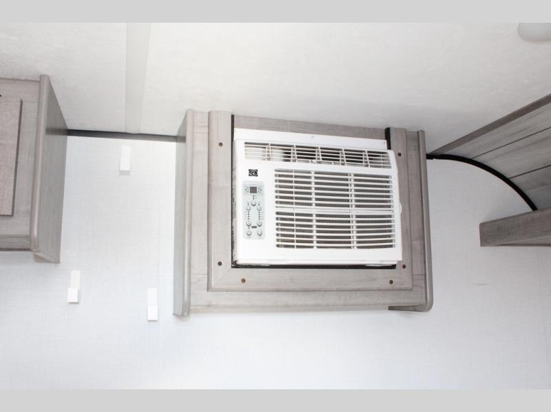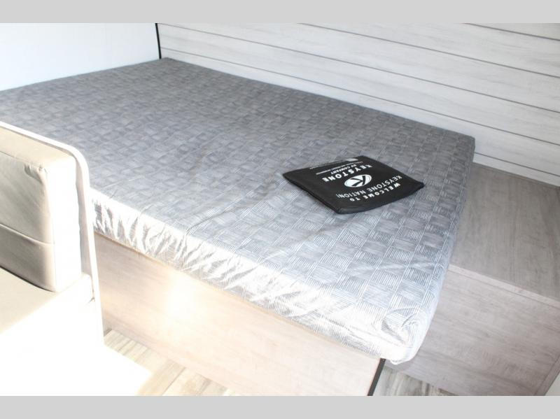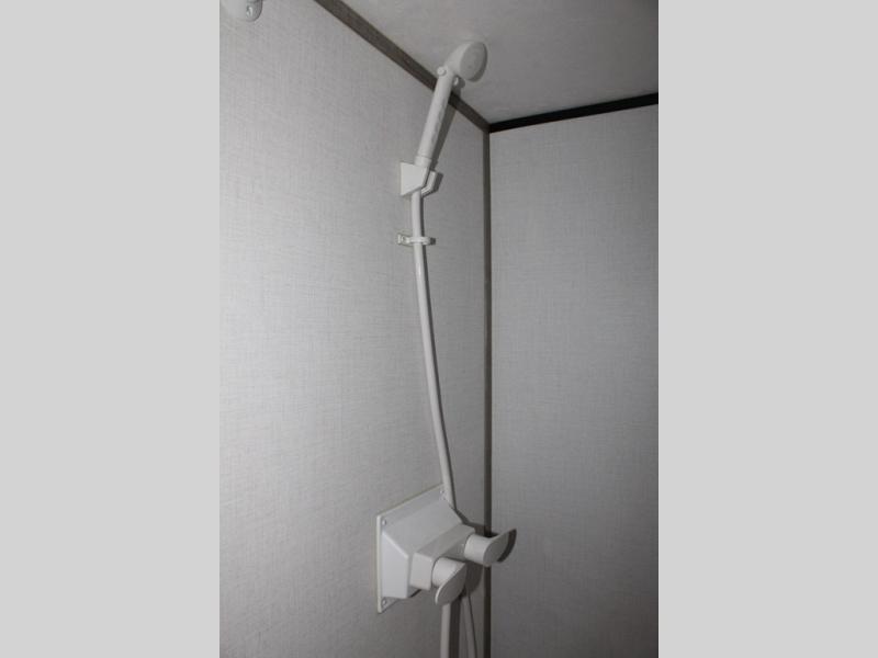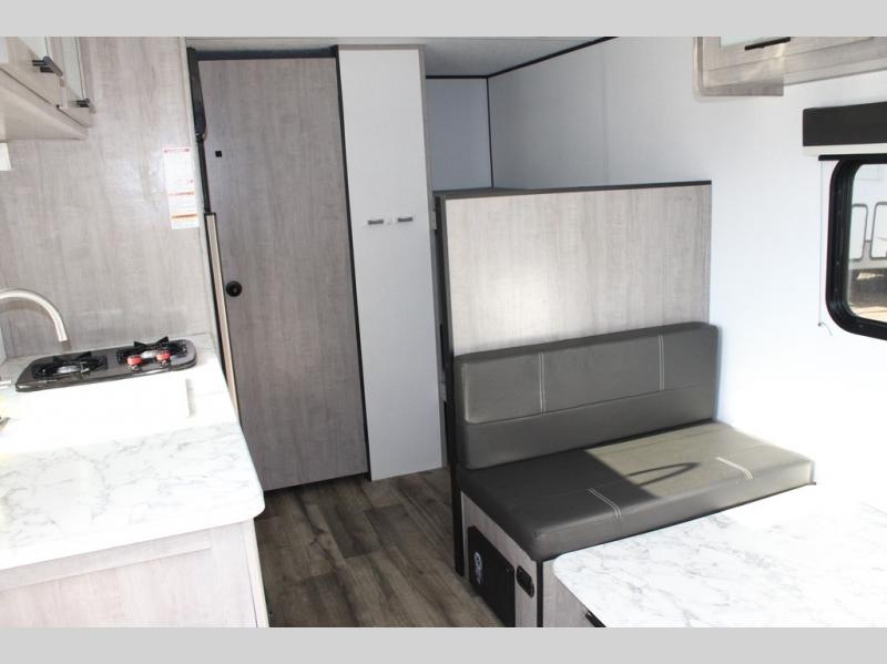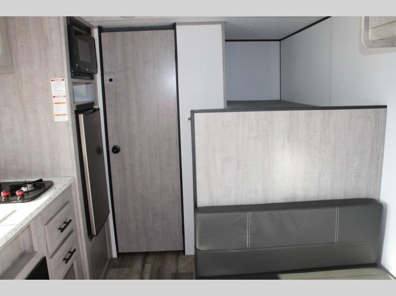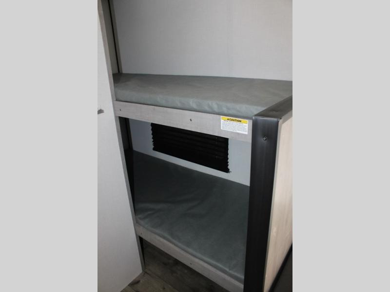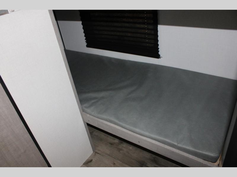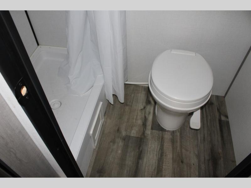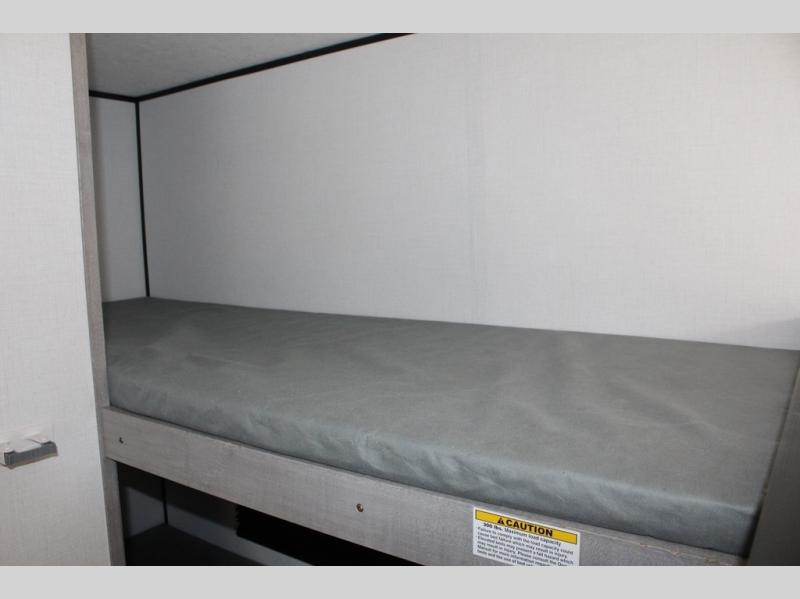 After making dinner on the two burner cooktop or inside the microwave, you can dine at the booth dinette or outside under the 8' power awning if you brought along your camping chairs. Either way you will be comfortable and the dinette may even sleep one person if needed. After playing outdoors all day, everyone can return to get cleaned up in the private bath with a shower and toilet, then fall asleep on the queen bed up front or the bunk beds in the rear corner.