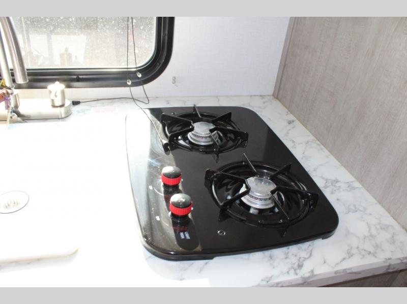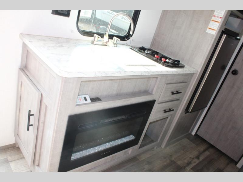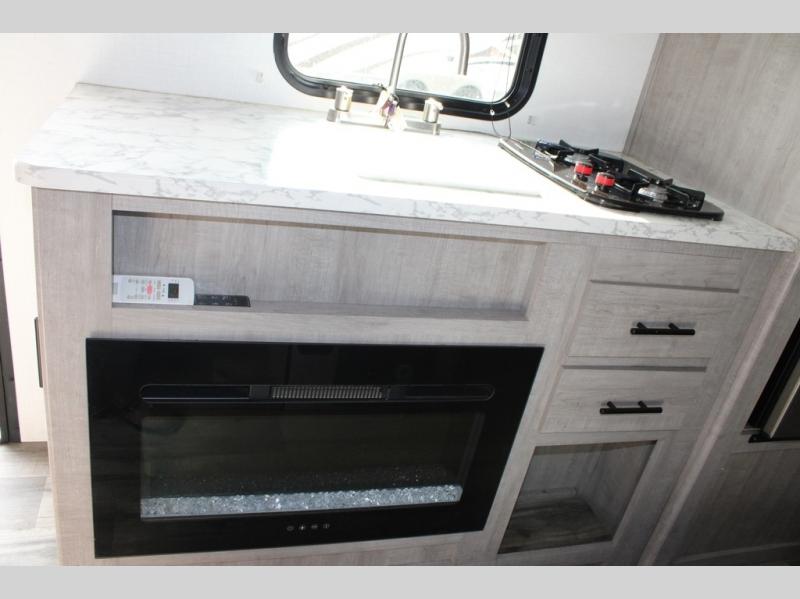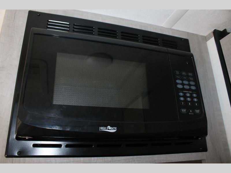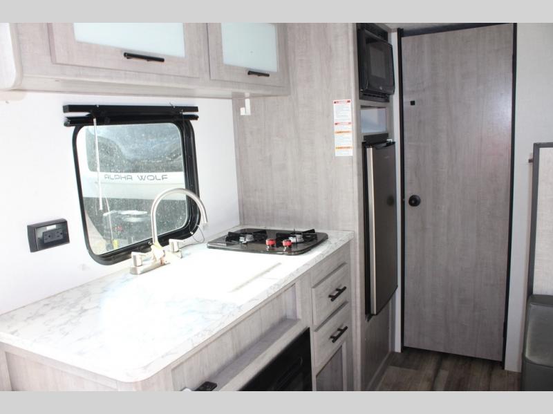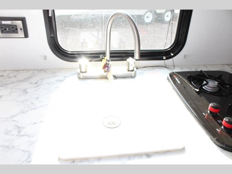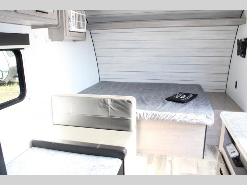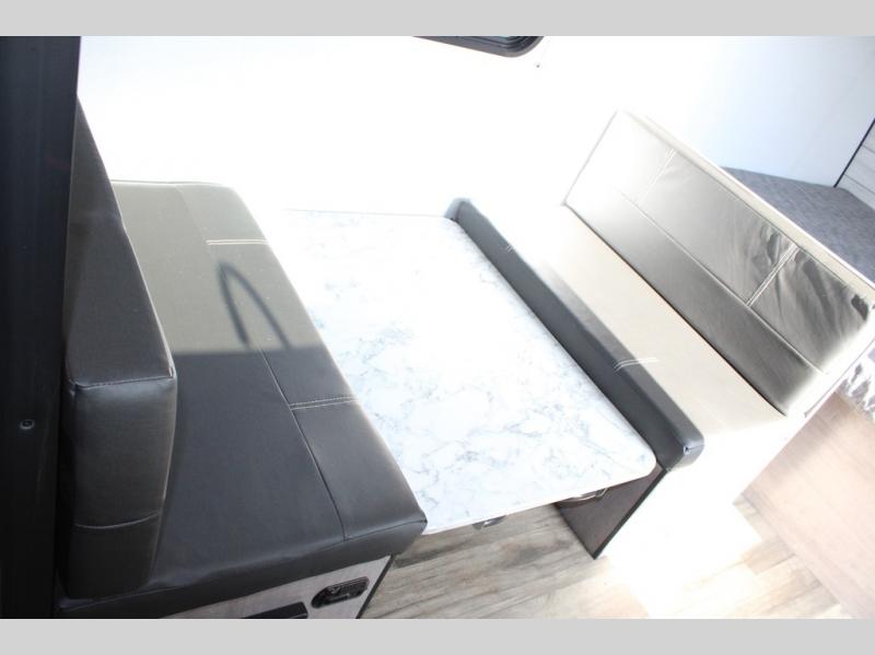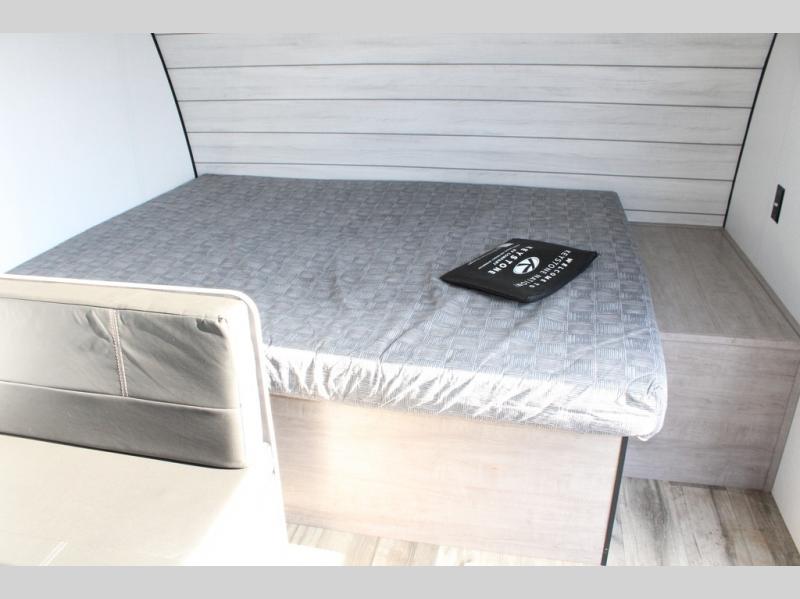 After making dinner on the two burner cooktop or inside the microwave, you can dine at the booth dinette or outside under the 8' power awning if you brought along your camping chairs. Either way you will be comfortable and the dinette may even sleep one person if needed. After playing outdoors all day, everyone can return to get cleaned up in the private bath with a shower and toilet, then fall asleep on the queen bed up front or the bunk beds in the rear corner.