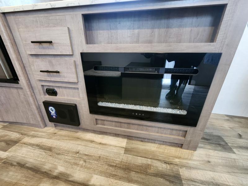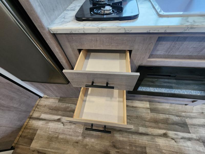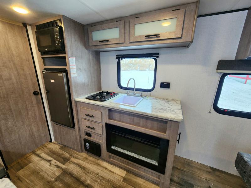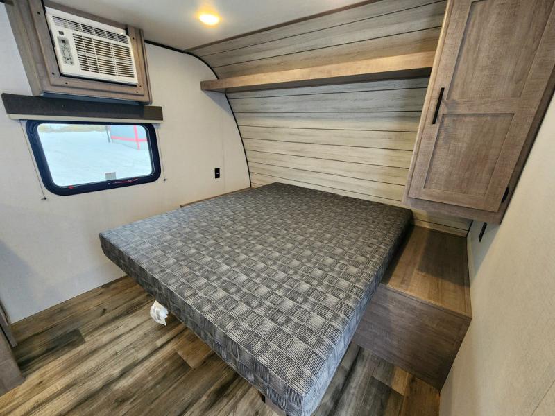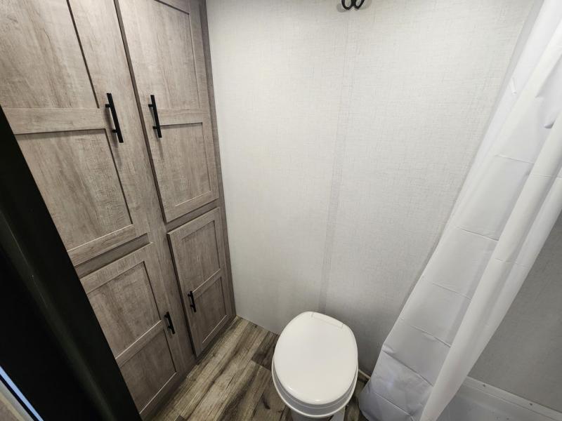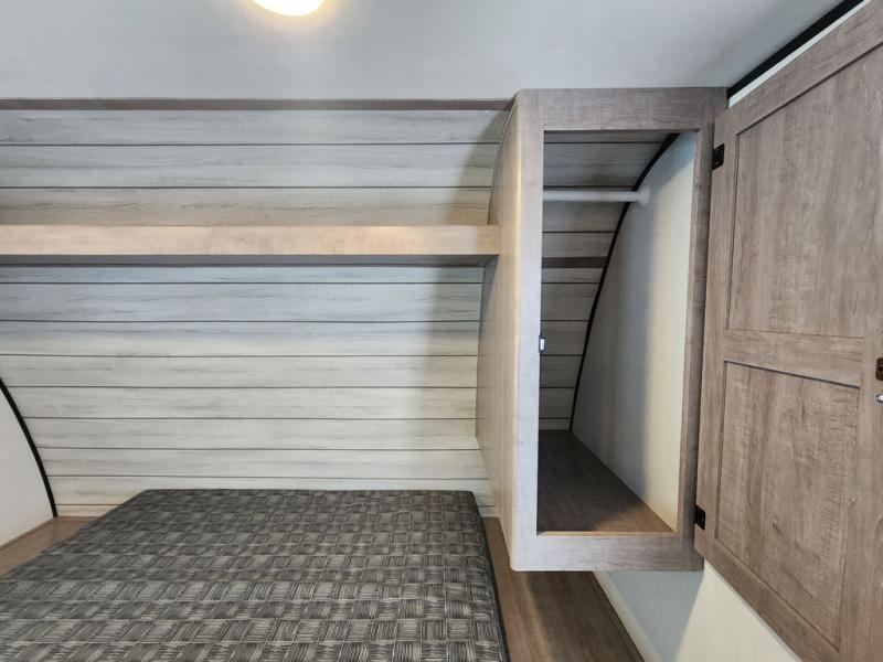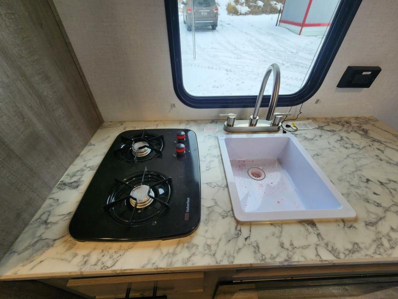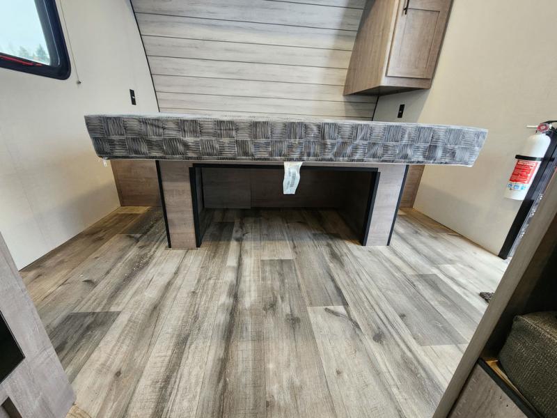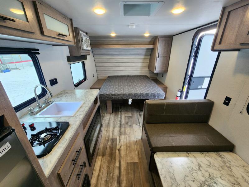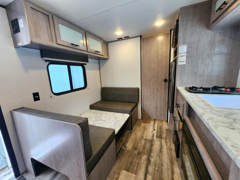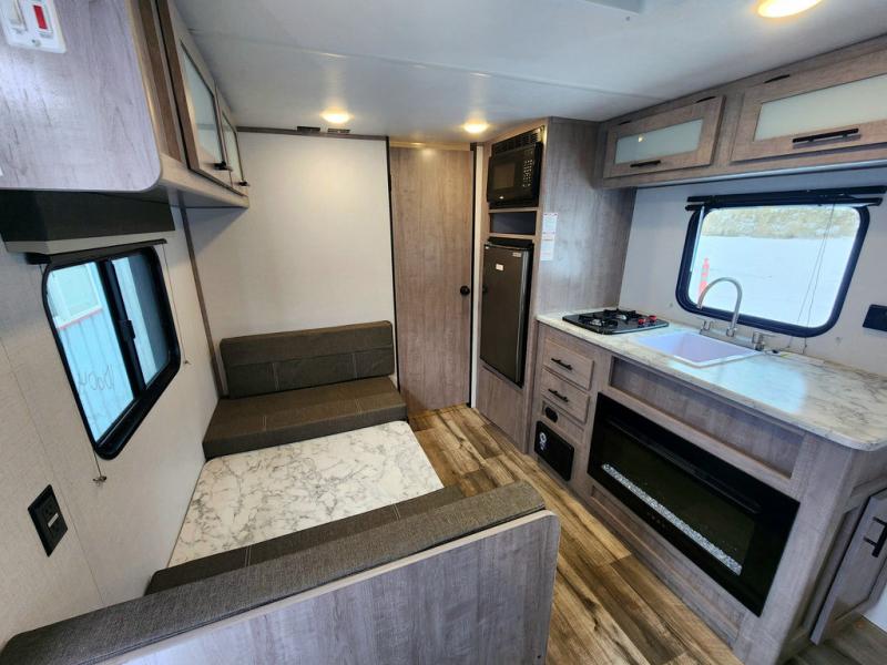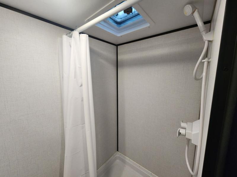 After making dinner on the two burner cooktop or microwave, you can dine at the booth dinette or outside under the power awning if you brought along your camping chairs. Either way you will be comfortable and the dinette can even be converted to sleep one person if needed. After playing outdoors all day, everyone can return to get cleaned up in the full rear bath including a walk-in shower. There is even a linen closet and space for some clothes that hang. You will get a great night's rest on the front queen bed, and the booth dinette can double as sleeping space for an extra guest or two!