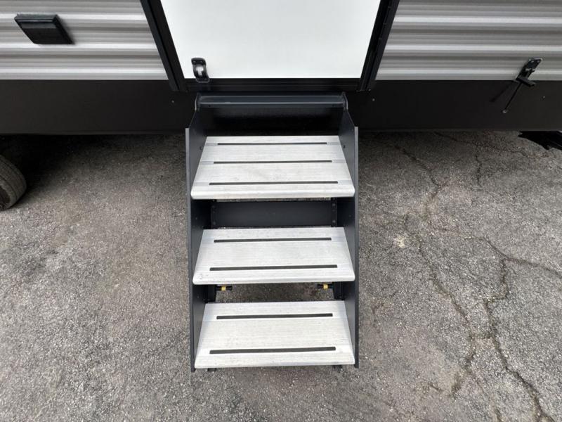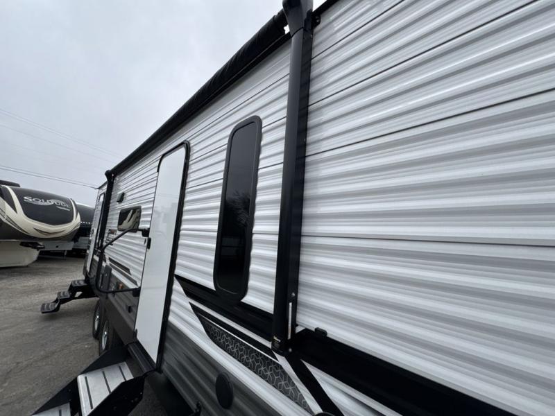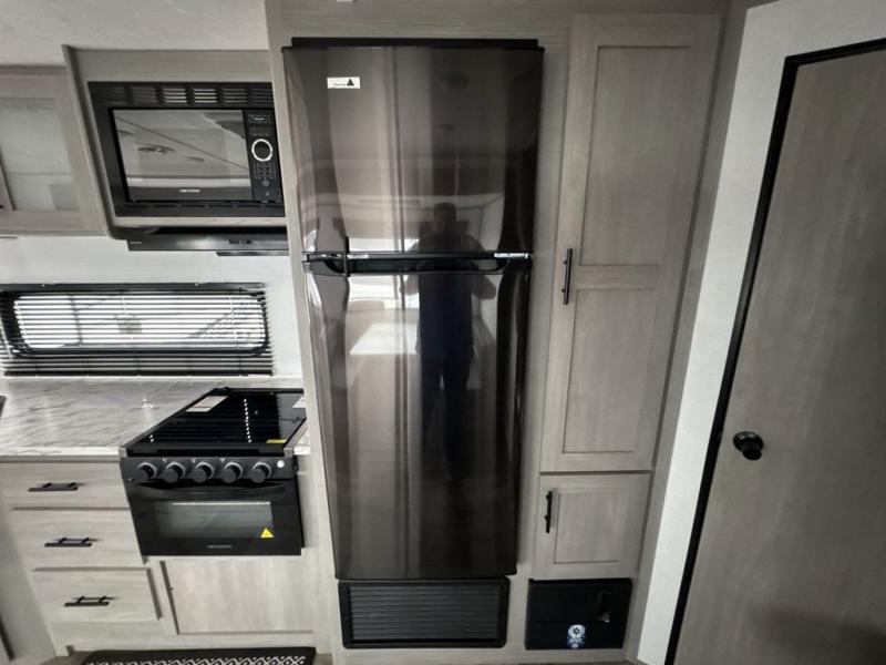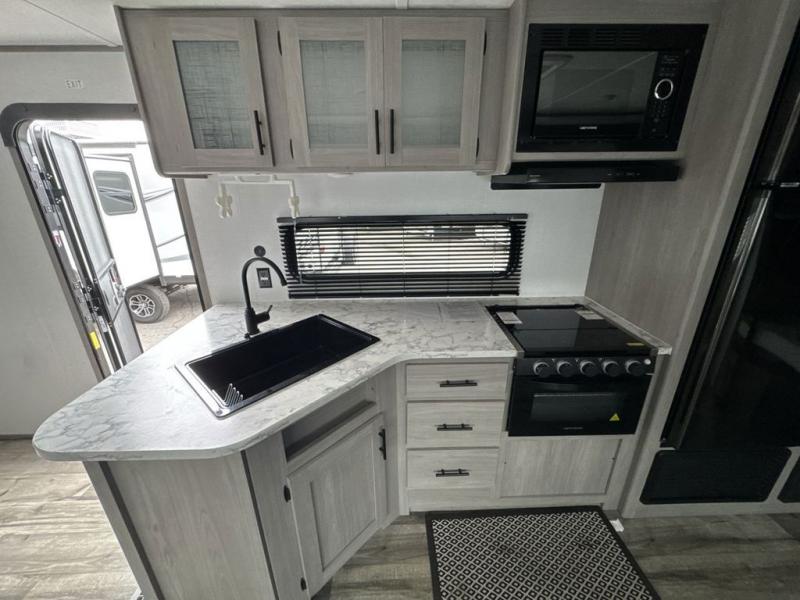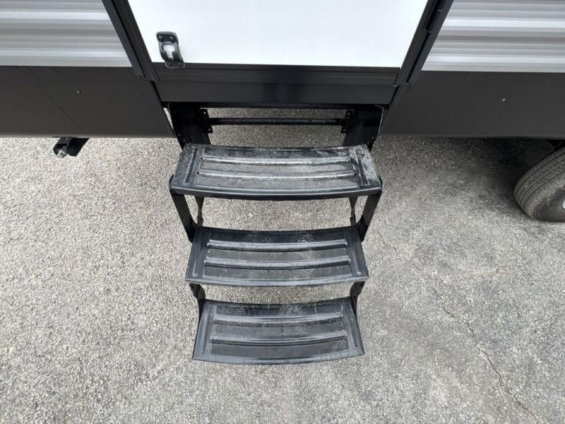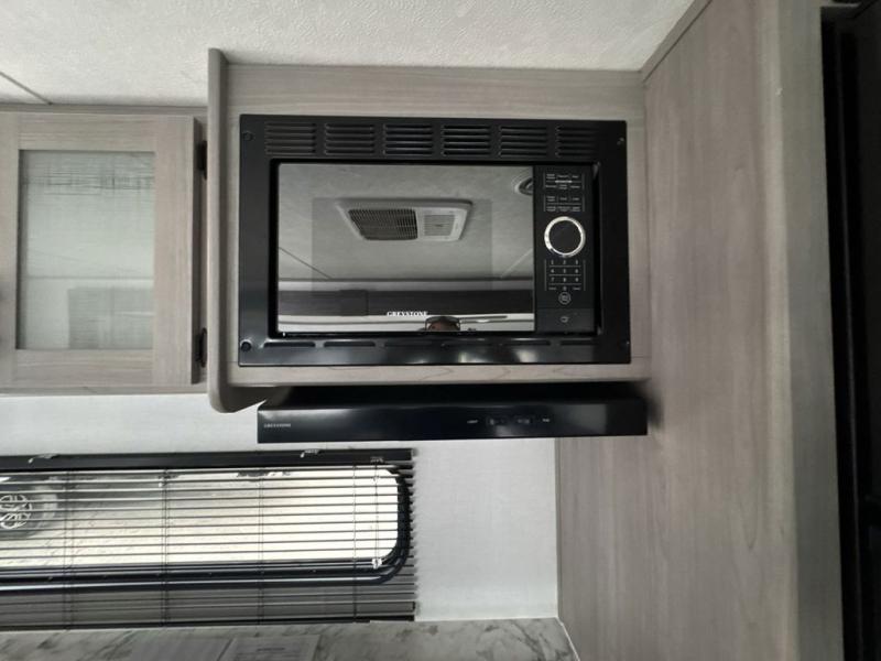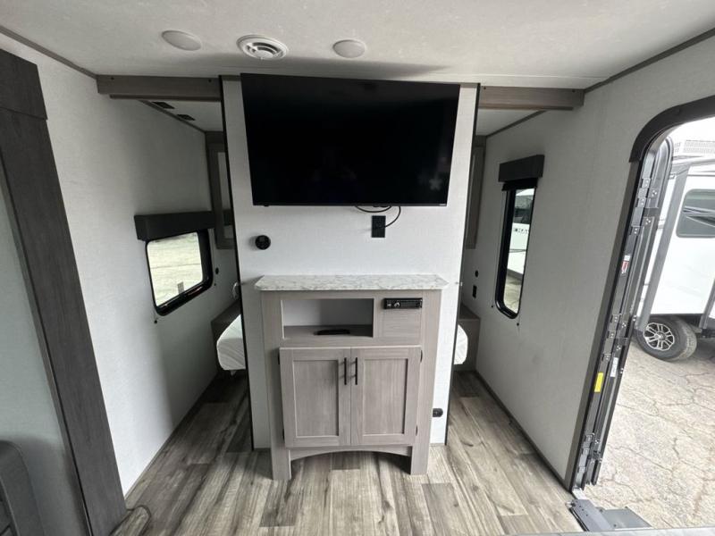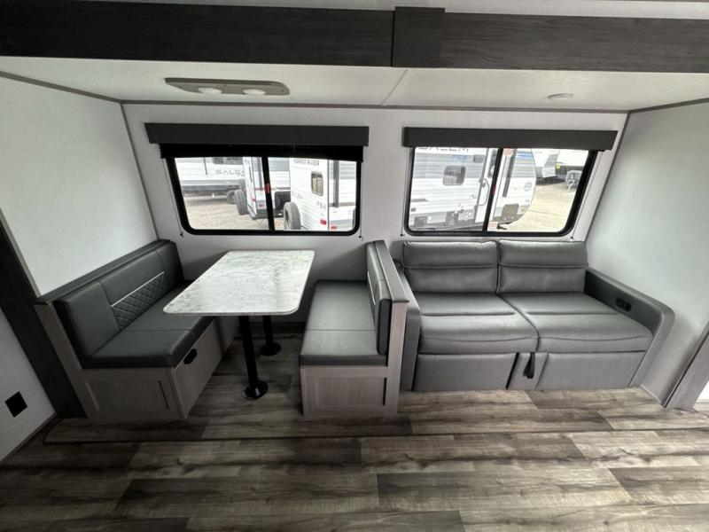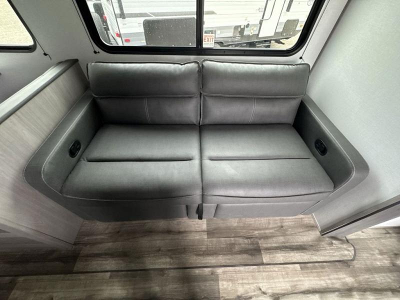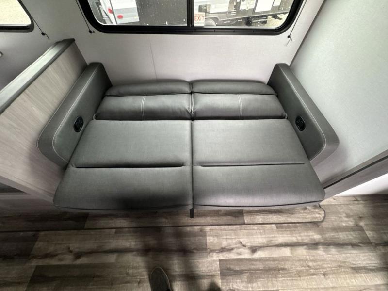 Camp comfortably with your larger group in this trailer that gives you privacy in the front bedroom with a queen bed and dual access, rear double-size bunks next to the full bathroom with the second entry/exit door to the trailer that is super convenient, and a furniture slide that includes a booth dinette and a reclining sofa that some will surely love sleeping on. The main area also includes a fireplace and kitchen appliances including a 10 cu. ft. refrigerator, a farm style sink with high rise faucet, and storage. There is more storage found outside in the pass-through compartment allowing you to take along the larger camping items like camp chairs and tables, charcoal and even fishing poles.