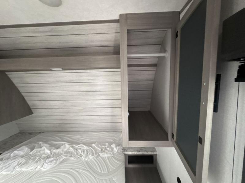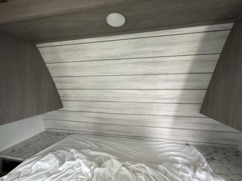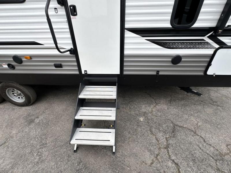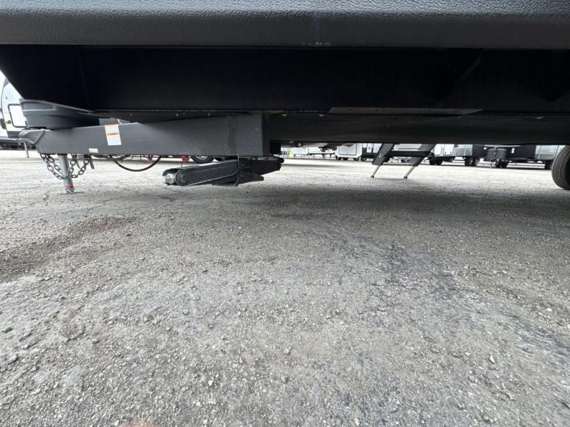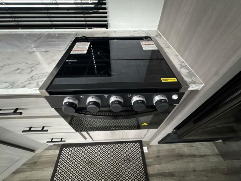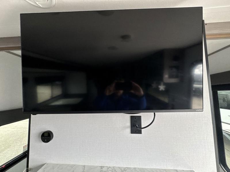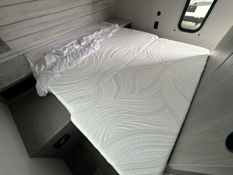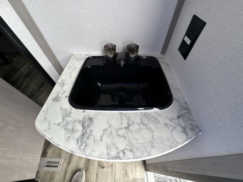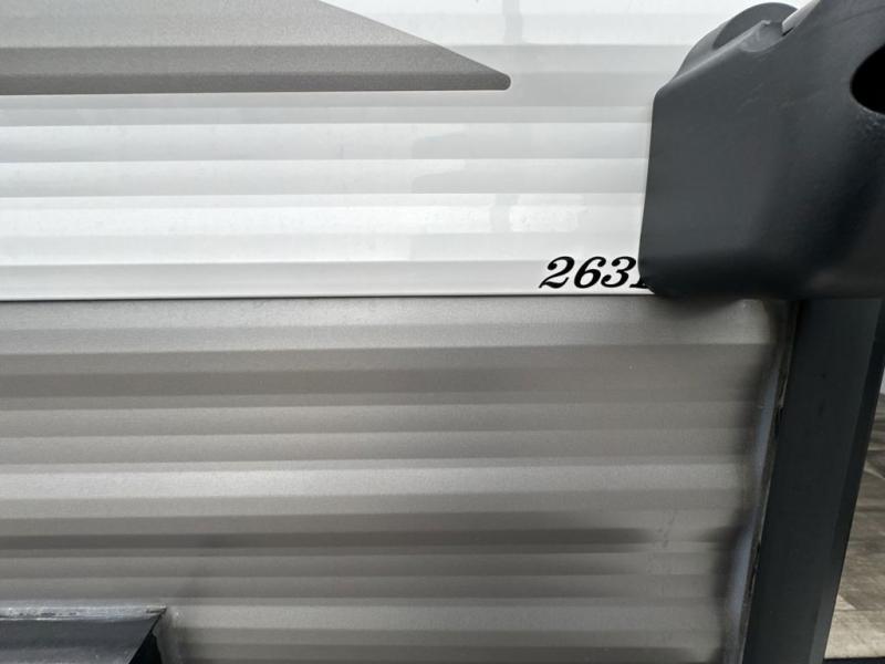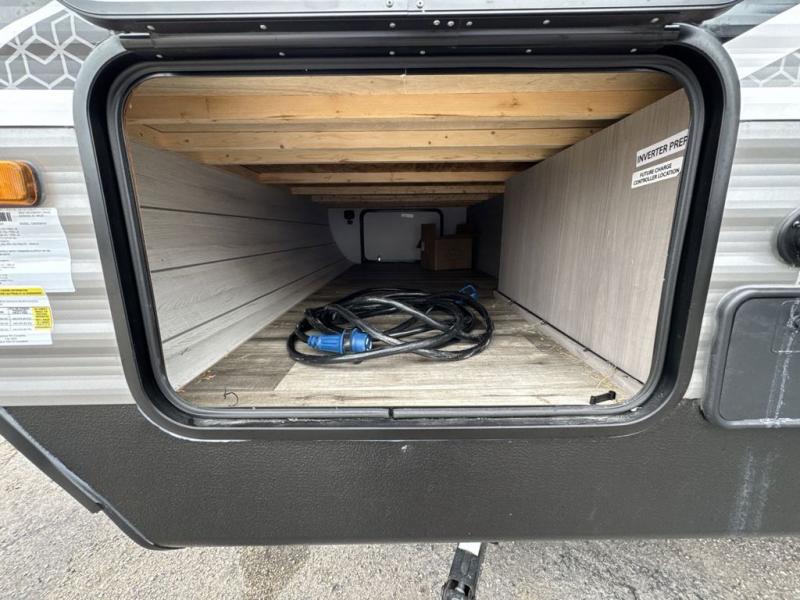Camp comfortably with your larger group in this trailer that gives you privacy in the front bedroom with a queen bed and dual access, rear double-size bunks next to the full bathroom with the second entry/exit door to the trailer that is super convenient, and a furniture slide that includes a booth dinette and a reclining sofa that some will surely love sleeping on. The main area also includes a fireplace and kitchen appliances including a 10 cu. ft. refrigerator, a farm style sink with high rise faucet, and storage. There is more storage found outside in the pass-through compartment allowing you to take along the larger camping items like camp chairs and tables, charcoal and even fishing poles.