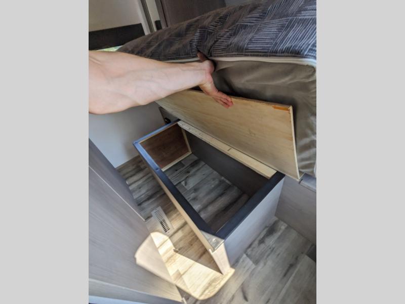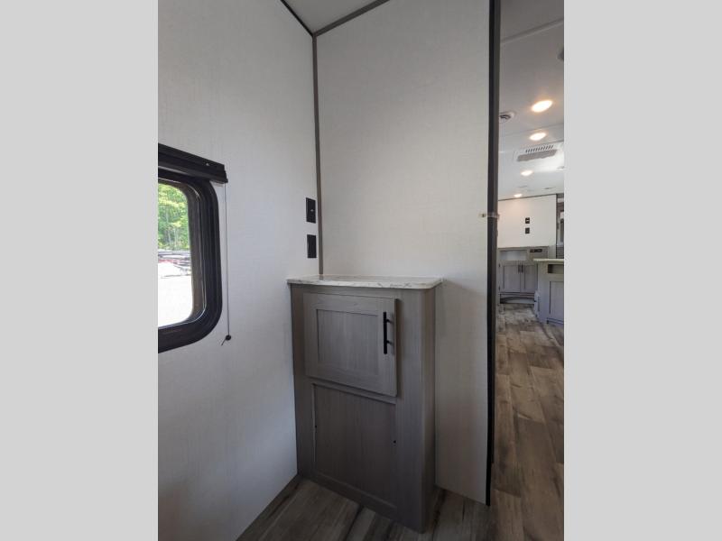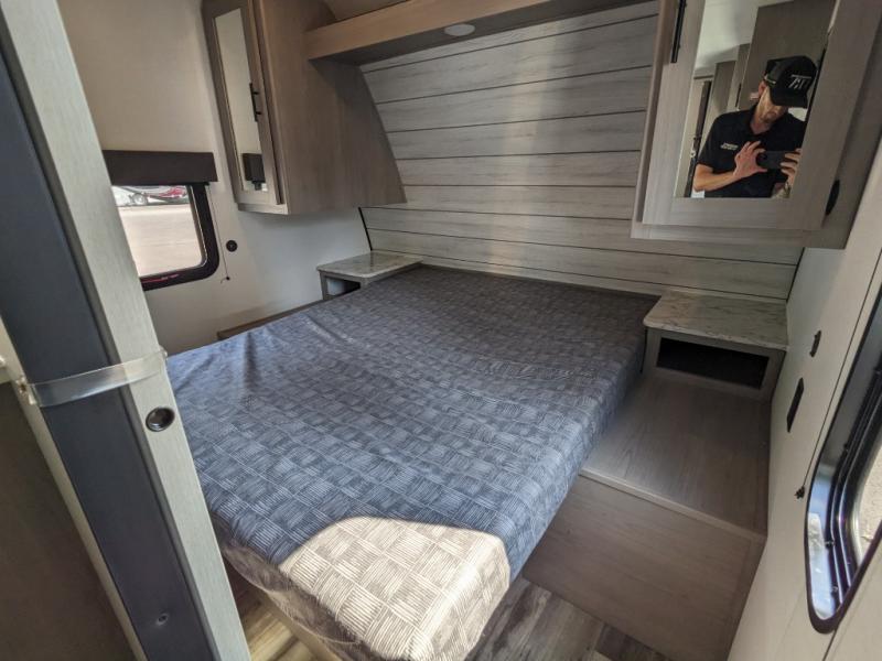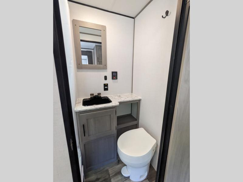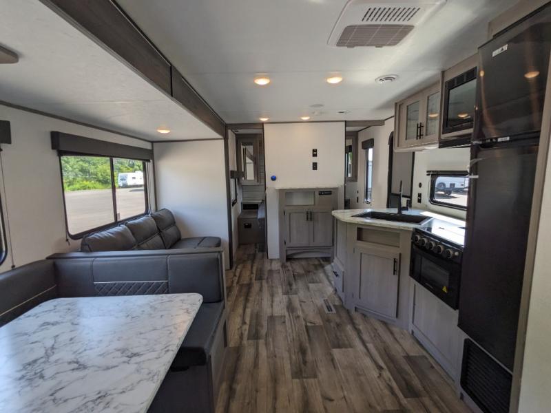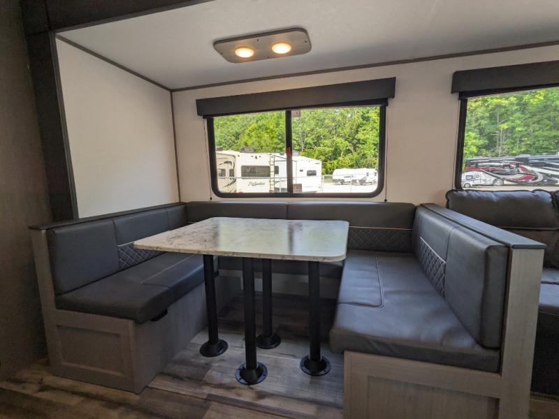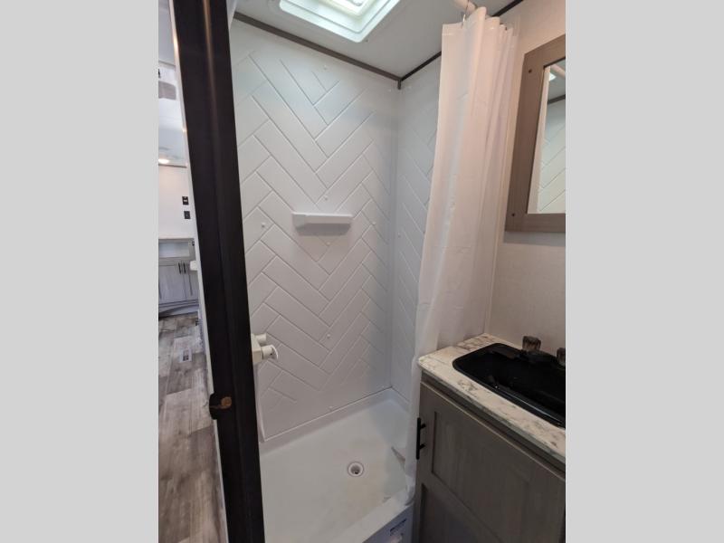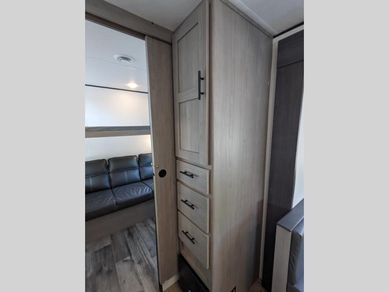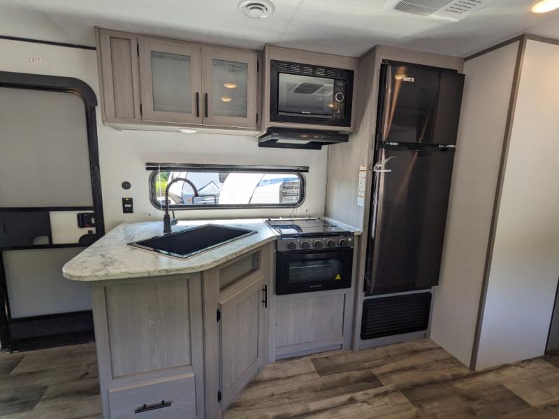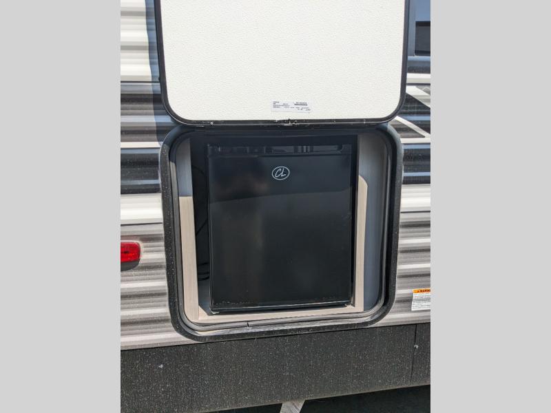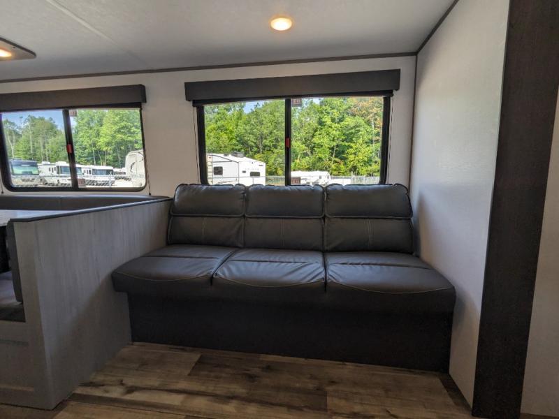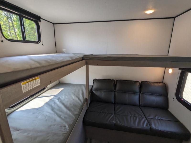 This trailer offers a private bunkhouse which is a popular feature for larger families needing lots of sleeping space! Your kids or friends will love having three bunks to choose from, plus a sofa allowing them to share bedtime stories as they talk about their day. And there is a full bathroom just outside the bunkhouse for convenience. You and your person can sleep on the opposite side in the front bedroom on a queen bed with access from each side and storage. The cook will enjoy having a farm style sink with high rise faucet, and kitchen appliances including a 10 cu. ft. refrigerator to store leftovers. There are many more features to enjoy such as the power tongue jack when setting up, the outside shower when your shoes are too dirty to bring inside, and the USB ports when you cellphone battery is low.