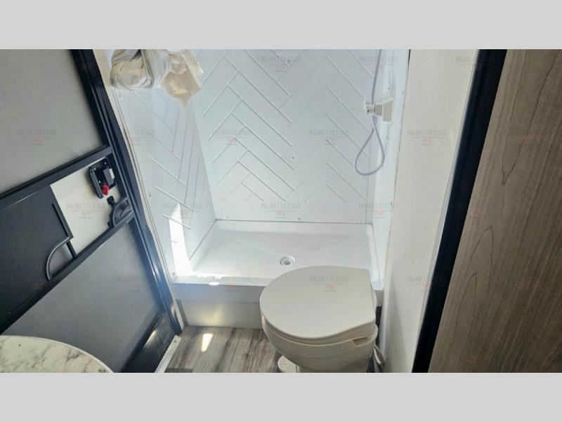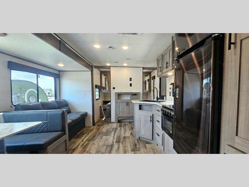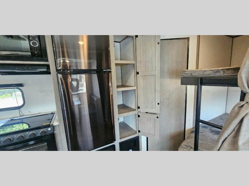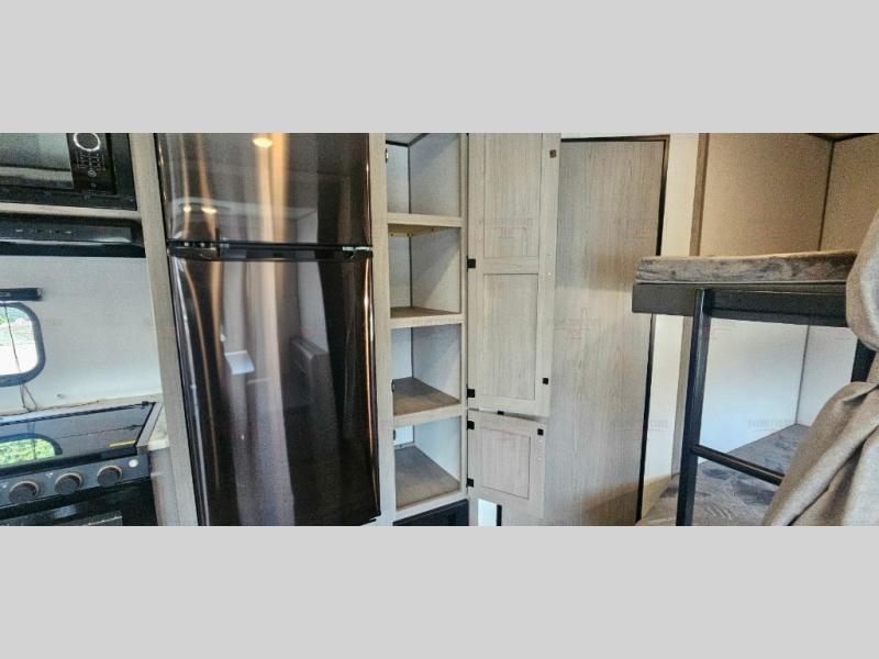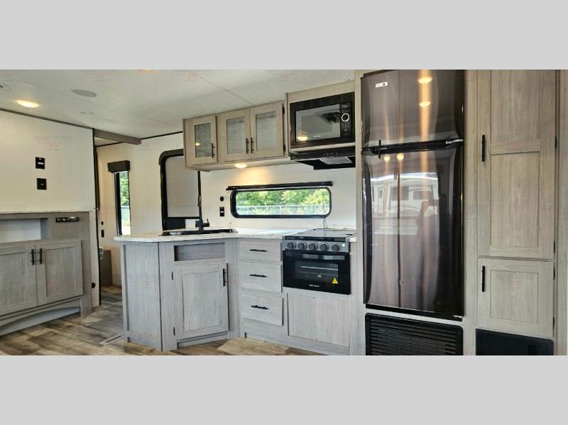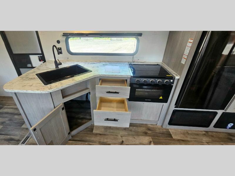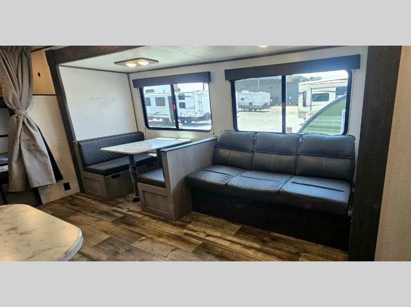 Head to the lake in this spacious travel trailer with dual entry doors, a large slide out for more space, and a front private bedroom with a cozy queen bed. Your crew can relax on the convertible sofa with kickouts, play a game at the booth dinette, or visit with campground neighbors under the 16' power awning. The chef will love cooking in the kitchen with its three burner cooktop, microwave oven, 10 cu. ft. 12V refrigerator, and farm style sink!