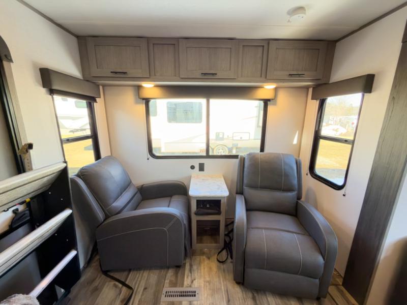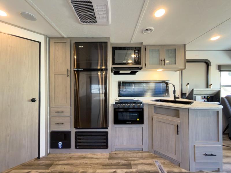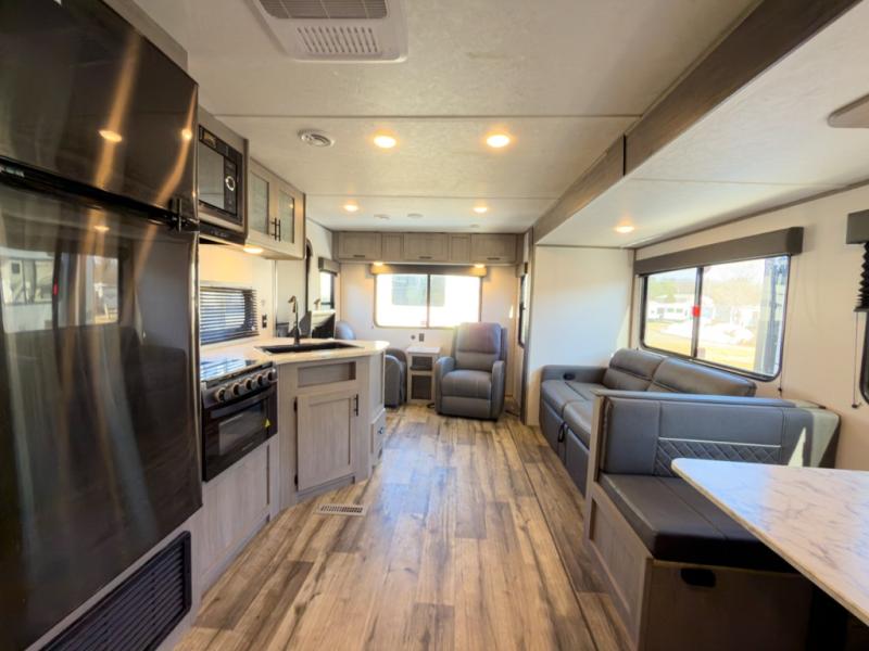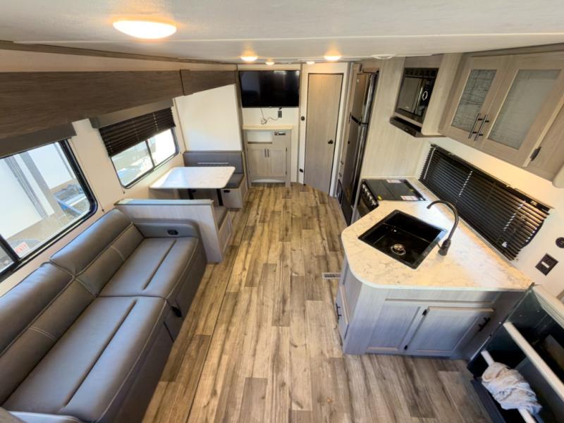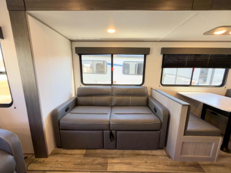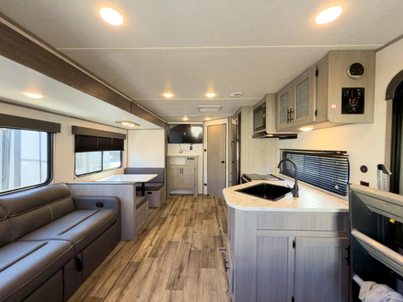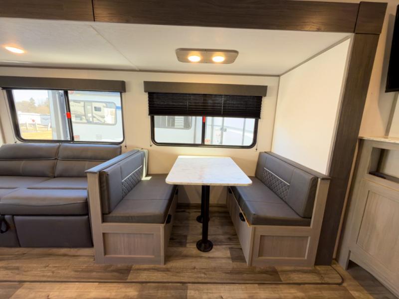 It will be so easy to enjoy camping trips in this travel trailer for four to five each night. The rear living area includes dual lounge chairs where you can relax in the evenings, or you can enjoy the convertible sofa with kickouts and dine at the booth dinette within the large slide out. And there is even a fireplace here to make your space feel more like home! The chef will have everything they need to make meals each day, including a three burner cooktop and oven, a farm style sink, and a pantry for snacks. A walk-through bath includes a radius walk-in shower to clean up in each day, and the front master bedroom includes one of the dual entry doors so you can quietly slip out in the morning to fish!