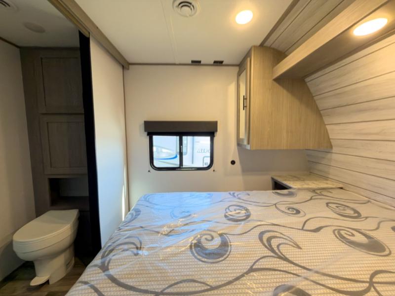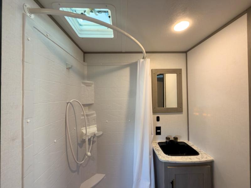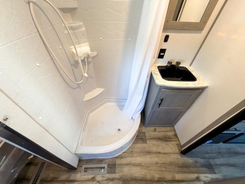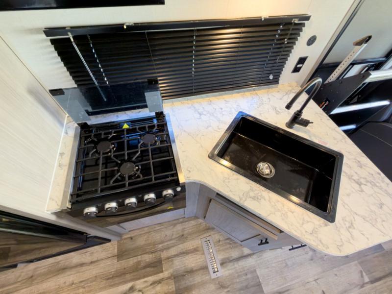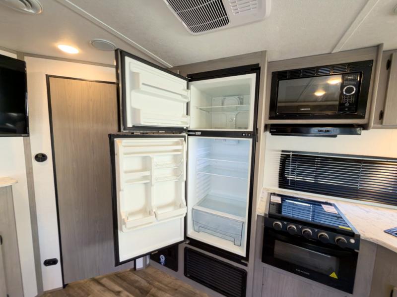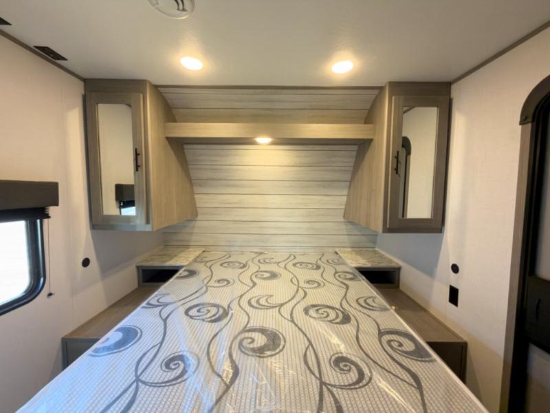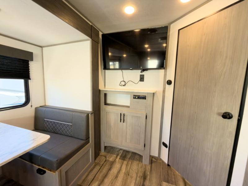 It will be so easy to enjoy camping trips in this travel trailer for four to five each night. The rear living area includes dual lounge chairs where you can relax in the evenings, or you can enjoy the convertible sofa with kickouts and dine at the booth dinette within the large slide out. And there is even a fireplace here to make your space feel more like home! The chef will have everything they need to make meals each day, including a three burner cooktop and oven, a farm style sink, and a pantry for snacks. A walk-through bath includes a radius walk-in shower to clean up in each day, and the front master bedroom includes one of the dual entry doors so you can quietly slip out in the morning to fish!