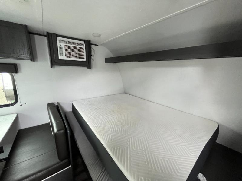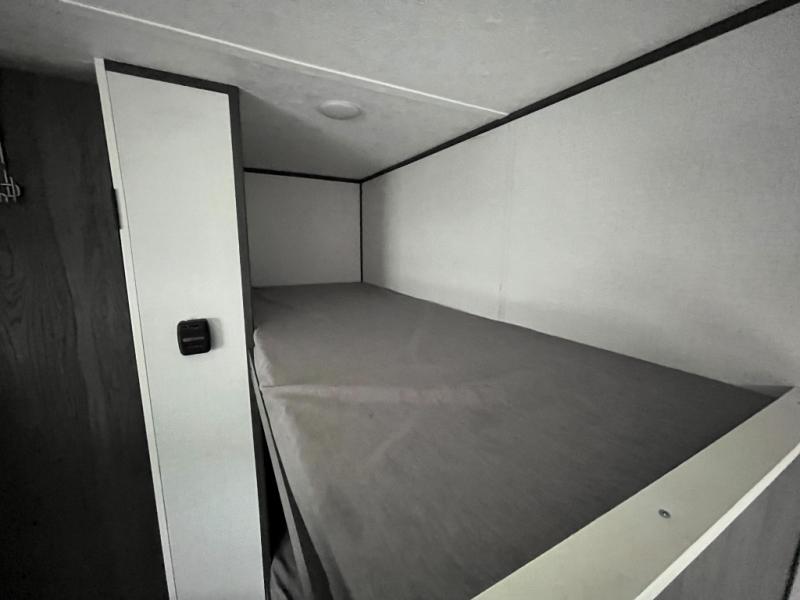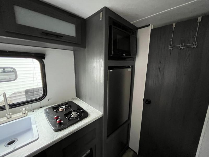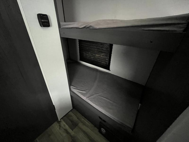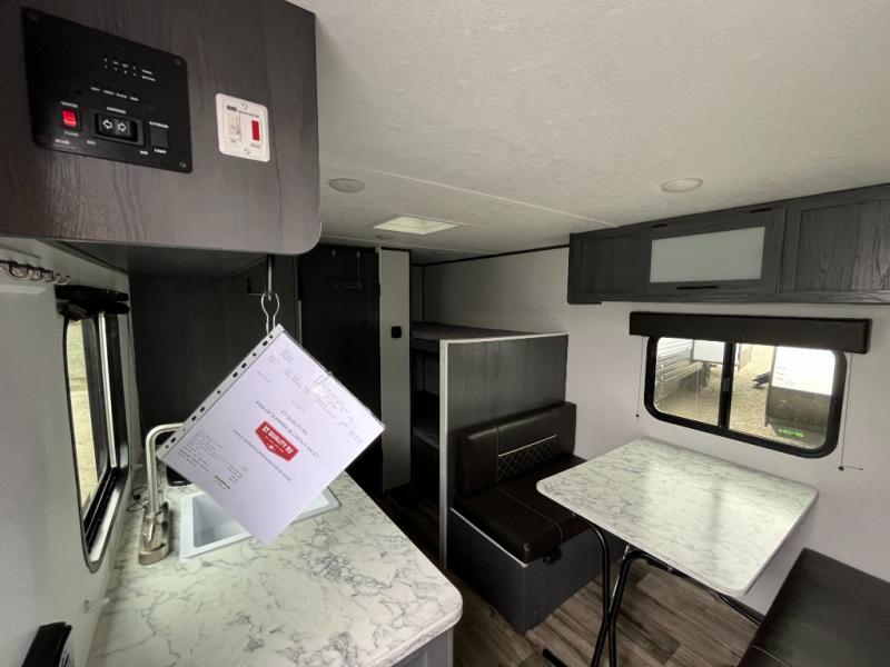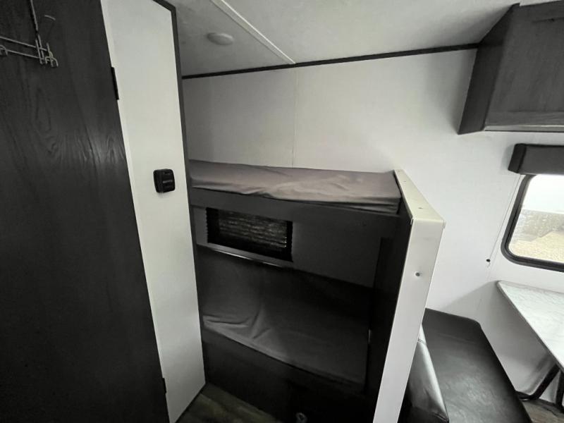 A perfect trailer for your family of three to five featuring a set of bunk beds for the kids or guests, a queen bed up front for you, and the booth dinette can be converted to sleep one or two more depending on size. This unit is cozy and convenient providing you just what you need to enjoy a little adventure away from home. For meals, there is a two burner cooktop and sink, plus a 3.3 cu. ft. 12V refrigerator for your perishables. You will all appreciate the convenience of having your own private bath so that you don't need to use the campground facilities at night. You will also enjoy spending time outside with an 8' power awning to provide even more living space outdoors!