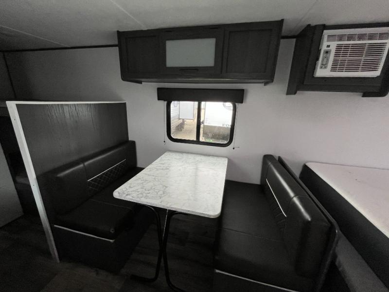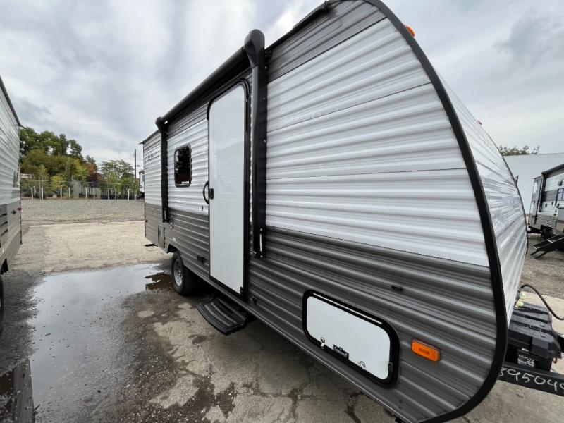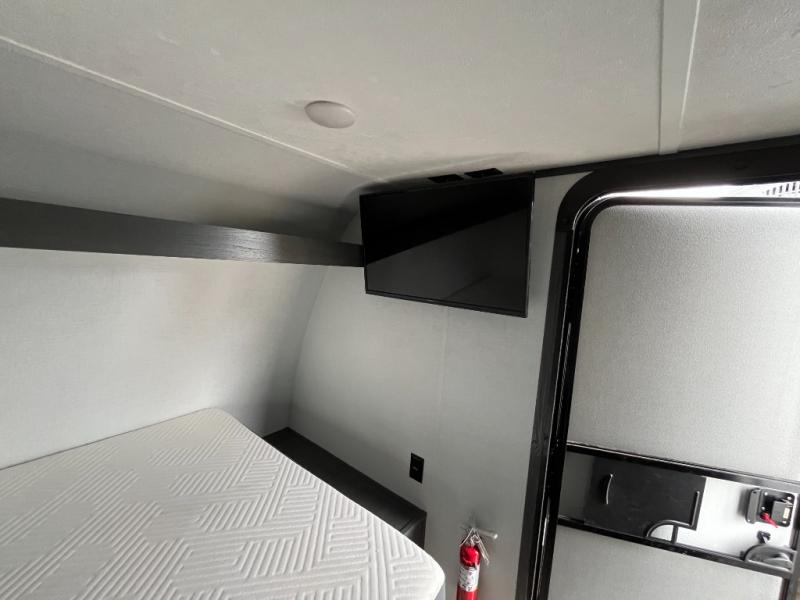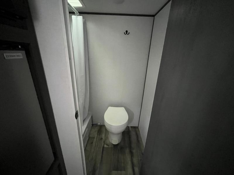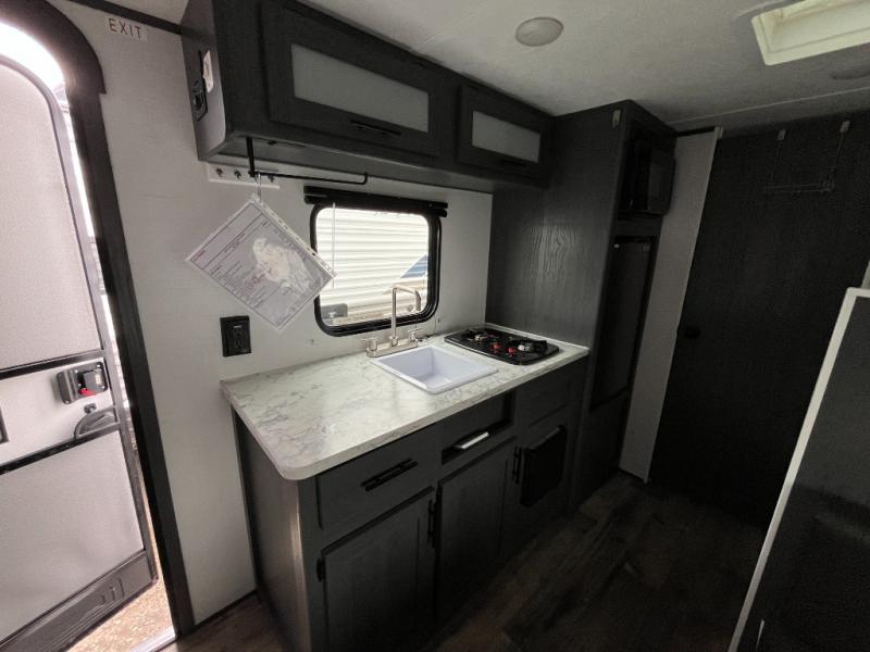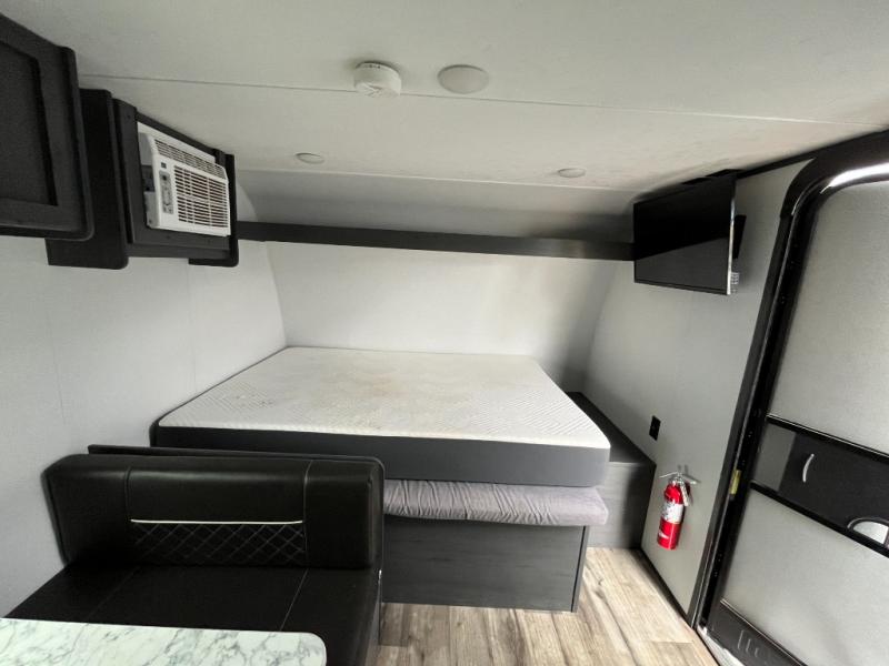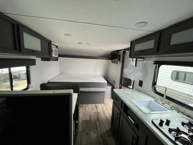 A perfect trailer for your family of three to five featuring a set of bunk beds for the kids or guests, a queen bed up front for you, and the booth dinette can be converted to sleep one or two more depending on size. This unit is cozy and convenient providing you just what you need to enjoy a little adventure away from home. For meals, there is a two burner cooktop and sink, plus a 3.3 cu. ft. 12V refrigerator for your perishables. You will all appreciate the convenience of having your own private bath so that you don't need to use the campground facilities at night. You will also enjoy spending time outside with an 8' power awning to provide even more living space outdoors!