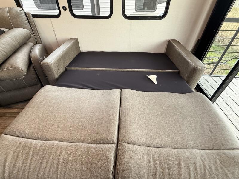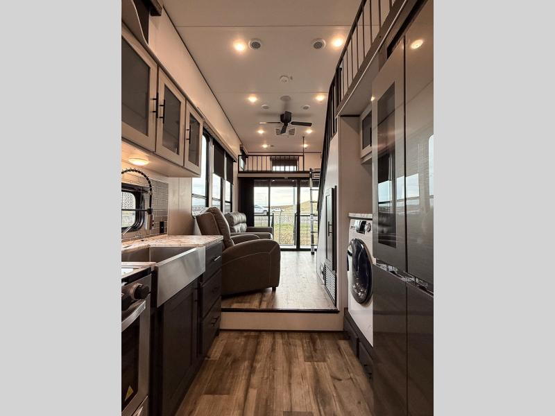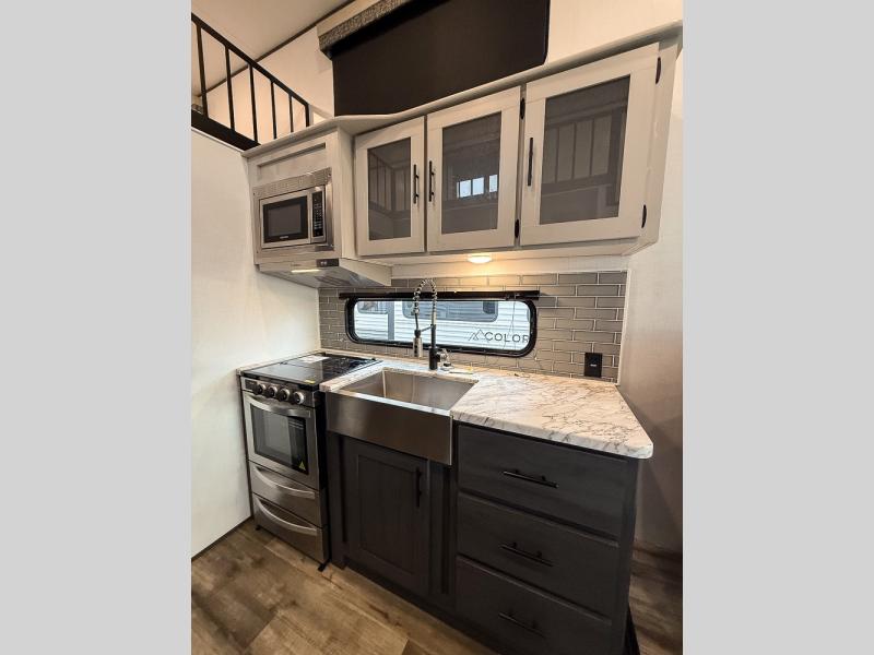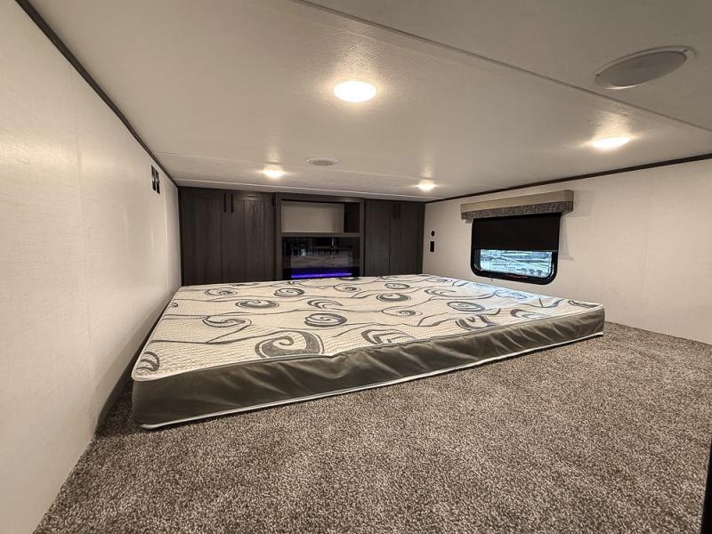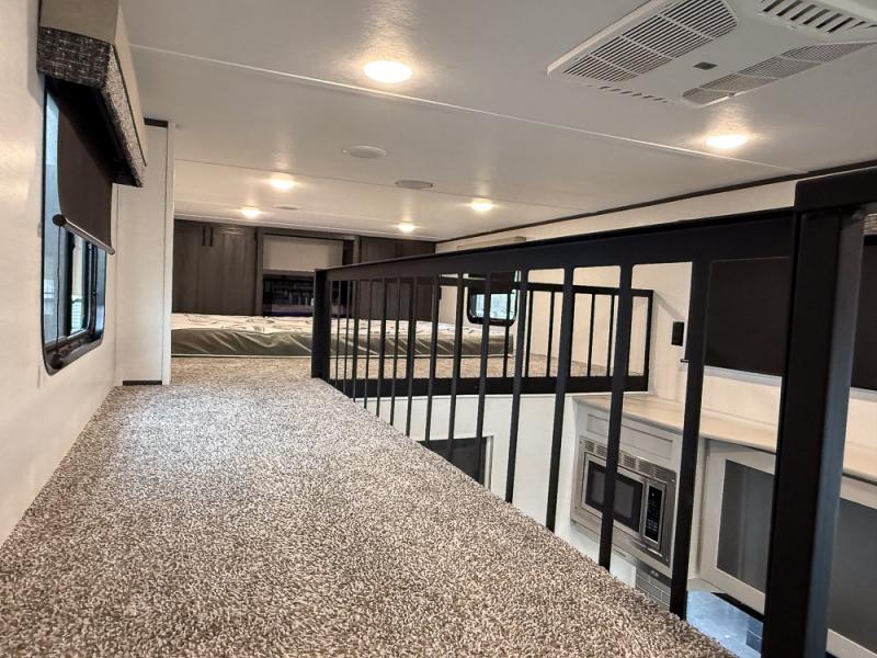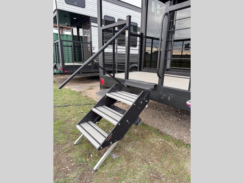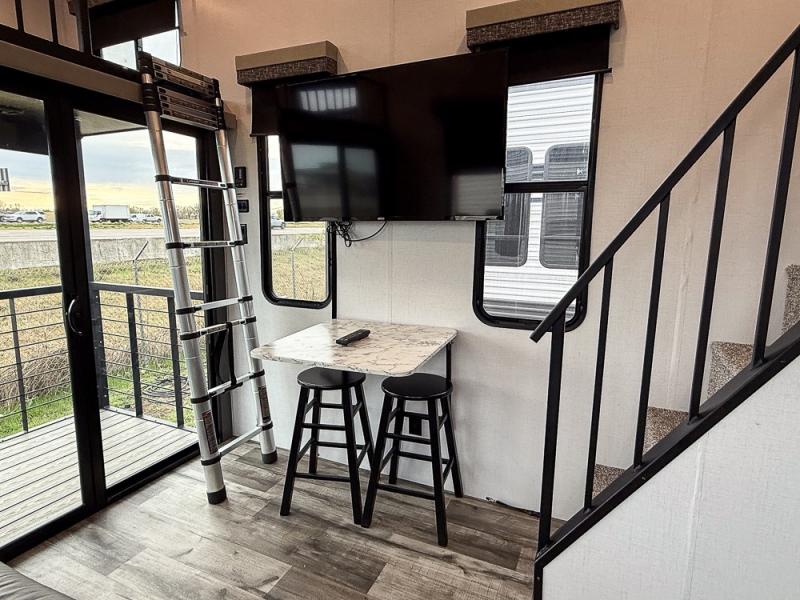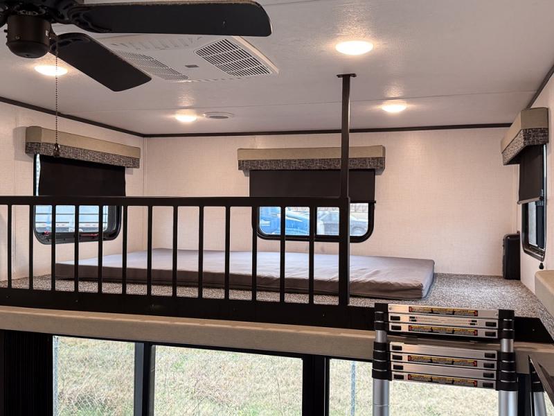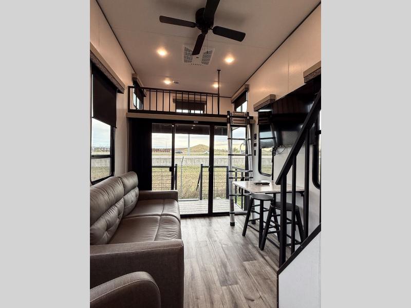 You'll love extended stays in this loft model! Not only is there a loft above the front bedroom, but there is a second loft above the rear covered porch. This is also where you'll find one of the dual entry doors for convenience. The main living area includes a sofa, lounge chair, plus a table with two chairs so you can relax, dine, and play a board game in the evenings. A fully equipped kitchen will let you make meals each day, and the walk-thru bath onboard means you won't have to use the camp's facilities!