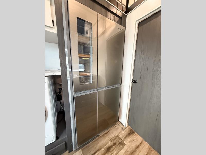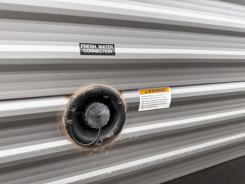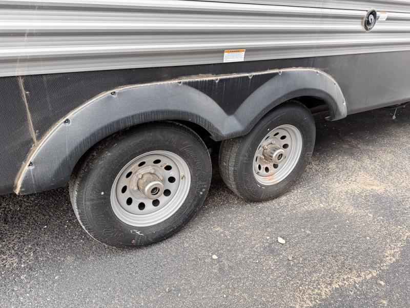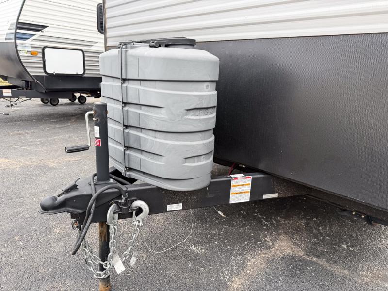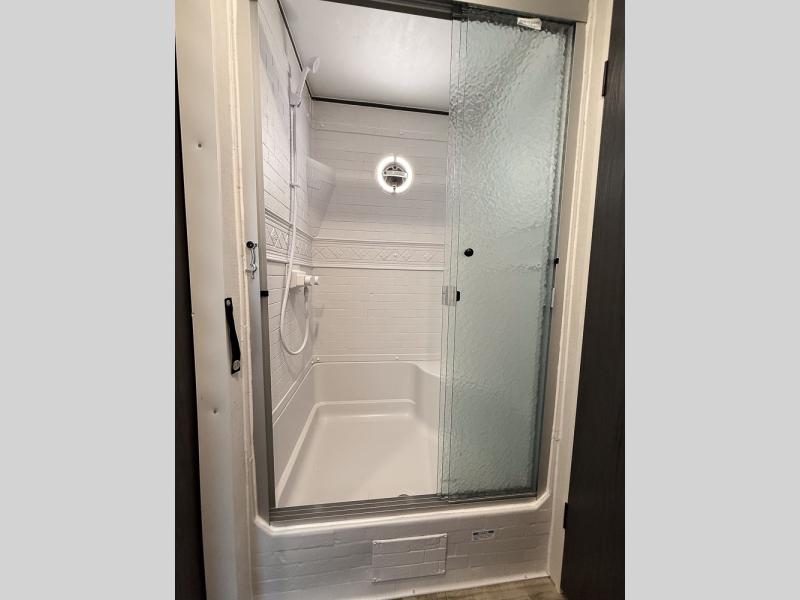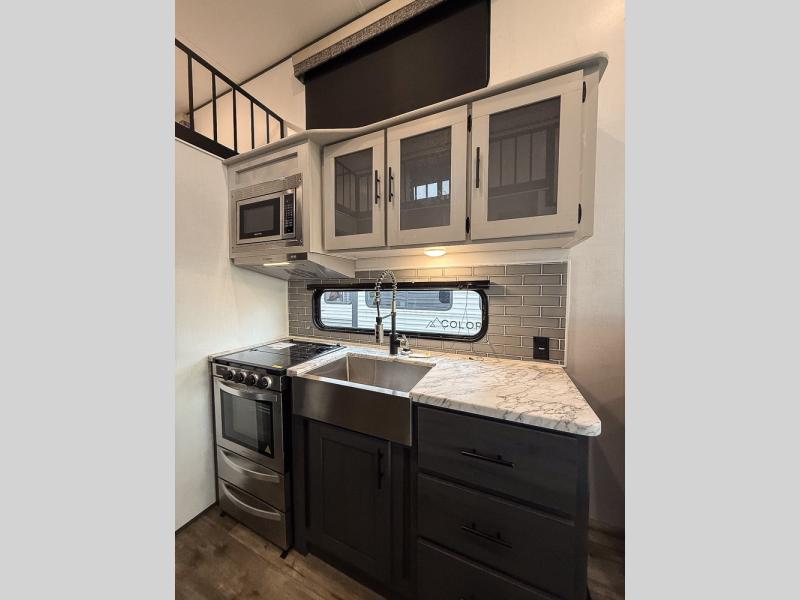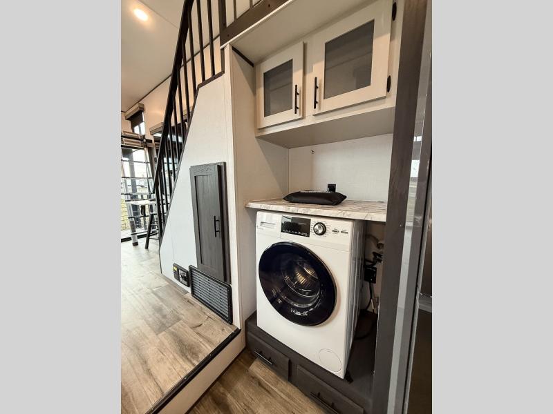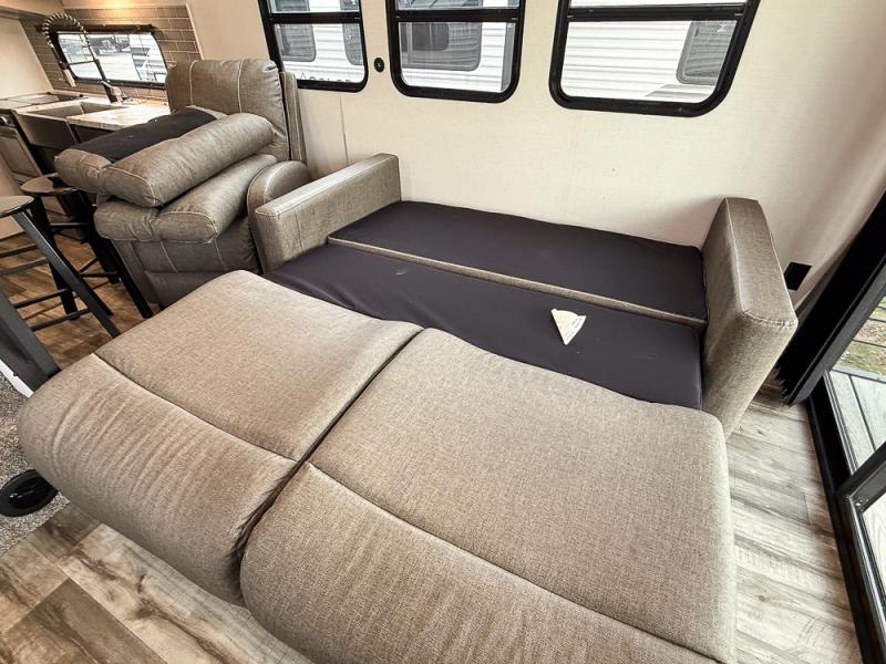 You'll love extended stays in this loft model! Not only is there a loft above the front bedroom, but there is a second loft above the rear covered porch. This is also where you'll find one of the dual entry doors for convenience. The main living area includes a sofa, lounge chair, plus a table with two chairs so you can relax, dine, and play a board game in the evenings. A fully equipped kitchen will let you make meals each day, and the walk-thru bath onboard means you won't have to use the camp's facilities!