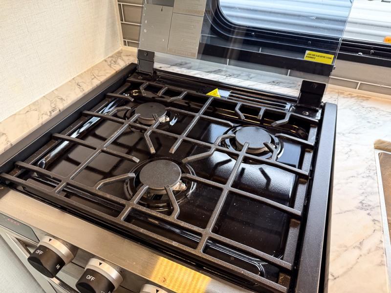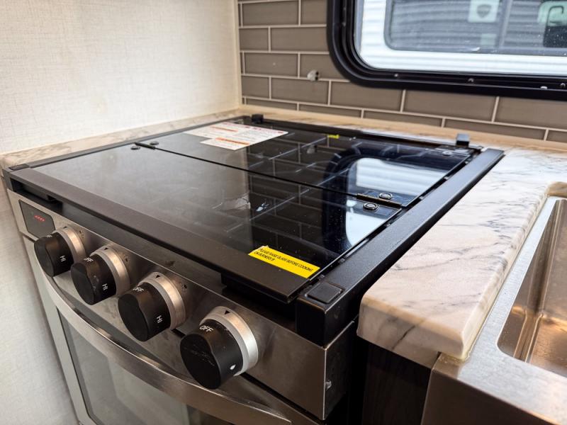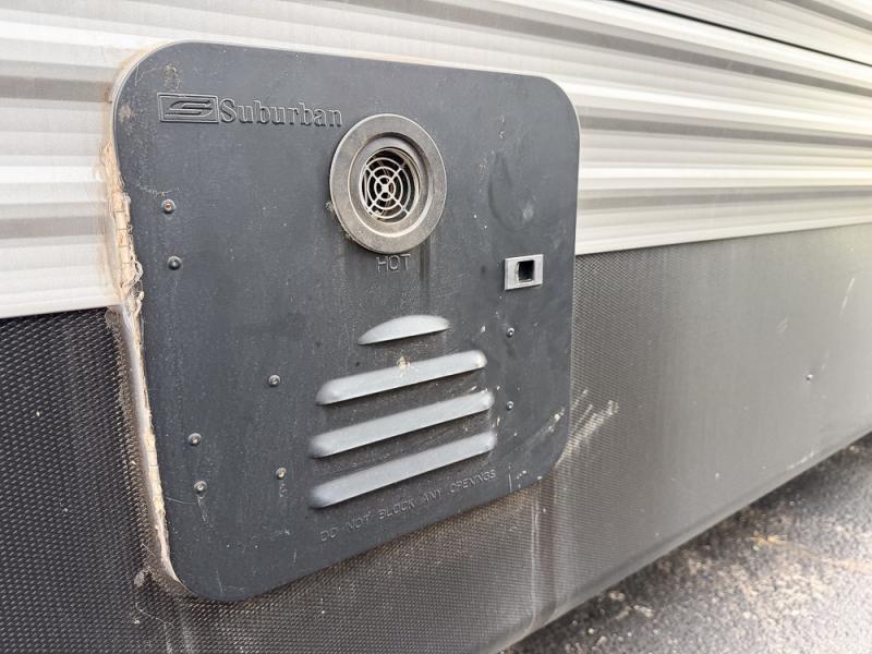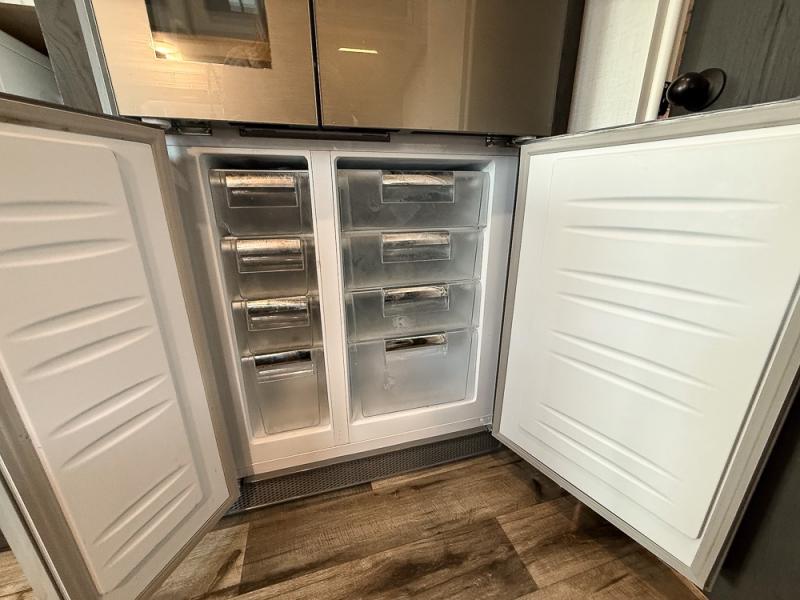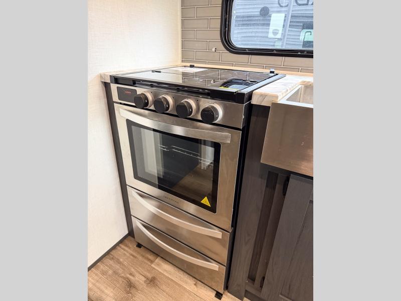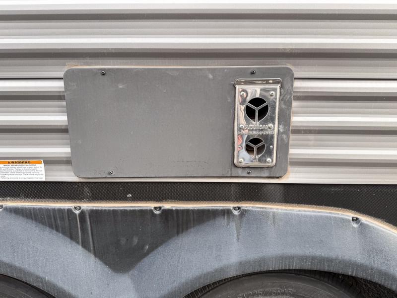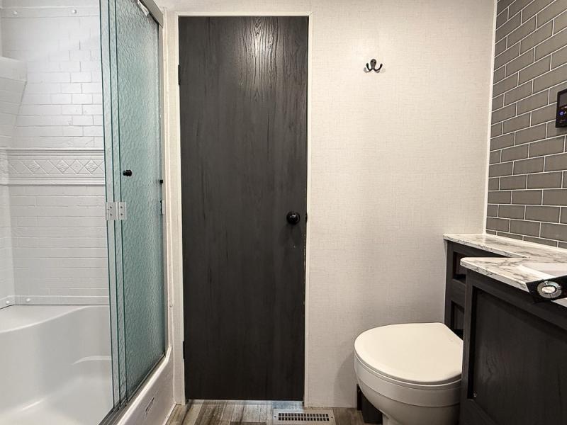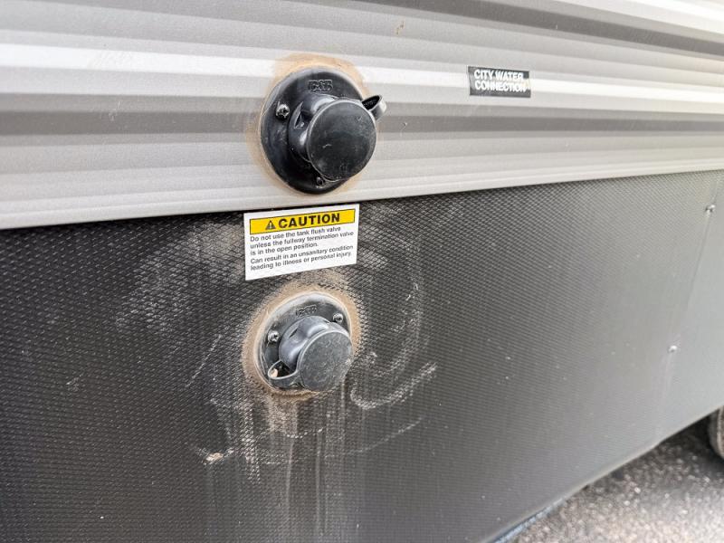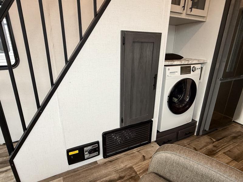 You'll love extended stays in this loft model! Not only is there a loft above the front bedroom, but there is a second loft above the rear covered porch. This is also where you'll find one of the dual entry doors for convenience. The main living area includes a sofa, lounge chair, plus a table with two chairs so you can relax, dine, and play a board game in the evenings. A fully equipped kitchen will let you make meals each day, and the walk-thru bath onboard means you won't have to use the camp's facilities!