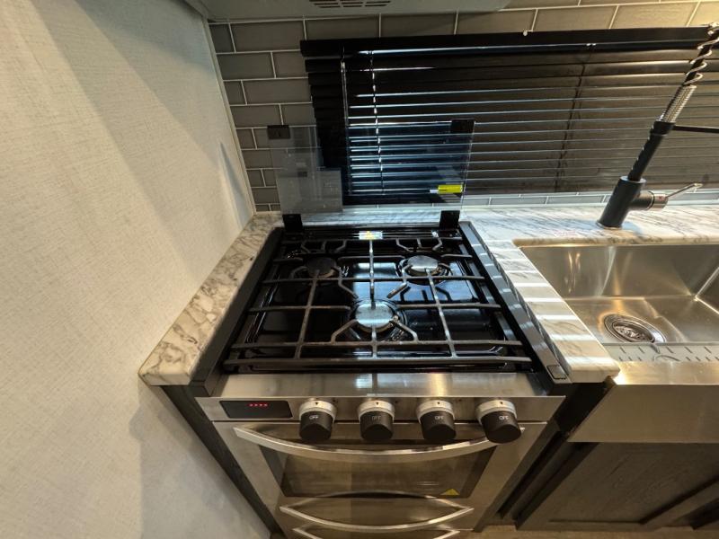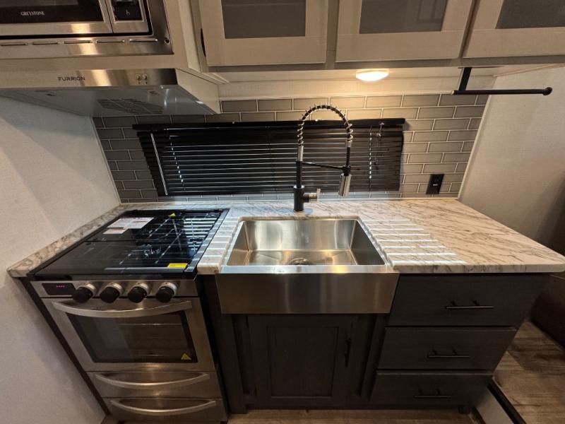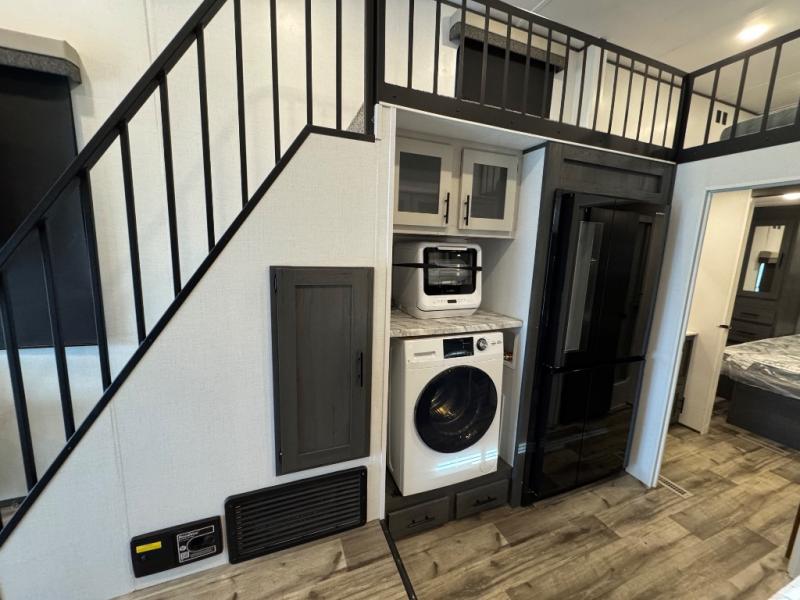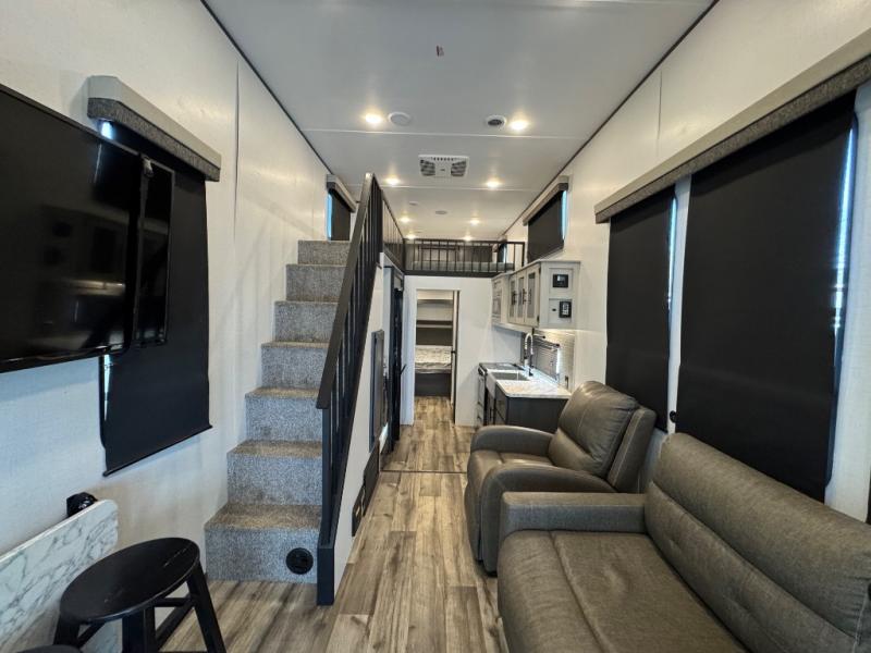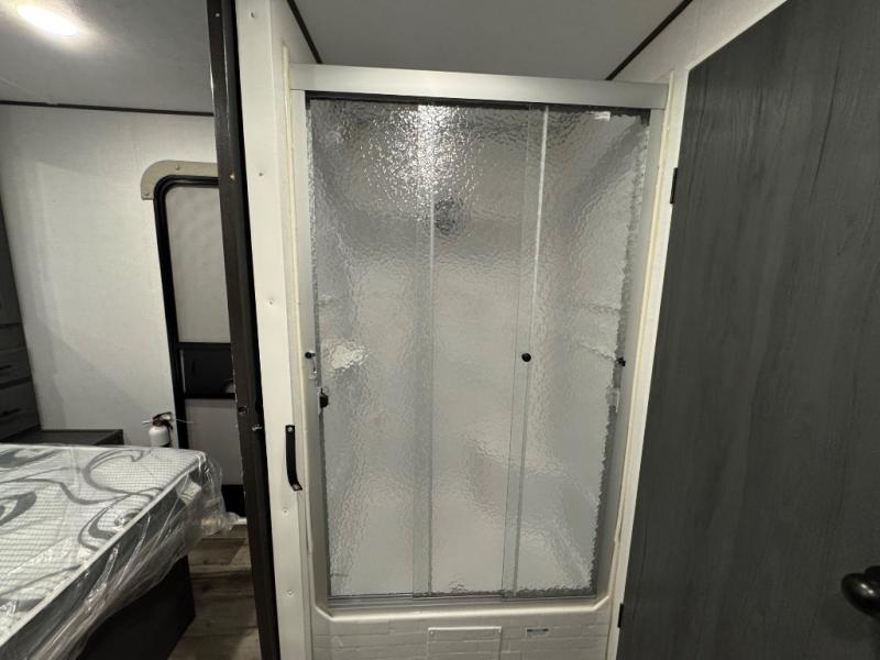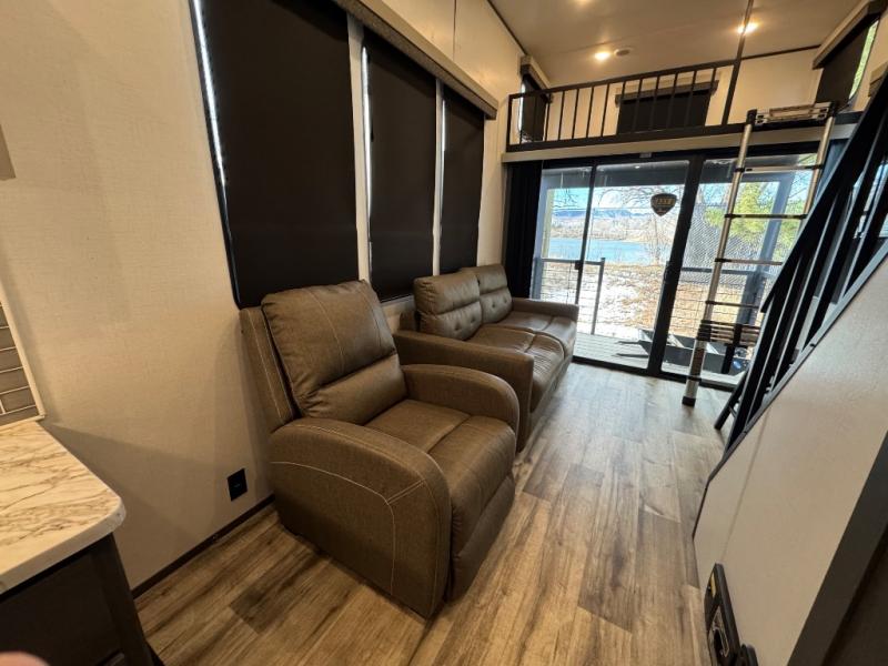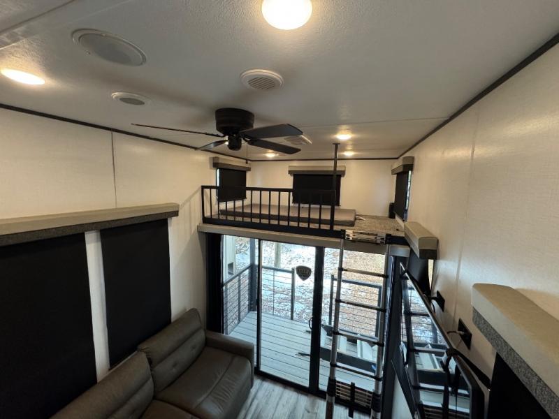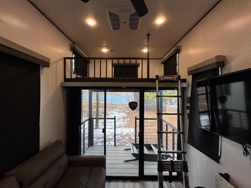 You'll love extended stays in this loft model! Not only is there a loft above the front bedroom, but there is a second loft above the rear covered porch. This is also where you'll find one of the dual entry doors for convenience. The main living area includes a sofa, lounge chair, plus a table with two chairs so you can relax, dine, and play a board game in the evenings. A fully equipped kitchen will let you make meals each day, and the walk-thru bath onboard means you won't have to use the camp's facilities!