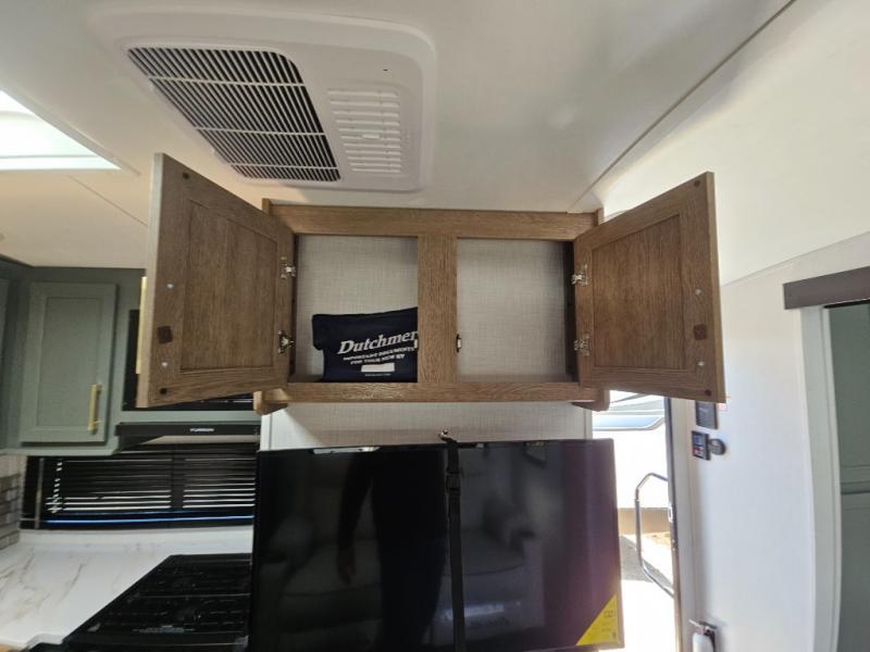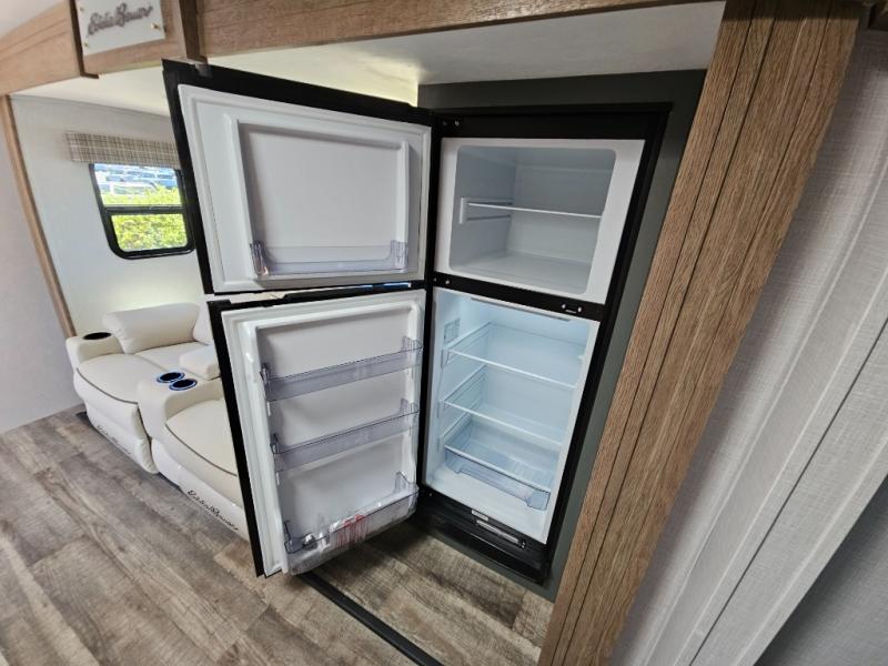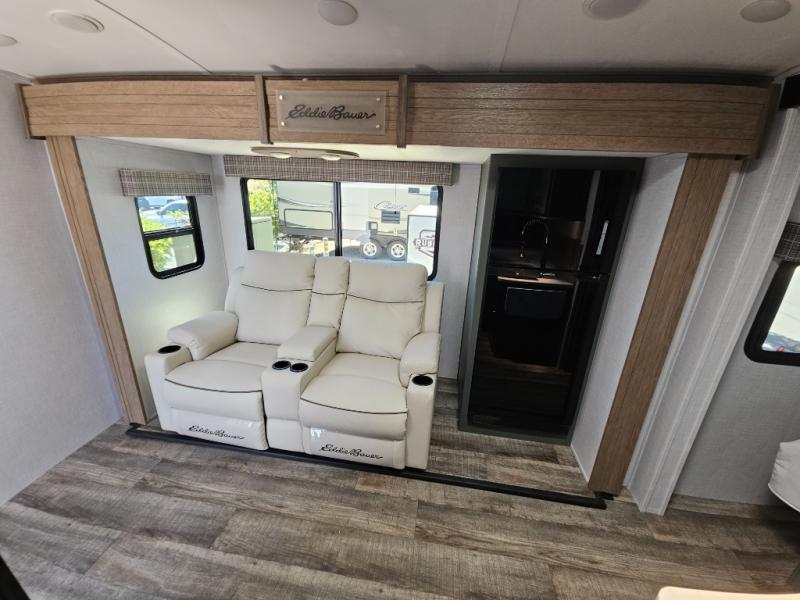 Each Eddie Bauer fifth wheel and travel trailer by Dutchmen RV lets you adventure the great outdoors in style! The Journey Package includes a heated and enclosed underbelly to help extend your camping season, a back up camera for easier parking, and a tankless water heater which will come in handy if you're camping with a larger group of friends. The HyperDeck floor construction is ultra durable and the premium entry steps means you can safety come and go as you please. Some of the interior comforts you'll enjoy are the one-piece seamless countertops, cozy living room fireplace, convenient under bed storage, and the large farm style sink for easy clean up. Each Eddie Bauer also includes the Spirit I Package with inverter prep, roof panel prep, and side panel prep that provide off-grid capabilities!