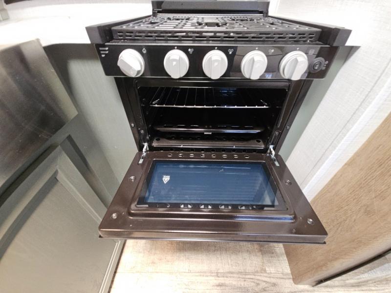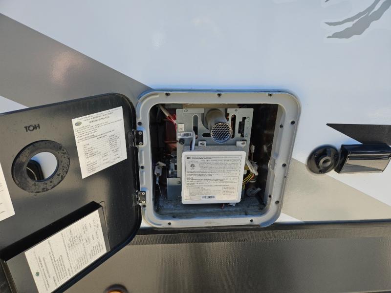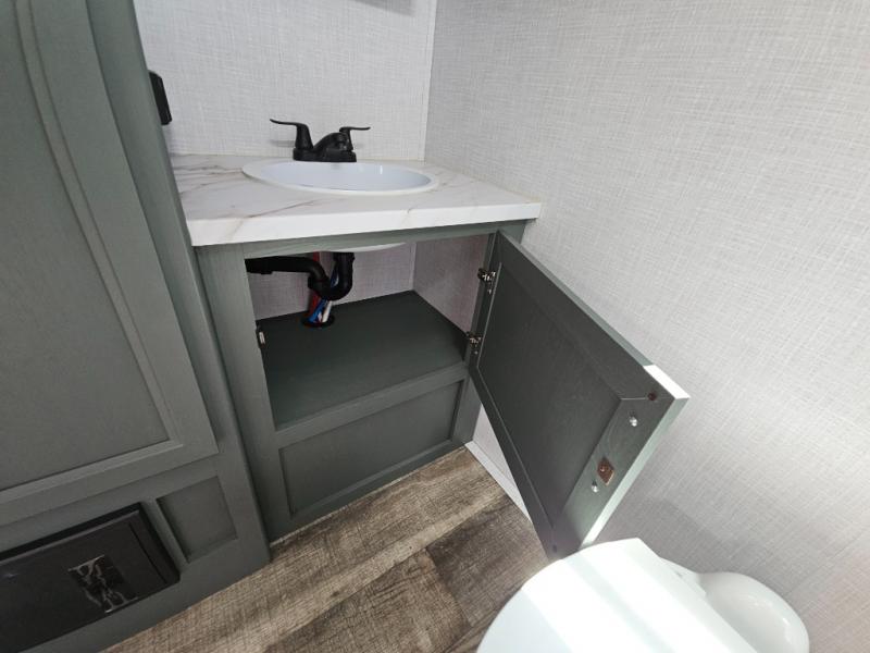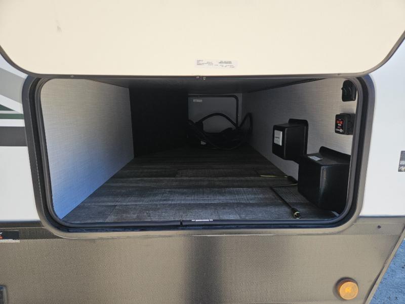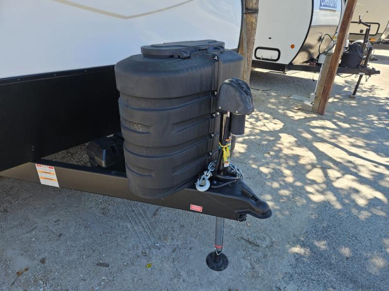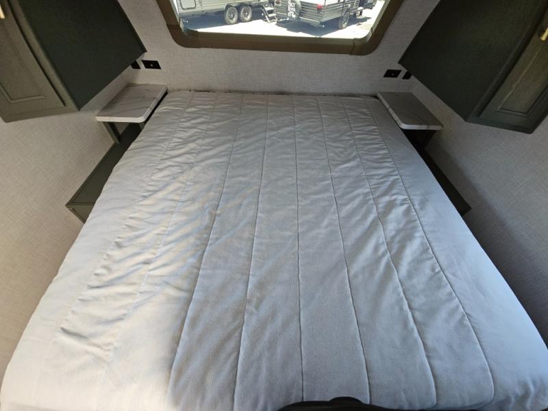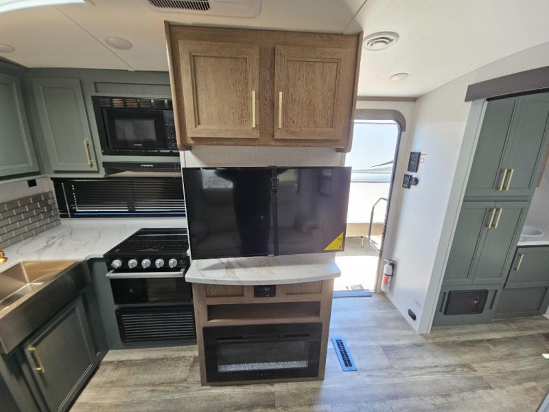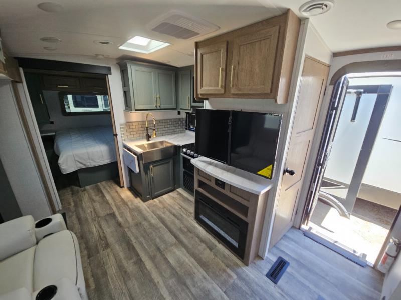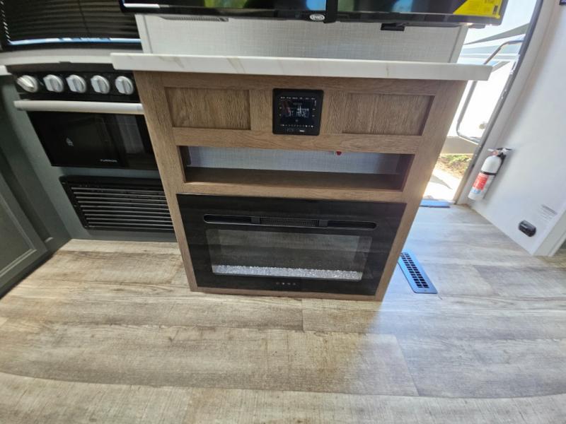 This couple's trailer is perfect for all your outdoor excursion. Once you arrive at the campground, you can set up the 15' power awning with LED lights, then start lunch on the four burner stove with a glass range cover. There is also a countertop extension in the kitchen, along with a microwave oven, farm style sink, and entryway pantry. You can get cozy on the sofa slide out across from the HD LED TV and fireplace, which will make your space feel more like home. The full rear bath lets you freshen up before bed, and the king bed in the front private bedroom will be calling your name after a day of exploring. There are also two bedroom closets to store your belongings, a bath linen closet, a kitchen overhead cabinet, plus an exterior pass-through for tons of storage space!