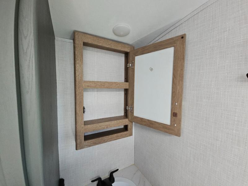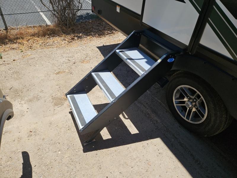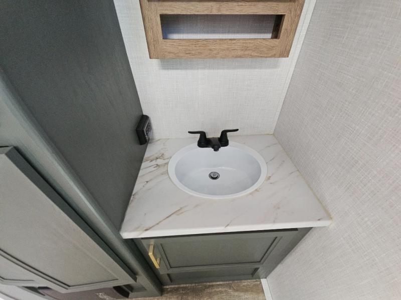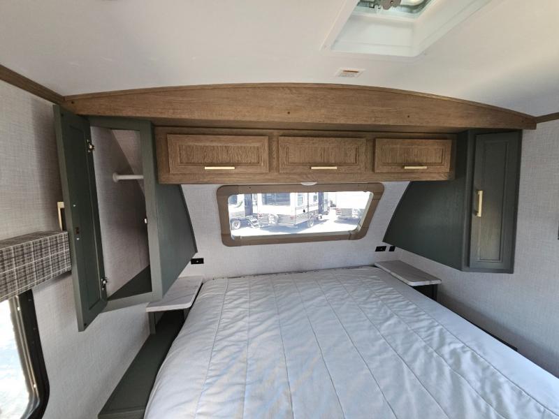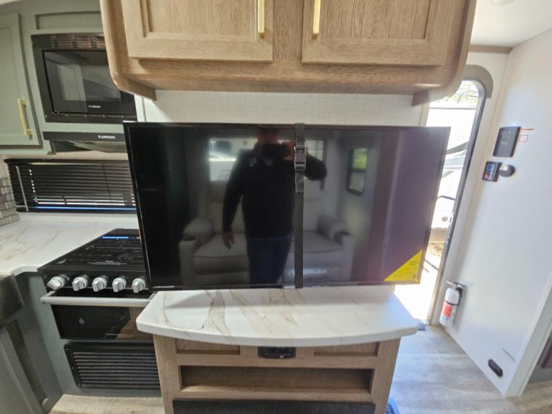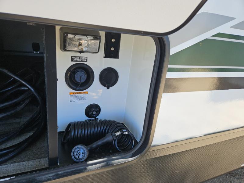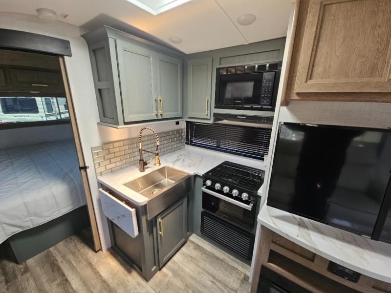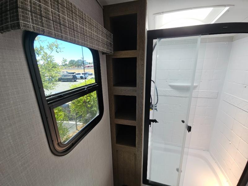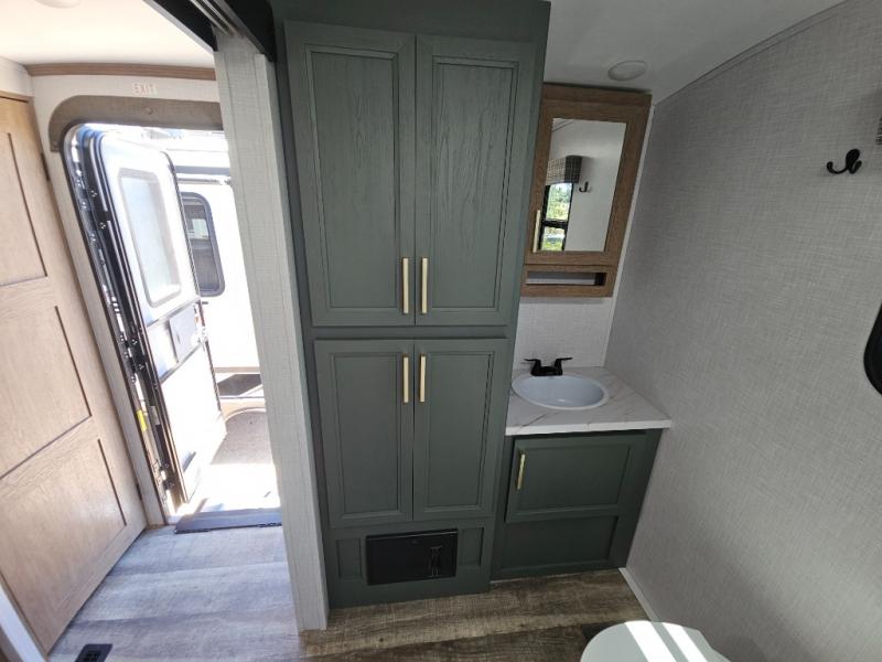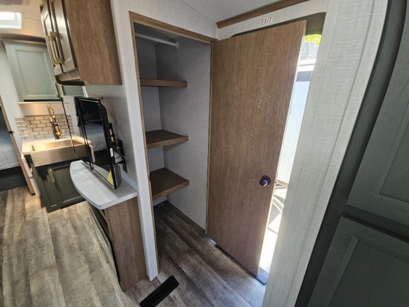 This couple's trailer is perfect for all your outdoor excursion. Once you arrive at the campground, you can set up the 15' power awning with LED lights, then start lunch on the four burner stove with a glass range cover. There is also a countertop extension in the kitchen, along with a microwave oven, farm style sink, and entryway pantry. You can get cozy on the sofa slide out across from the HD LED TV and fireplace, which will make your space feel more like home. The full rear bath lets you freshen up before bed, and the king bed in the front private bedroom will be calling your name after a day of exploring. There are also two bedroom closets to store your belongings, a bath linen closet, a kitchen overhead cabinet, plus an exterior pass-through for tons of storage space!