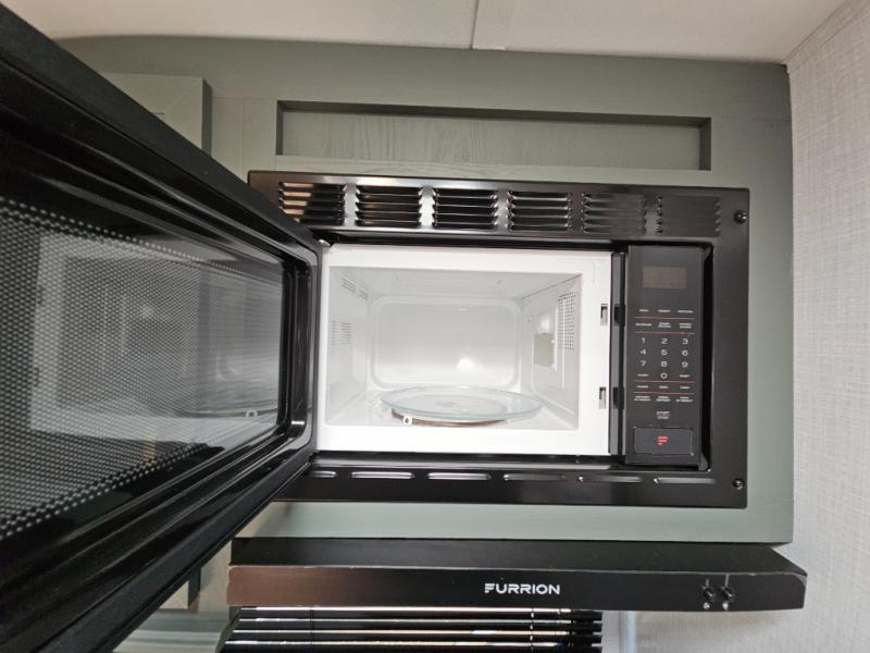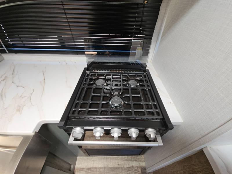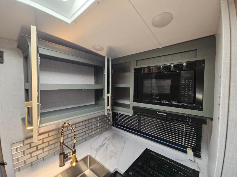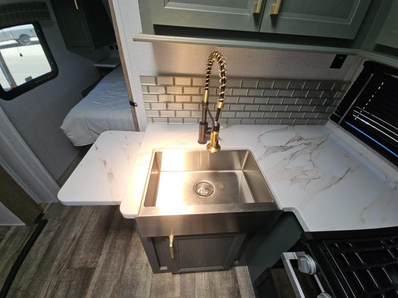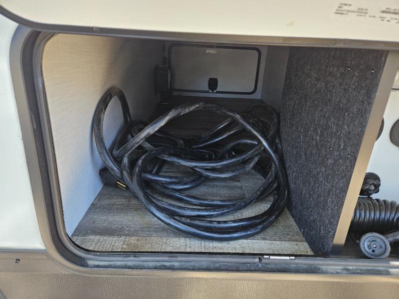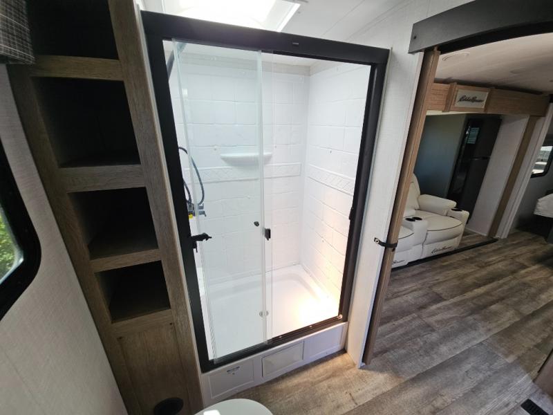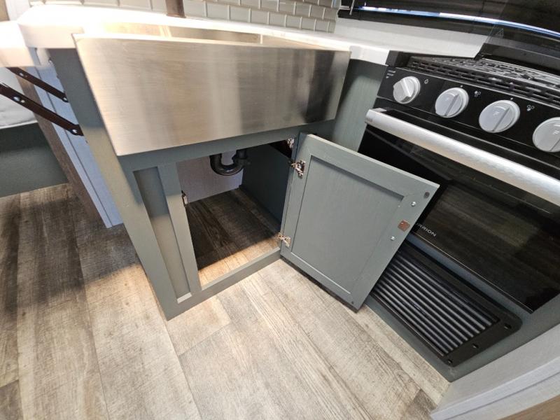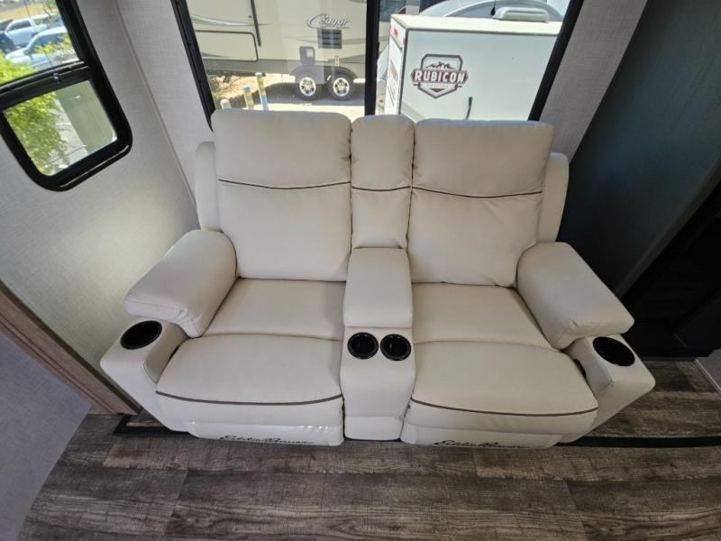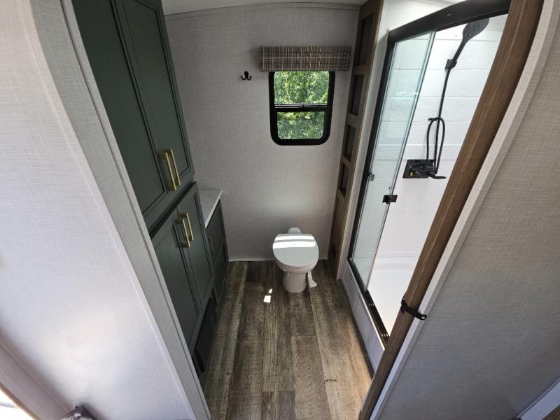 This couple's trailer is perfect for all your outdoor excursion. Once you arrive at the campground, you can set up the 15' power awning with LED lights, then start lunch on the four burner stove with a glass range cover. There is also a countertop extension in the kitchen, along with a microwave oven, farm style sink, and entryway pantry. You can get cozy on the sofa slide out across from the HD LED TV and fireplace, which will make your space feel more like home. The full rear bath lets you freshen up before bed, and the king bed in the front private bedroom will be calling your name after a day of exploring. There are also two bedroom closets to store your belongings, a bath linen closet, a kitchen overhead cabinet, plus an exterior pass-through for tons of storage space!