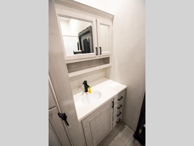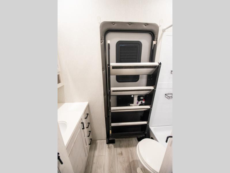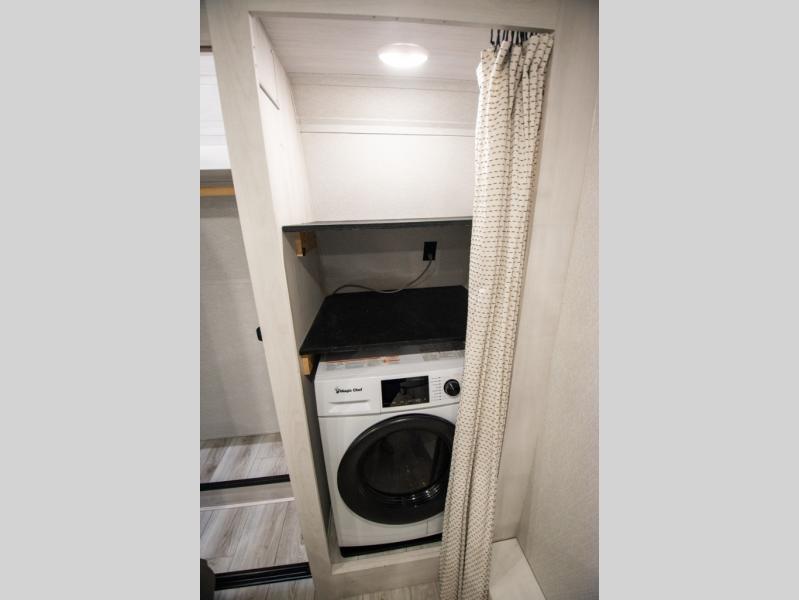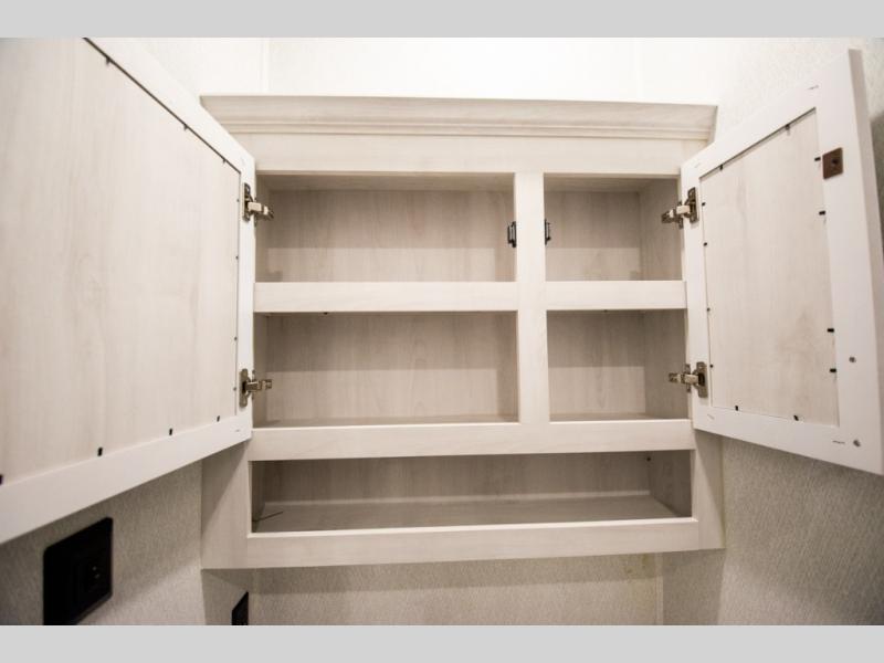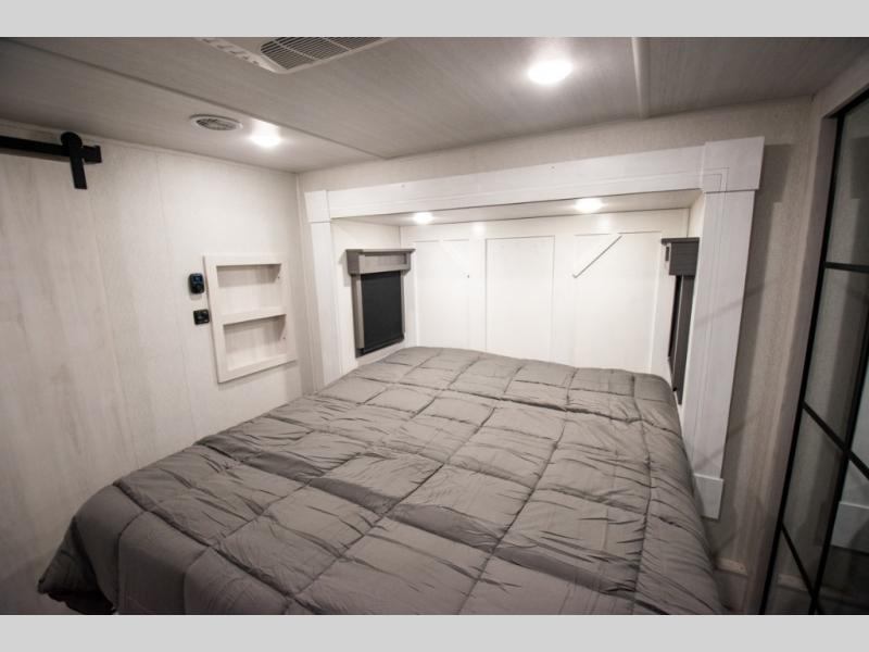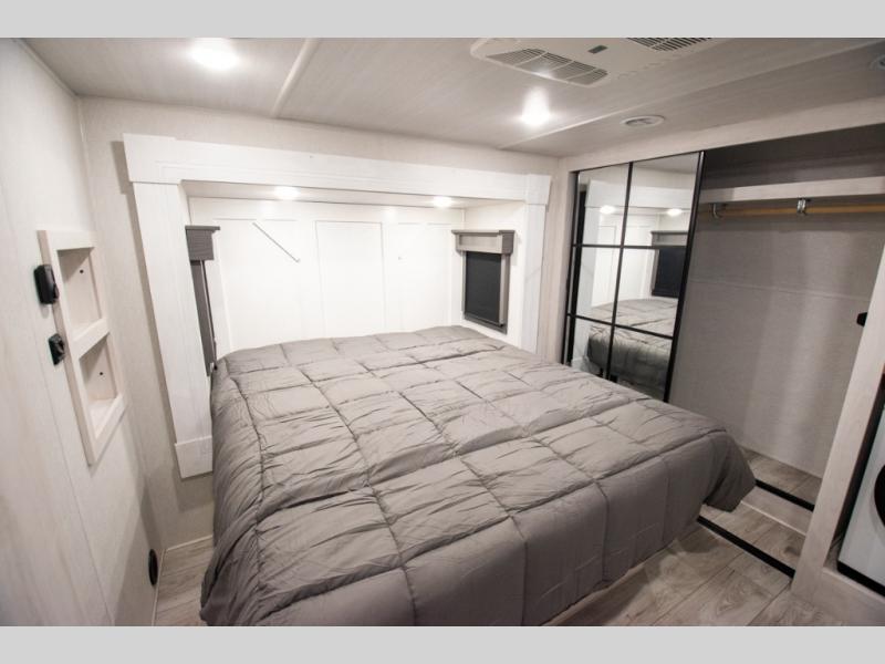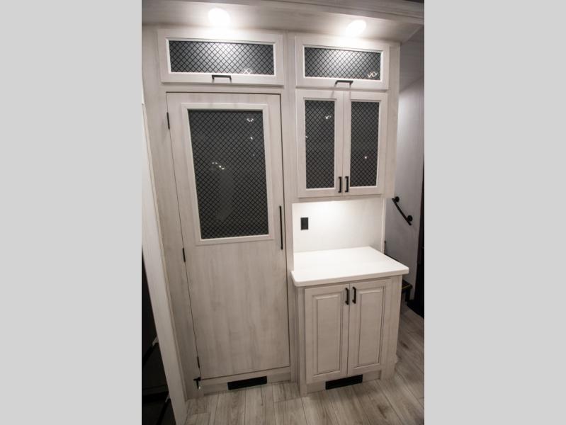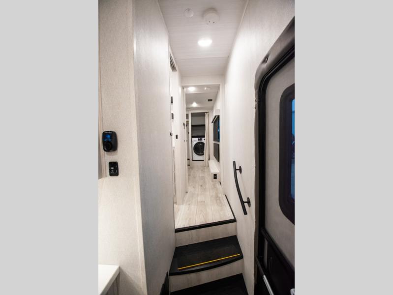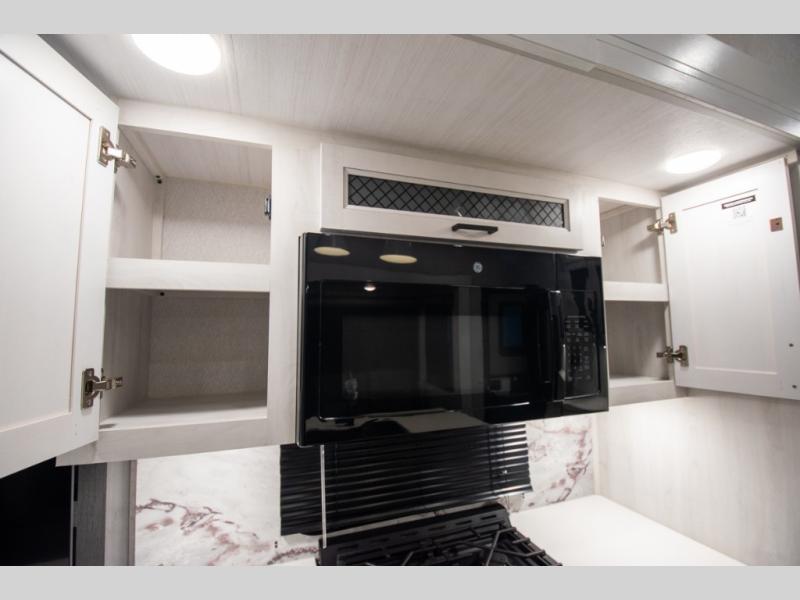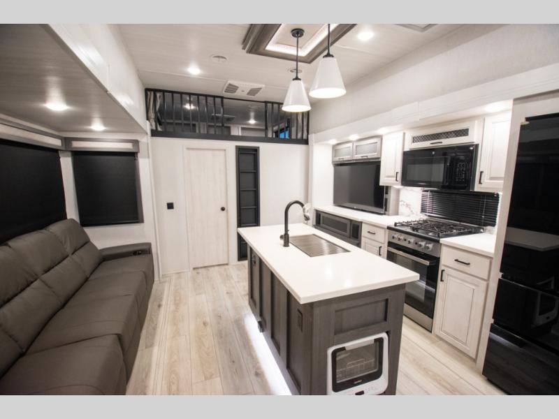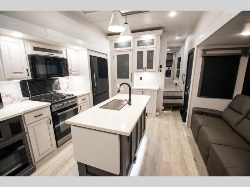 If you're looking for a luxury fifth wheel with more space for friends and family, you've found it in this Ahara! The main entry door opens up to the living area with dual opposing slides, a 50" LED TV with a fireplace, plus a full kitchen with residential appliances, a hutch, and even a pantry for dry goods and snacks. Everyone can meet here in the evenings to dine at the free-standing dinette with a storage ottoman or relax on the theater seating. You'll love the rear master suite with its king bed slide out, drawers under the bed, and full rear bath with the unique rear second entry door. And check out the Ahara Sky Suite loft above this room for even more sleeping or storage space! Your guests will find the front private bedroom to be accommodating since it includes a king bed slide out, drawers under the bed, pus a large wardrobe to keep clothes tidy. There is also a closet with washer and dryer pre. Who knows, you may just choose this bedroom for your own!