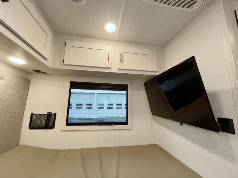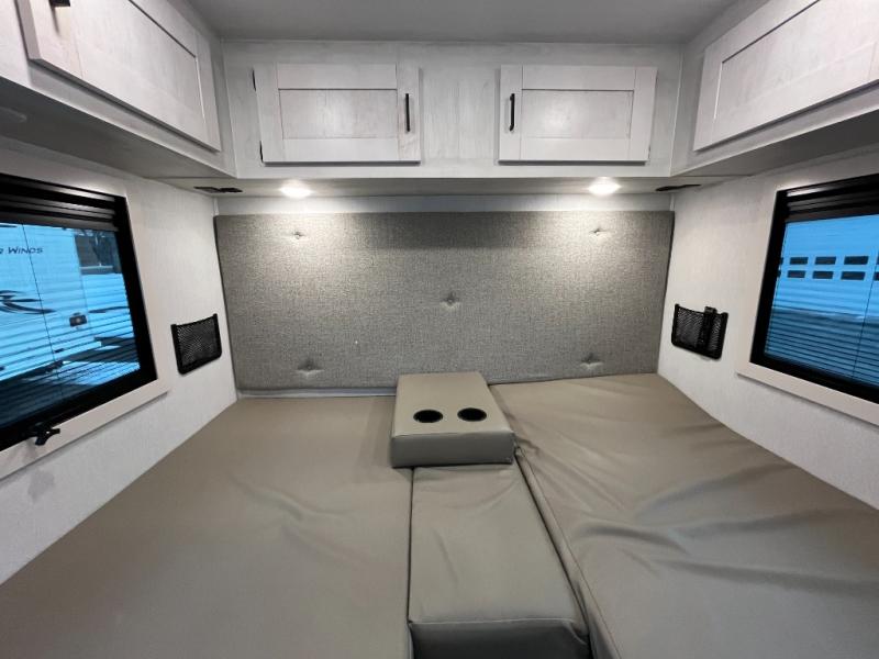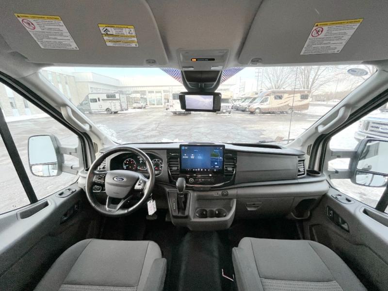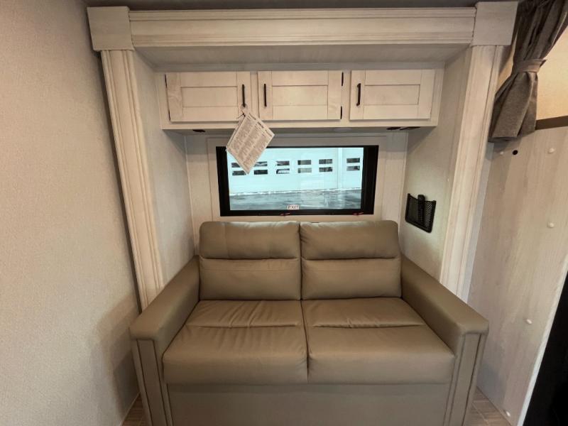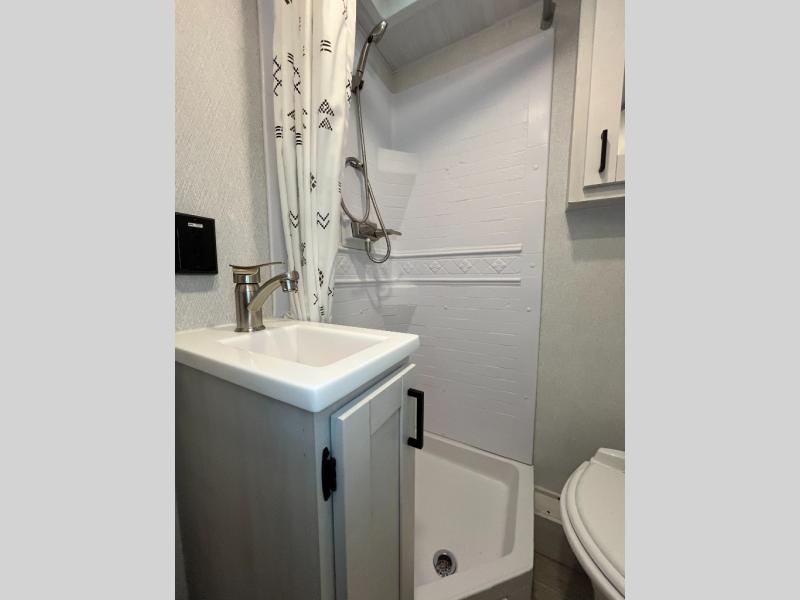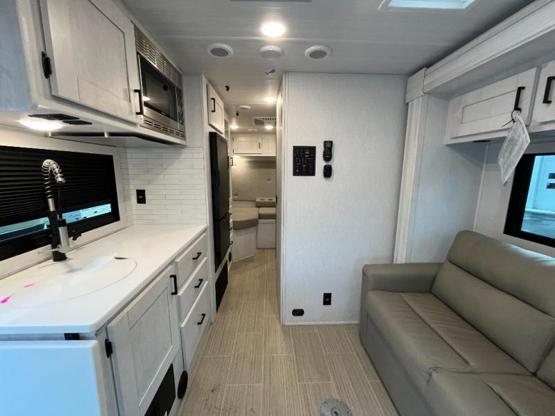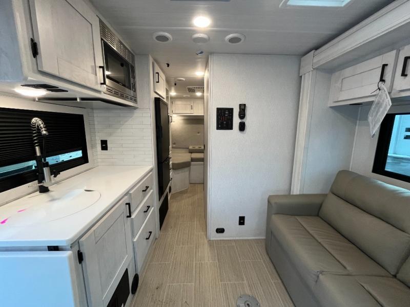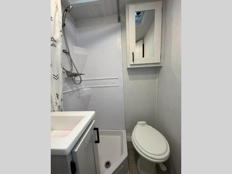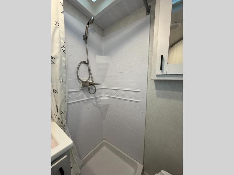 Whether you are traveling to your favorite campground or across the country, you are going to love this motorhome. You will have versatility in this coach to travel with a friend or your sweetheart with two twin beds that can easily convert to a king bed if you like. Each bed is 36" x 73" with a nightstand between and overhead storage along both sides and across the rear of the unit providing plenty of space for your things. There is also a wardrobe off the foot of the twin that is on the curbside. For relaxing and dining a slide out sofa with removeable table, and more overhead storage here. The kitchen is opposite the slide on the door side and features a round hidden sink with solid surface cover for added prep space, a 12-volt refrigerator for your perishables, and a microwave oven and induction cooktop for easy meals as you travel. When you want to get cleaned up, a bath with an angled shower, toilet, and lav sink, plus medicine cabinet for your toothbrush and razor. The doors both open out so you can actually create a more open space when in the bathroom making it the width of the unit.