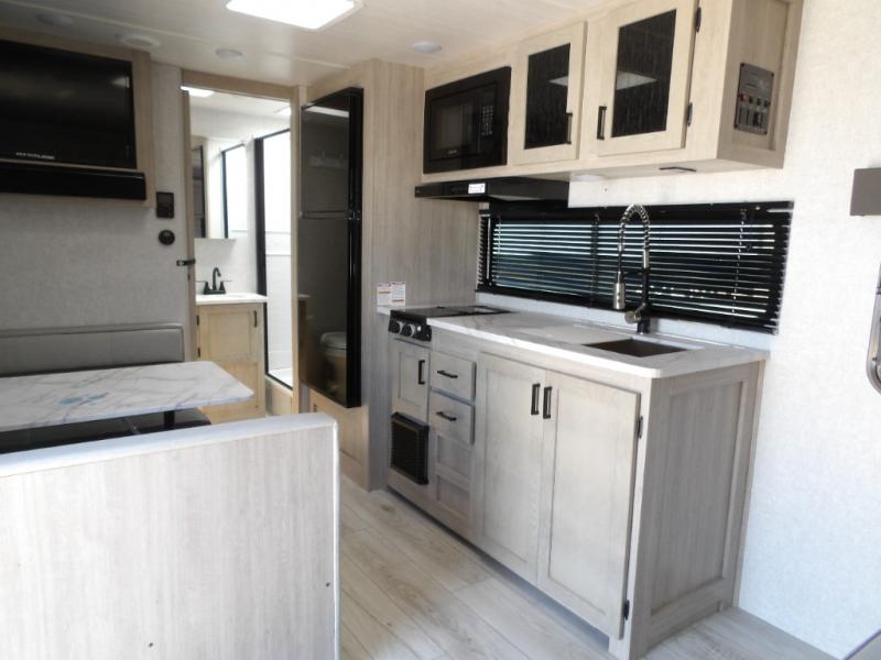 Each Alta travel trailer or toy hauler by EAST TO WEST is constructed with a 5" vacuum bonded roof, an enclosed and heated underbelly, and diamond plate front rock guard for added protection. Outside, you'll find marine-grade exterior speakers, a universal docking station, and back-up camera prep that can be added to make maneuvering in and out of campgrounds easier than ever. Inside, there are 4k interior LED lights, solid pressed membrane countertops, black roller shades, and many more interior comforts you are sure to love.