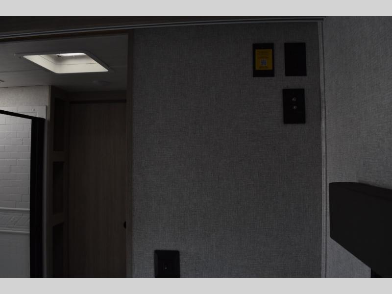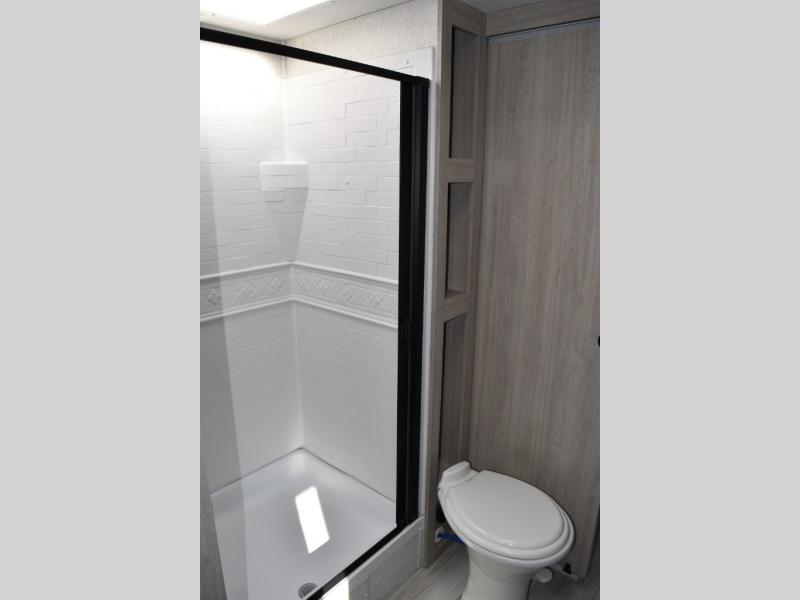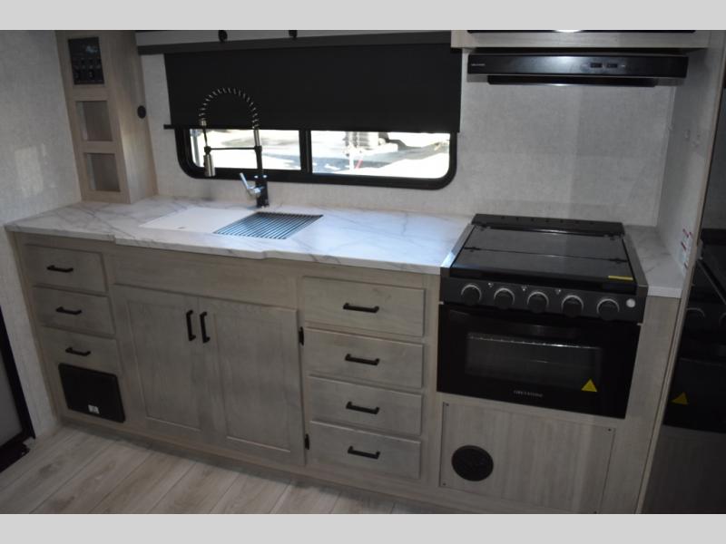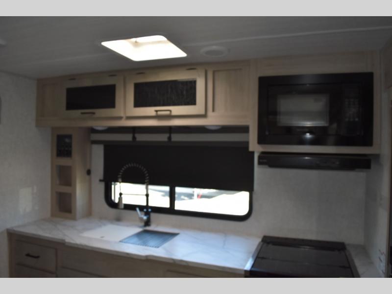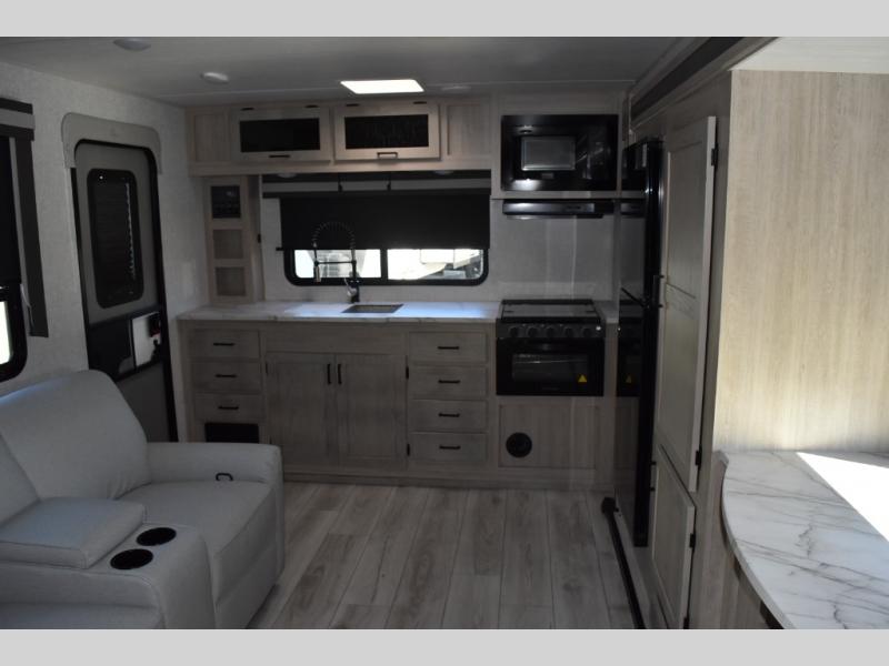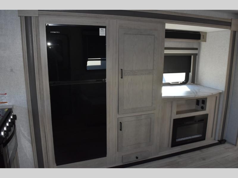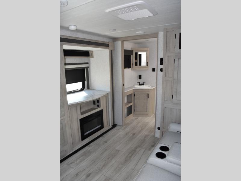 You're going to love this rear kitchen travel trailer with dual entry doors and a king bed in the front bedroom! The tri-fold sofa can be replaced by optional theater seats, plus there is a telescoping 40" TV with a fireplace for a more at-home feel. The walk-through bath will be easy for everyone to access, and there is a shower skylight here to let more natural light in. This model is also pet-friendly thanks to the pet dish under the refrigerator and the outside spray port to hose them off after a day in the river!