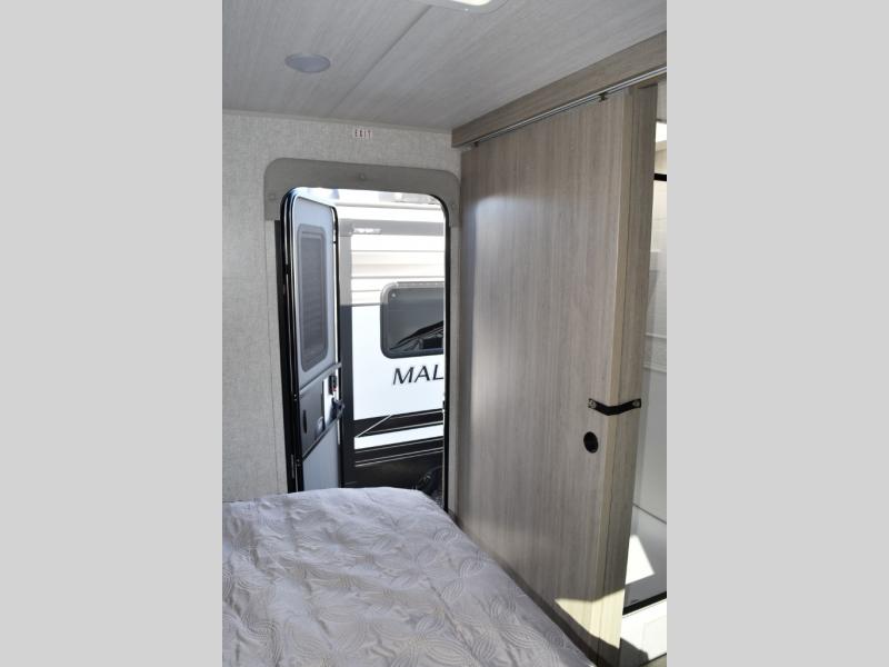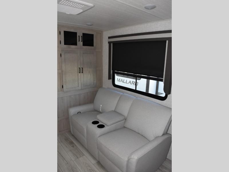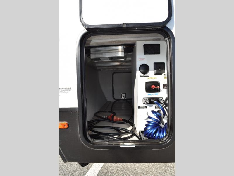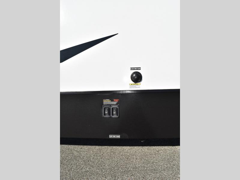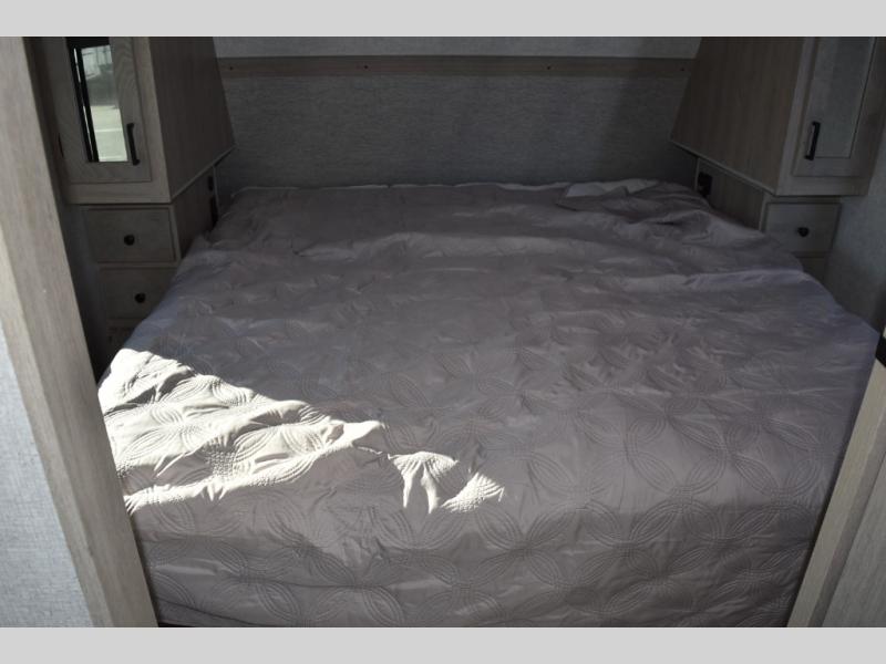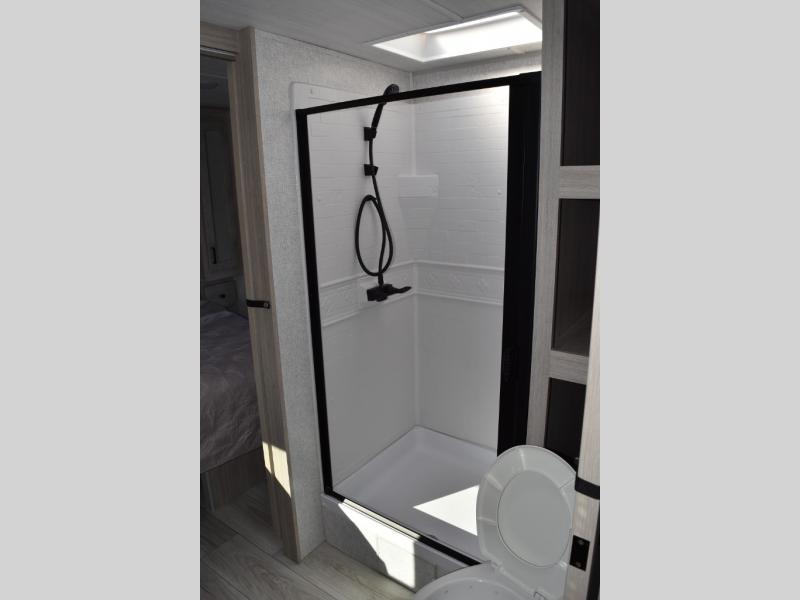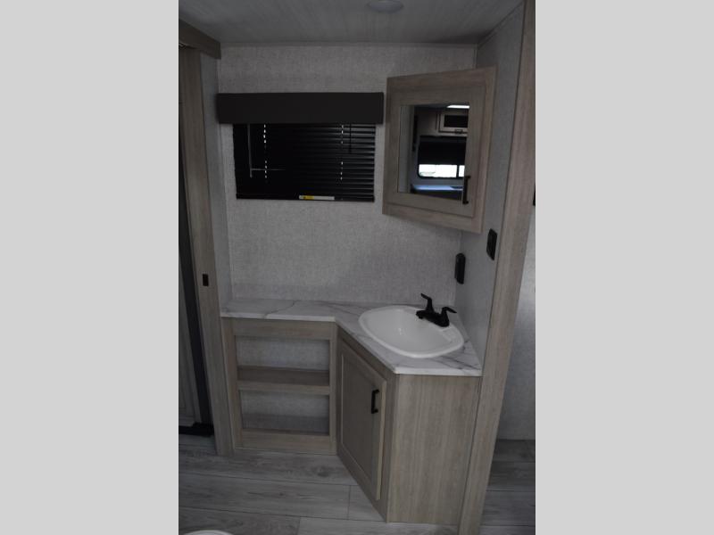 You're going to love this rear kitchen travel trailer with dual entry doors and a king bed in the front bedroom! The tri-fold sofa can be replaced by optional theater seats, plus there is a telescoping 40" TV with a fireplace for a more at-home feel. The walk-through bath will be easy for everyone to access, and there is a shower skylight here to let more natural light in. This model is also pet-friendly thanks to the pet dish under the refrigerator and the outside spray port to hose them off after a day in the river!