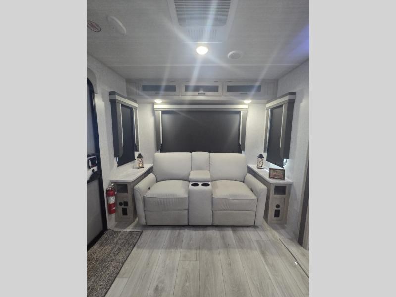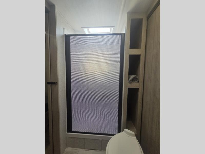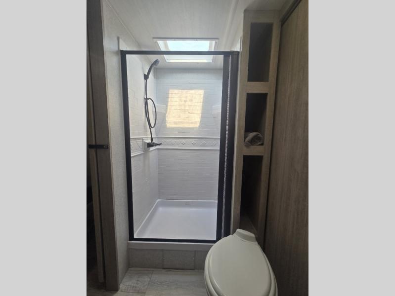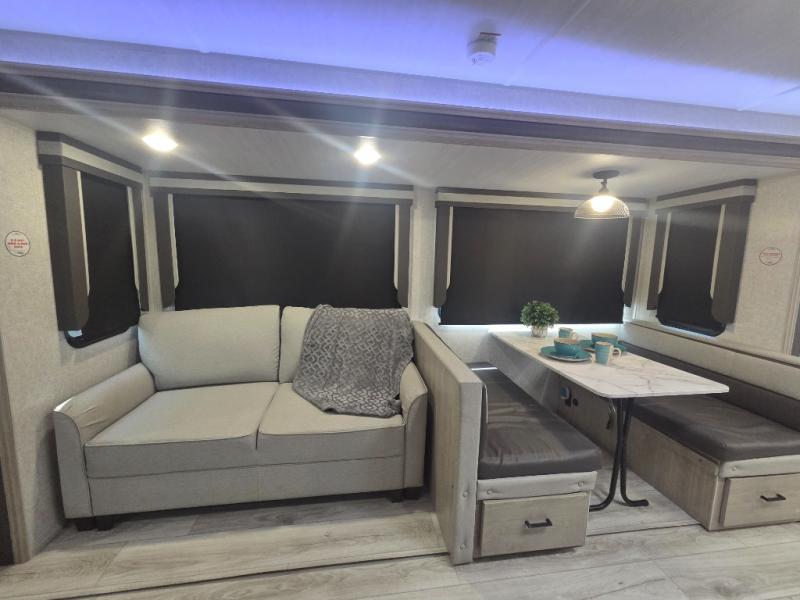 You'll feel right at home in this rear living travel trailer that includes theater seats and a front master bedroom with a king bed. The walk-through bath includes a medicine cabinet and a shower skylight to let natural light in, and the bedroom includes its own exterior entry door for convenience. When you're not relaxing outdoors under the 21' power awning with LED lights, you can play a game at the booth dinette or relax on the tri-fold sofa. This model also includes a pass-through storage for your larger camp gear and a universal docking station for easy access to your hookups.