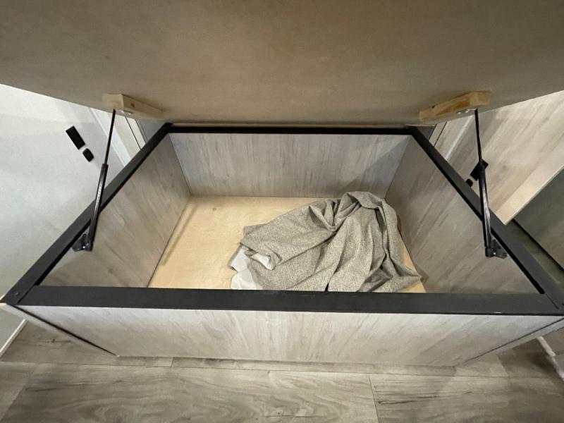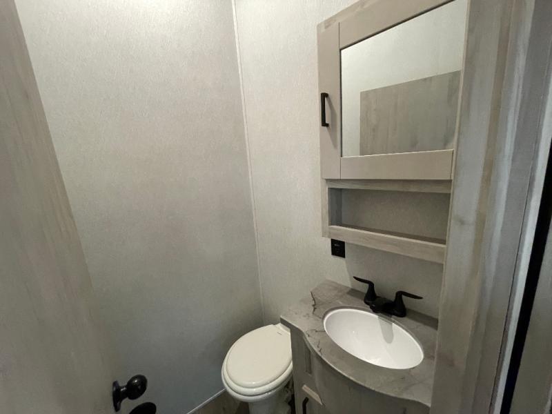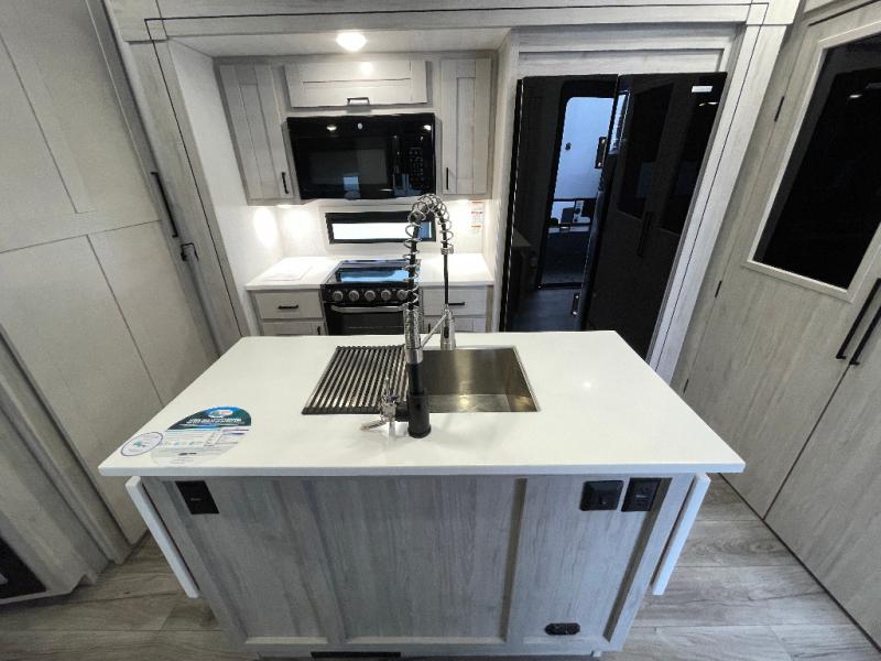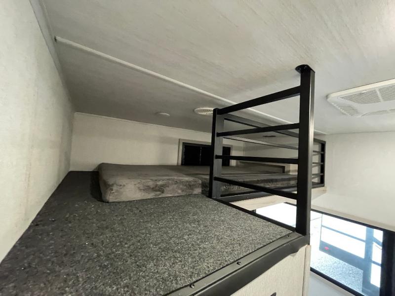One look at this fifth wheel and you'll be sold! There is a rear private bunkhouse suite with a half bath, a hide-a-bed sofa, plus loft storage/bed! You will have the front private bedroom with a king bed slide out all to yourselves, plus there is a full-length wardrobe, a dresser with TV prep, and bedside shelves for your things. The spacious full bath is close by the bedroom and you'll appreciate the linen closet for clean towels and the shower skylight for added natural light. Everyone will love to gather together in the main living area/kitchen that includes theater seating across from a 50" TV with a fireplace, a free-standing dinette, plus a kitchen island with countertop extensions. And have you checked out the storage found throughout this model; overhead cabinets, loft storage, bedroom storage, and an oversized pass-through compartment outside!