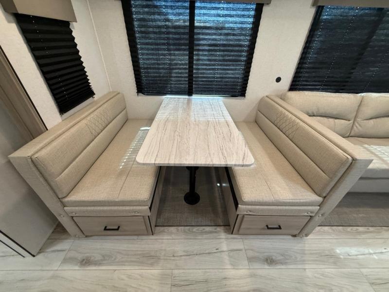 Looking for a private bunkhouse in your next trailer? Do you want a full bathroom with a radius shower? Are you searching for lots of storage? Well, look no further than this Della Terra! The rear private bunkhouse provides a space saving sliding door, two upper bunks and a lower queen bed. And there is a wardrobe so your family or friends will appreciate having their own privacy and storage. You will have your own walk-around king-size bed in the front bedroom with dual wardrobes. Everyone can meet in the middle of the trailer to enjoy the combined kitchen and living area complete with a large slide out including an oversized booth dinette and jack knife sofa, full kitchen amenities and an L-shaped counter. You might even like to add the optional outdoor kitchen for more choices when feeding the crew.